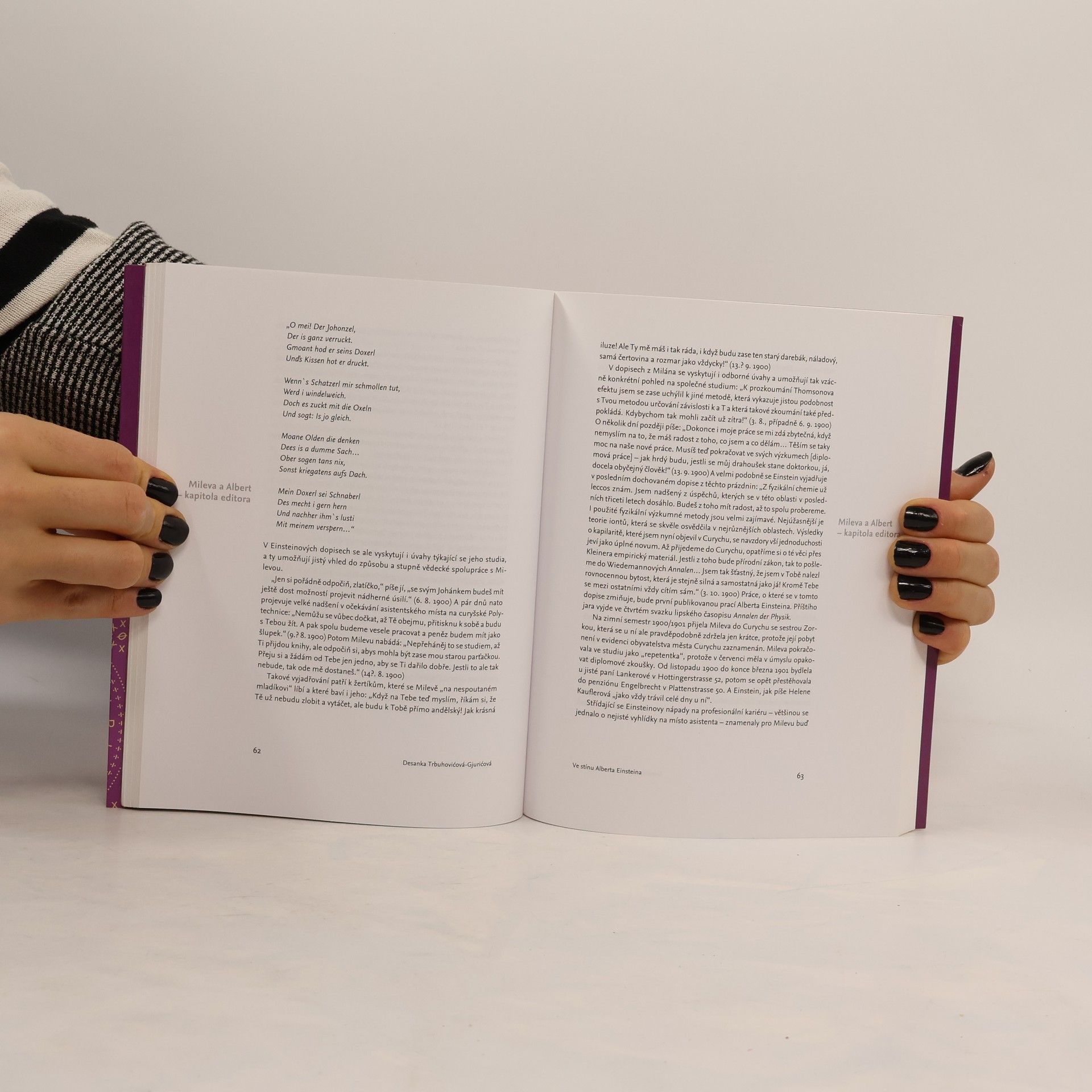 Autorka vzdává hold první ženě Alberta Einsteina, významné matematičce, která nejen žila s Einsteinem téměř čtvrt století, ale v době manželství byla i jeho významnou spolupracovnicí a měla podíl i na vzniku speciální teorie relativity v roce 1905. Kniha je členěna do kapitol, které chronologicky líčí celý život Milevy Einsteinové-Maričové od narození v rakousko-uherské Vojvodině roku 1875 až do její smrti ve švýcarském Curychu v roce 1948. Text doplňuje třicet sedm fotografií z rodinného archivu.