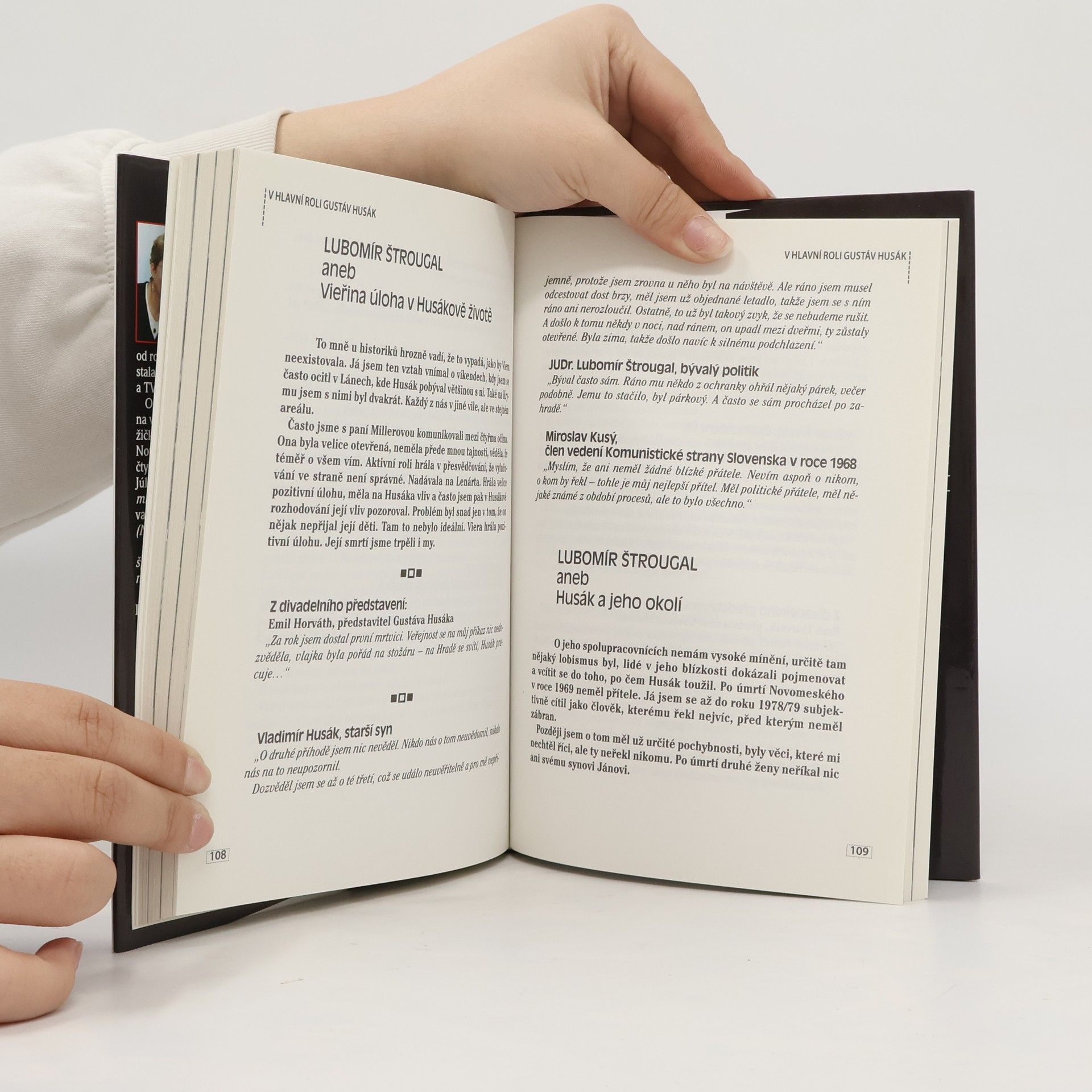 Skoro se nechce věřit, že o muži, který vládl této zemi z pozice nejvyššího stranického představitele a později i z pozice prezidenta republiky skoro dvecet let, nevyšla v České republice žádná monografie. Kniha "V hlavní roli Gustáv Husák" vychází z neobyčejně zajímavého dvouhodinového televizního dokumentu autorů Roberta Sedláčka a Michala Kubala a není v pravém slova smyslu jen politicko-historickou reminiscencí Husákovy osobnosti, ale spíše psychologickým portrétem muže, který to zpočátku možná myslel dobře, ale nakonec se stal tragickou postavou normalizačního období. Cesta od mladého a vzdělaného slovenského intelektuála ke stranickému dogmatikovi, který zcela podléhal Moskvě i jejím pražským přisluhovačům, je někdy až nepochopitelná. v knize vzpomíná na Gustáva Husáka i jeho osobní život celá plejáda osobností politického i kulturního života, počínaje Štrougalem, přes Gorbačova až po jeho přátele ze slovenských uměleckých kruhů.