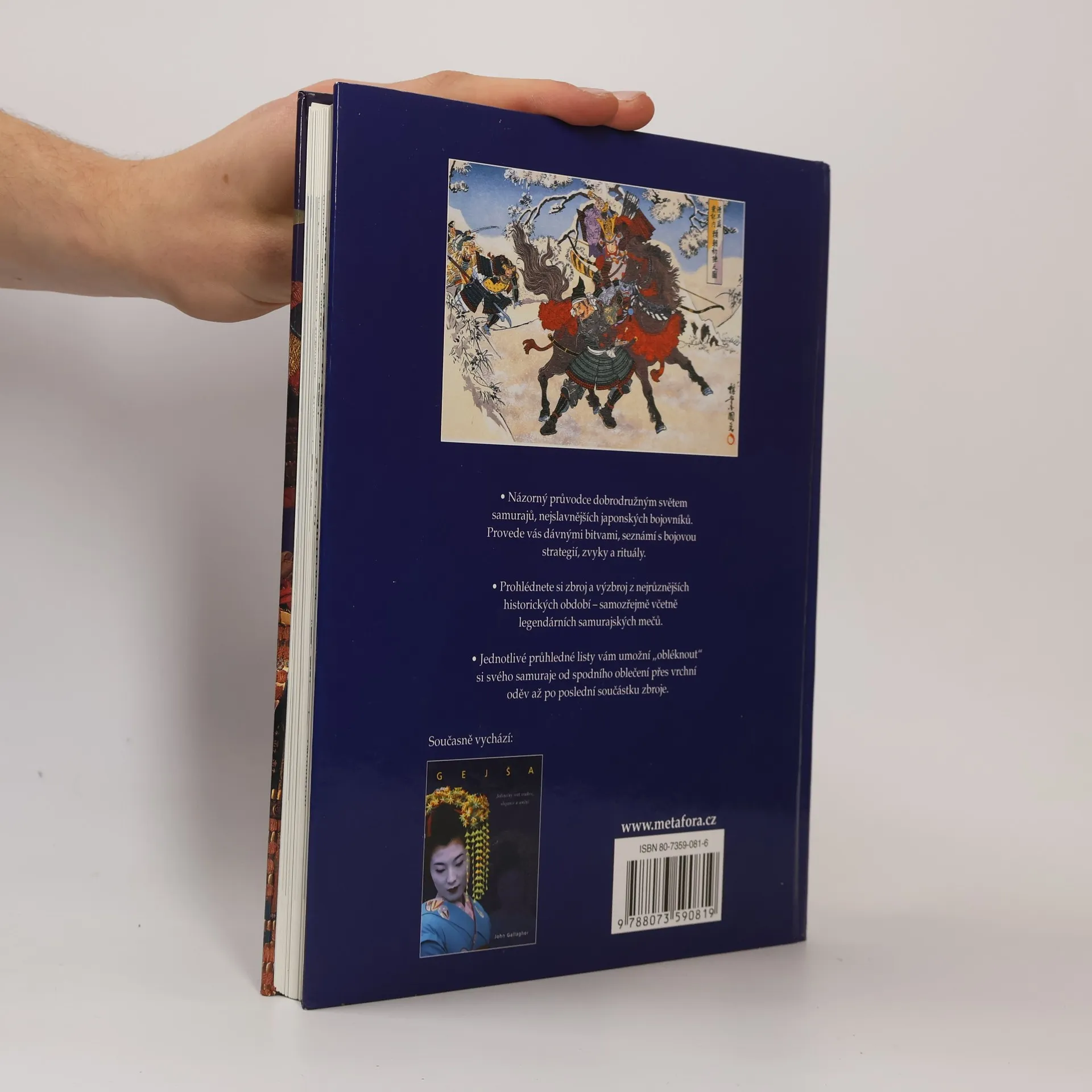 Názorný průvodce dobrodružným světem samurajů, nejslavnějších japonských bojovníků, který vás provede dávnými bitvami, seznámí s bojovou strategií, zvyky a rituály. Prohlédnete si zbroj a výzbroj z nejrůznějších historických období - samozřejmě včetně legendárních samurajských mečů. Dozvíte se, čím tehdejší válečníci žili, čemu věřili, jak přemýšleli a co si oblékali. Jednotlivé průhledné listy vám umožní „obléknout“ si svého samuraje od spodního oblečení přes vrchní oděv až po poslední součástku zbroje. Překlad Blahoslav Mikolášek.