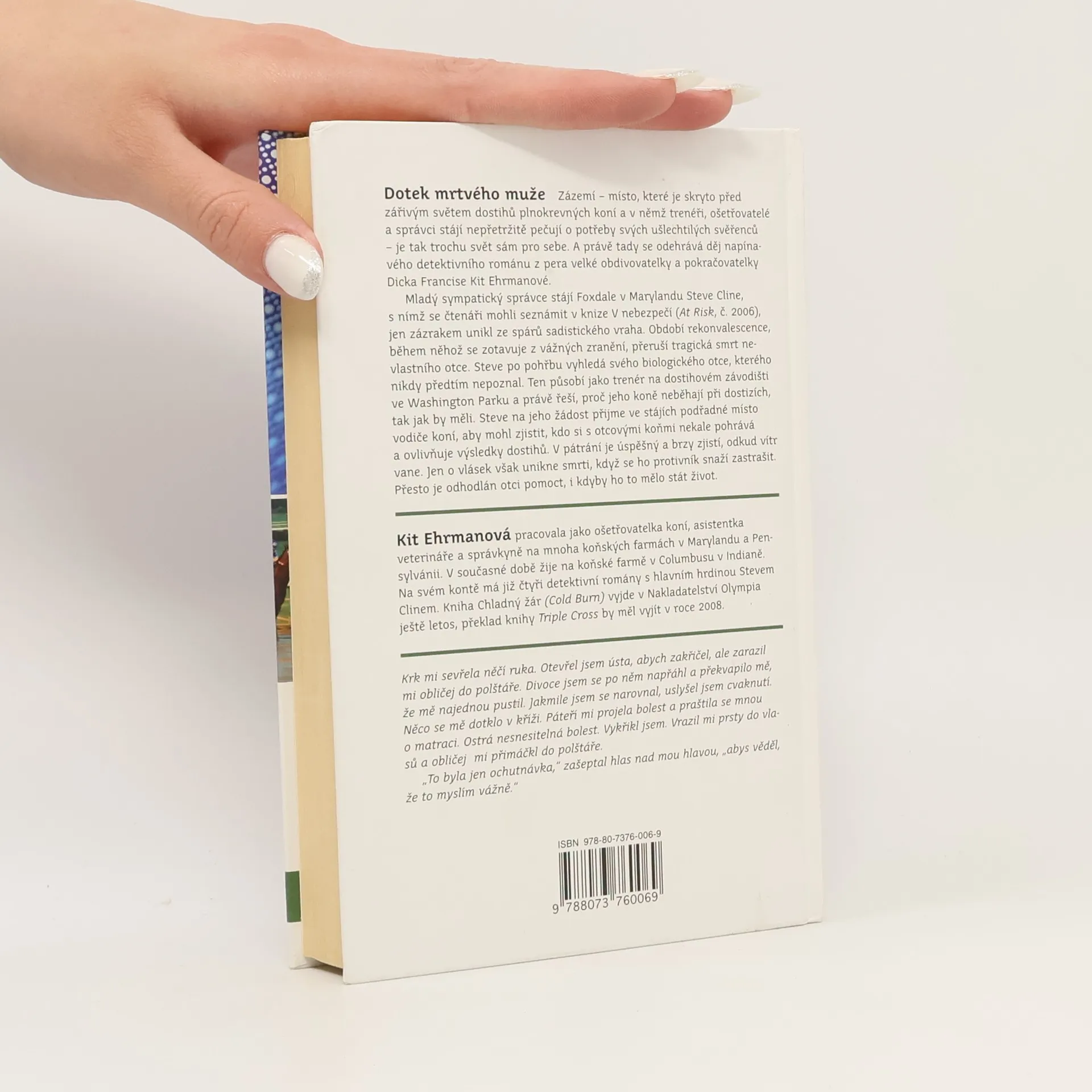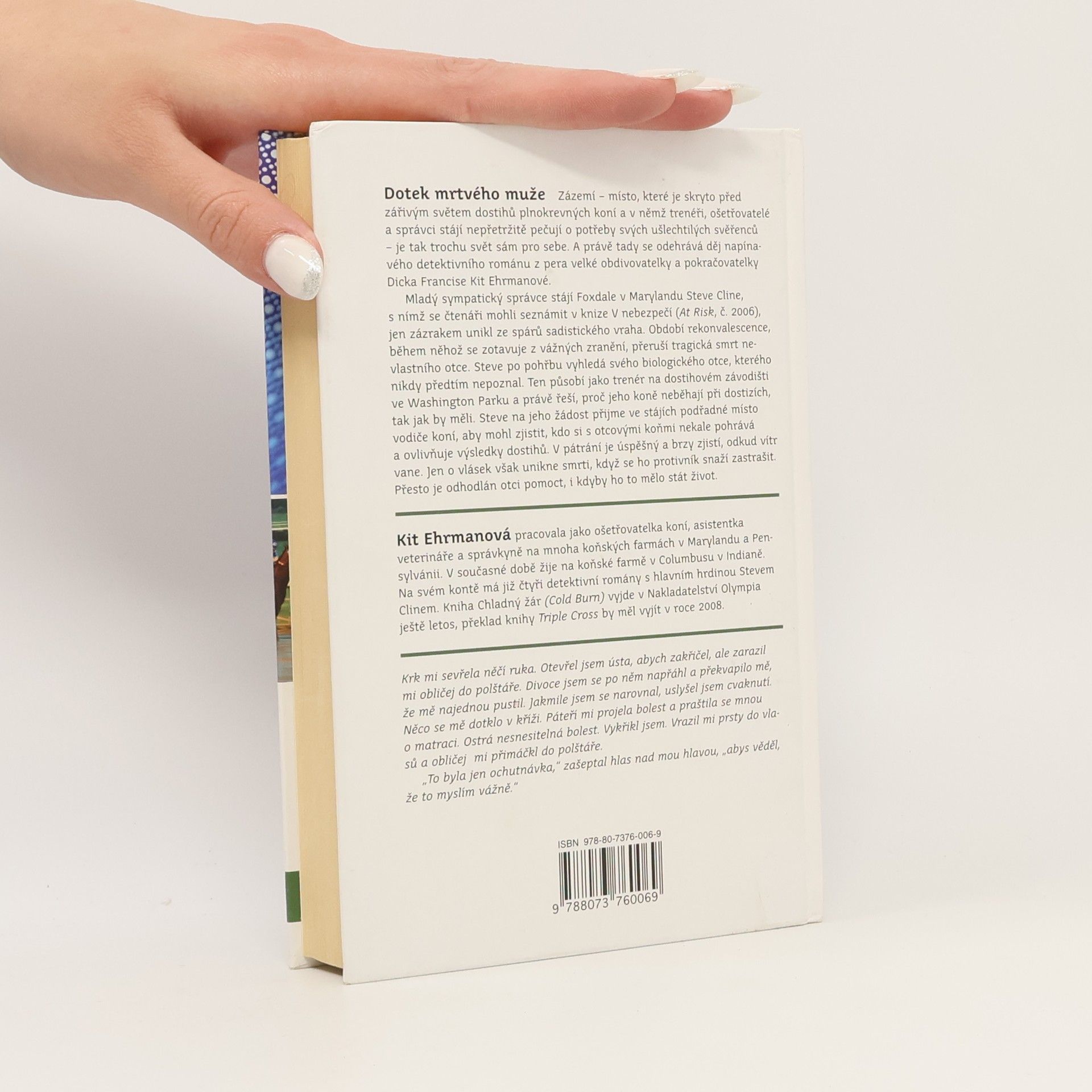 Mladý ošetřovatel koní Steve Cline, který se stal tak silným a sympatickým hrdinou v předešlé autorčině knize V nebezpečí, vyhledá otce, kterého nikdy nepoznal. Ten je trenérem plnokrevných koní na dostihovém závodišti v Marylandu. Steve se od otce dozví, že si někdo nekale pohrává s jeho koňmi, aby ovlivnil výsledky dostihů, a rozhodne se mu pomoci. Přijme v jeho stájích podřadné místo vodiče, aby mohl nerušeně přijít věci na kloub. Jeho tajná role mu navíc umožní vyzkoušet si na vlastní kůži život v zázemí a dostat se blíže k těm úžasným a nádherným zvířatům, která mají lepší povahu a srdce než ti dvounozí blázni, kteří je považují za pouhé zboží. Ehrmanová, která má pracovní zkušenosti ze sportovních stájí i hřebčínů, zaujala dalším dobrodružným příběhem, kterým vstupuje do tohoto odvážného a odhodlaného prostředí. Tento příběh začíná tam, kde Dick Francis skončil. Ve stáji.