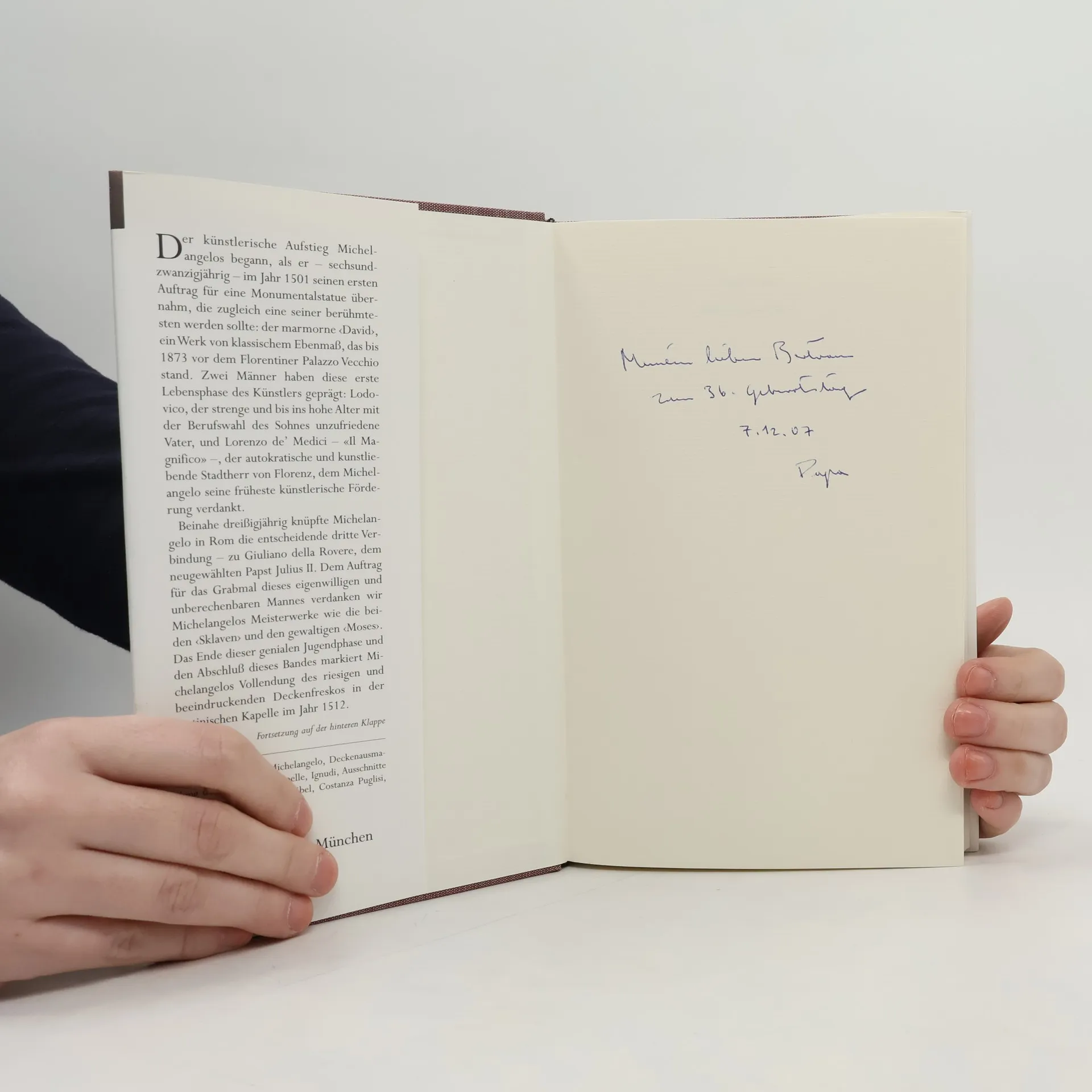 Der künstlerische Aufstieg Michelangelos begann, als er 26jährig seinen ersten Auftrag für eine Monumentalstatue übernahm, die zugleich eine seiner berühmtesten werden sollte: der marmorne David, ein Meisterwerk von klassischem Ebenmaß, das bis 1873 vor dem Florentiner Palazzo Vecchio stand. Zwei Männer haben diese erste Lebensphase geprägt: Lodovico, der strenge Vater, und Lorenzo de' Medici - „il magnifico“ -, der autokratische und kunstliebende Stadtherr von Florenz. Beinahe 30jährig knüpfte Michelangelo die entscheidende dritte Verbindung - zu dem neugewählten Julius II. Dem Auftrag für das Grabmal dieses eigenwilligen und unberechenbaren Papstes verdanken wir Meisterwerke wie die 'Sklaven' und den 'Moses'. Am Ende dieser genialen Jugendphase steht Michelangelos Vollendung der riesigen Deckenfresken in der Sixtinischen Kapelle im Jahr 1512. Gestützt auf zahlreiche, weitgehend noch zu Lebzeiten des Künstlers entstandene Dokumente entwirft James Beck eine sehr dichte Biographie der frühen Jahre. Dabei scheut er sich nicht, neben den künstlerischen auch die prägenden persönlichen Einflüsse, Begegnungen, Gedanken und Empfindungen zu benennen und zu einem überraschend frischen Lebensbild zusammenzufügen.