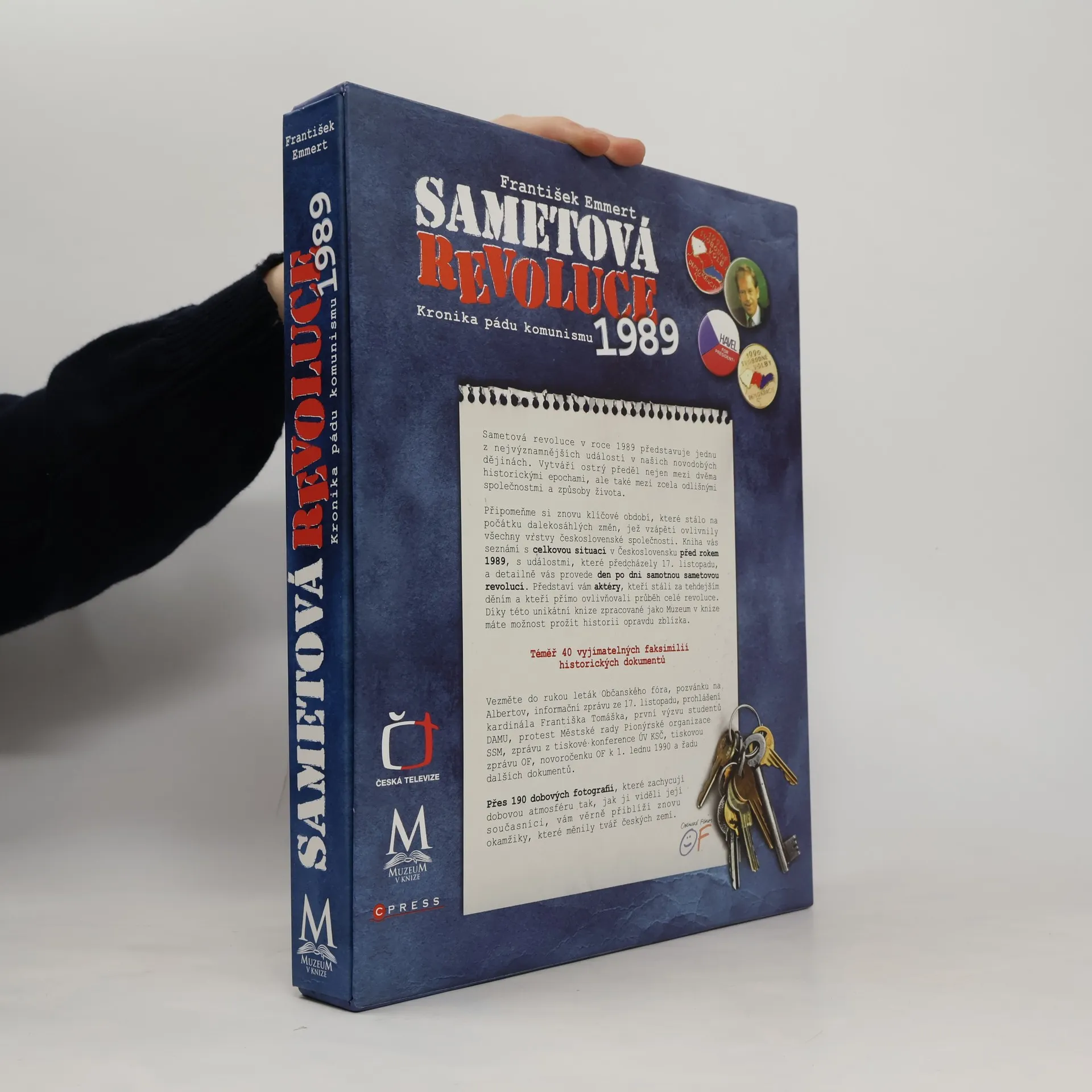 Sametová revoluce v roce 1989 představuje jednu z nejvýznamnějších událostí v našich novodobých dějinách. Vytváří ostrý předěl nejen mezi dvěma historickými epochami, ale také mezi zcela odlišnými společnostmi a způsoby života. Připomeňme si znovu klíčové období, které stálo na počátku dalekosáhlých změn, jež vzápětí ovlivnily všechny vrstvy československé společnosti. V knize se například dočtete: Jak vypadala situace v Československu před rokem 1989, jaké události předcházely 17. listopadu, jak probíhala sametová revoluce den po dni, kdo byli jejími aktéry. Díky této unikátní knize zpracované jako Muzeum v knize máte možnost prožít historii opravdu zblízka. V publikaci mimo jiné naleznete tyto dokumenty: Leták Občanského fóra, pozvánku na Albertov, informační zprávu ze 17. listopadu, prohlášení kardinála Františka Tomáška, první výzvu studentů DAMU, protest Městské rady Pionýrské organizace SSM, zprávu z tiskové konference ÚV KSČ, tiskovou zprávu OF, novoročenku OF k 1. lednu 1990 a řadu dalších dokumentů. Knihu doprovází přes 190 dobových fotografií, které zachycují dobovou atmosféru tak, jak ji viděli její současníci, a které vám věrně přiblíží znovu okamžiky, jenž měnily tvář českých zemí.