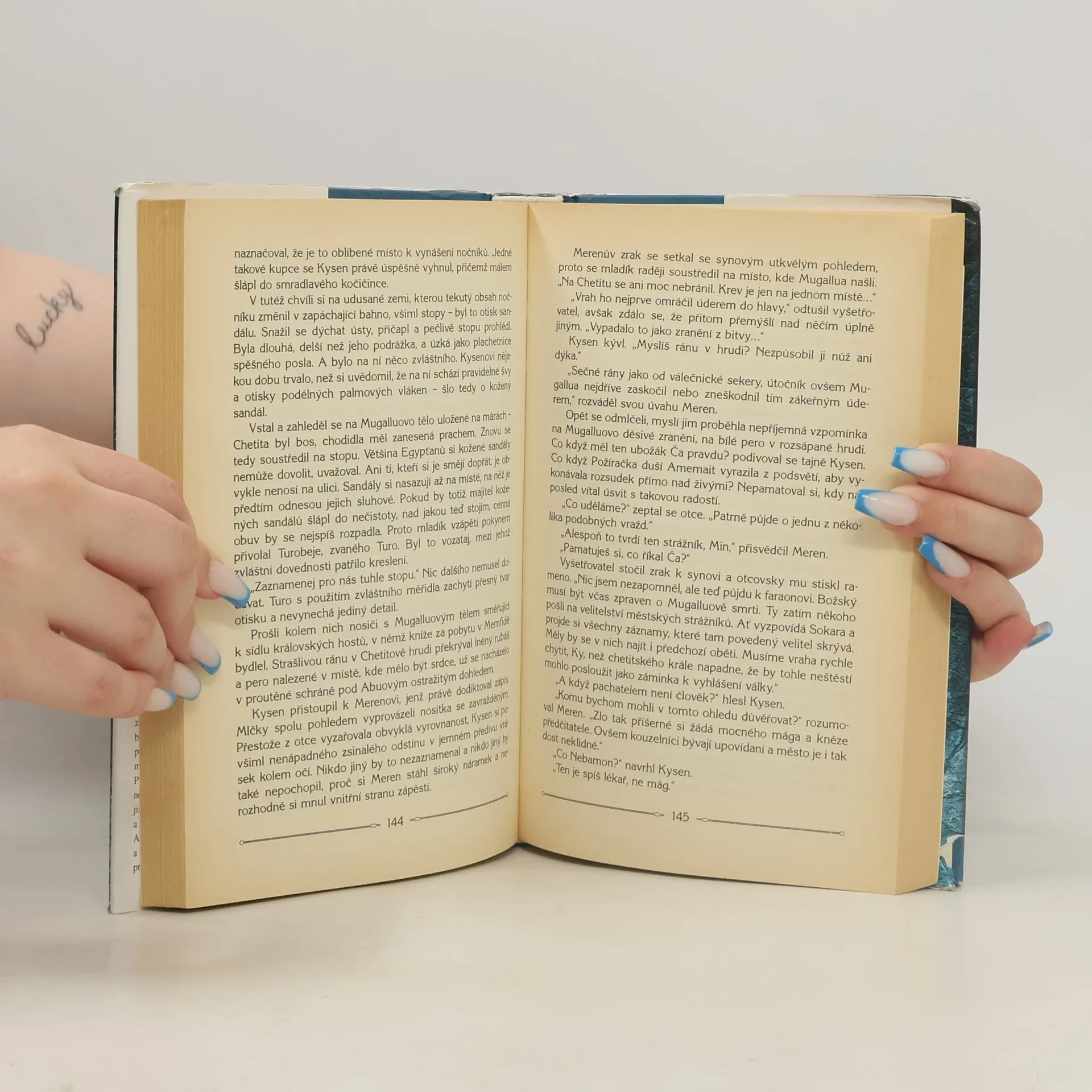 V detektivním románu z egyptského starověku řeší faraonův vyšetřovatel řadu přízračných brutálních vražd. Královský vyšetřovatel Meren, "Oči a uši" čtrnáctiletého faraona Tutanchamóna, má nový případ. Město Memfidu ovládl děs, neboť v jejích úzkých uličkách se množí obzvlášť hrůzné vraždy. Vydala se snad na zem Velká Požíračka, bohyně Amemait s krokodýlí hlavou, která usmrcuje hříšníky? Meren má před sebou nebezpečný úkol: vypátrat, zda vraždění je dílem hnusného démona podsvětí či tvora pozemského - člověka. Nastává čas neúnavného pronásledování a intrik až ke konečnému odhalení pachatele ohavných zločinů. Autorka rafinovaně spřádá nitky napínavého příběhu a vytváří barvitý obraz života ve starém Egyptě, plný šokujících překvapení.