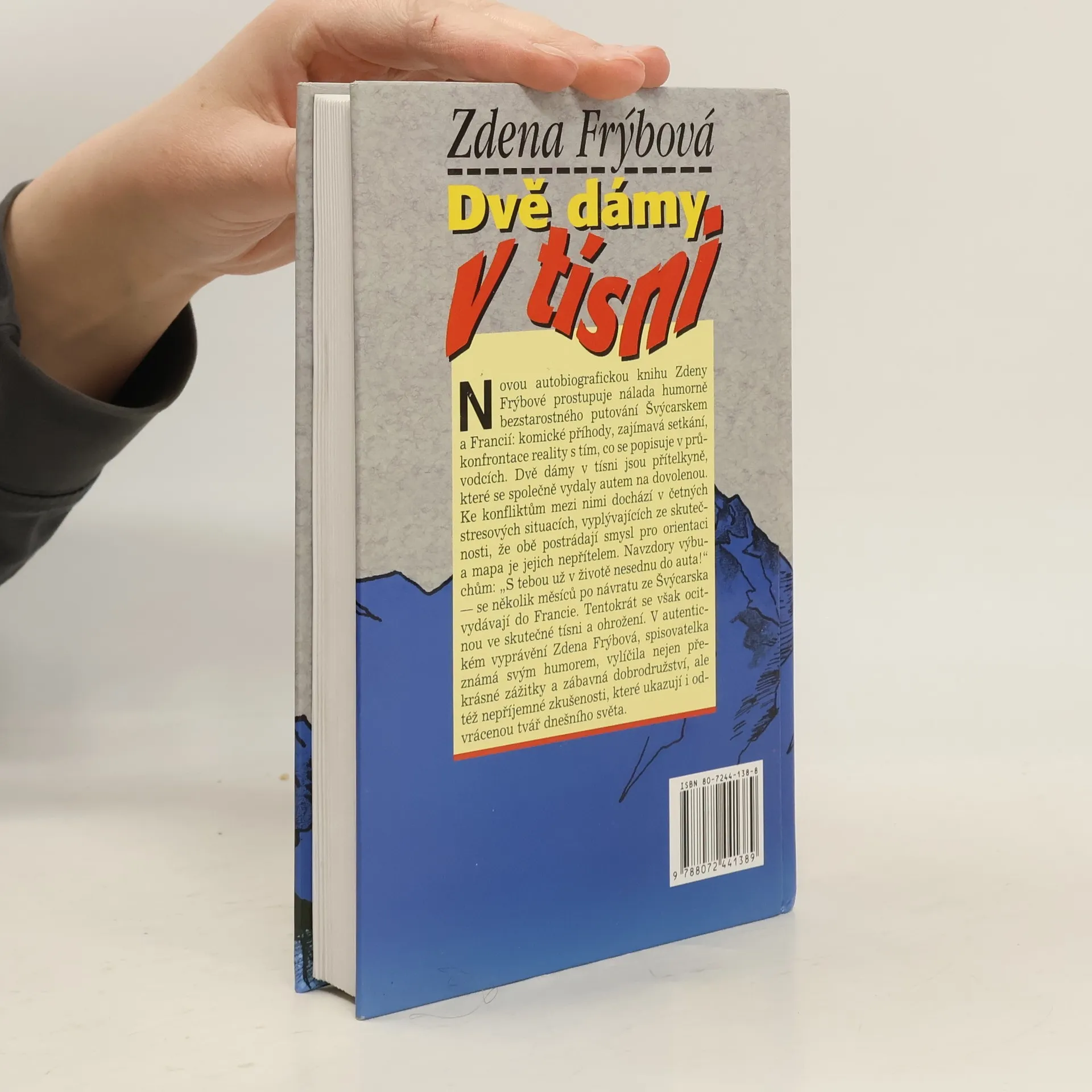 Autobiografickou knihu Zdeny Frýbové prostupuje nálada humorně bezstarostného putování Švýcarskem a Francií: komické příhody, zajímavá setkání, konfrontace reality s tím, co se popisuje v průvodcích. Dvě dámy v tísni jsou přítelkyně, které se společně vydaly autem na dovolenou. Ke konfliktům mezi nimi dochází v četných stresových situacích, vyplývajících ze skutečnosti, že obě postrádají smysl pro orientaci a mapa je jejich nepřítelem. V autentické vyprávění o vlastních cestách autorka vylíčila nejen krásné zážitky a zábavná dobrodružství, ale též nepříjemné zkušenosti, které ukazují i odvrácenou tvář dnešního světa. 2. vydání