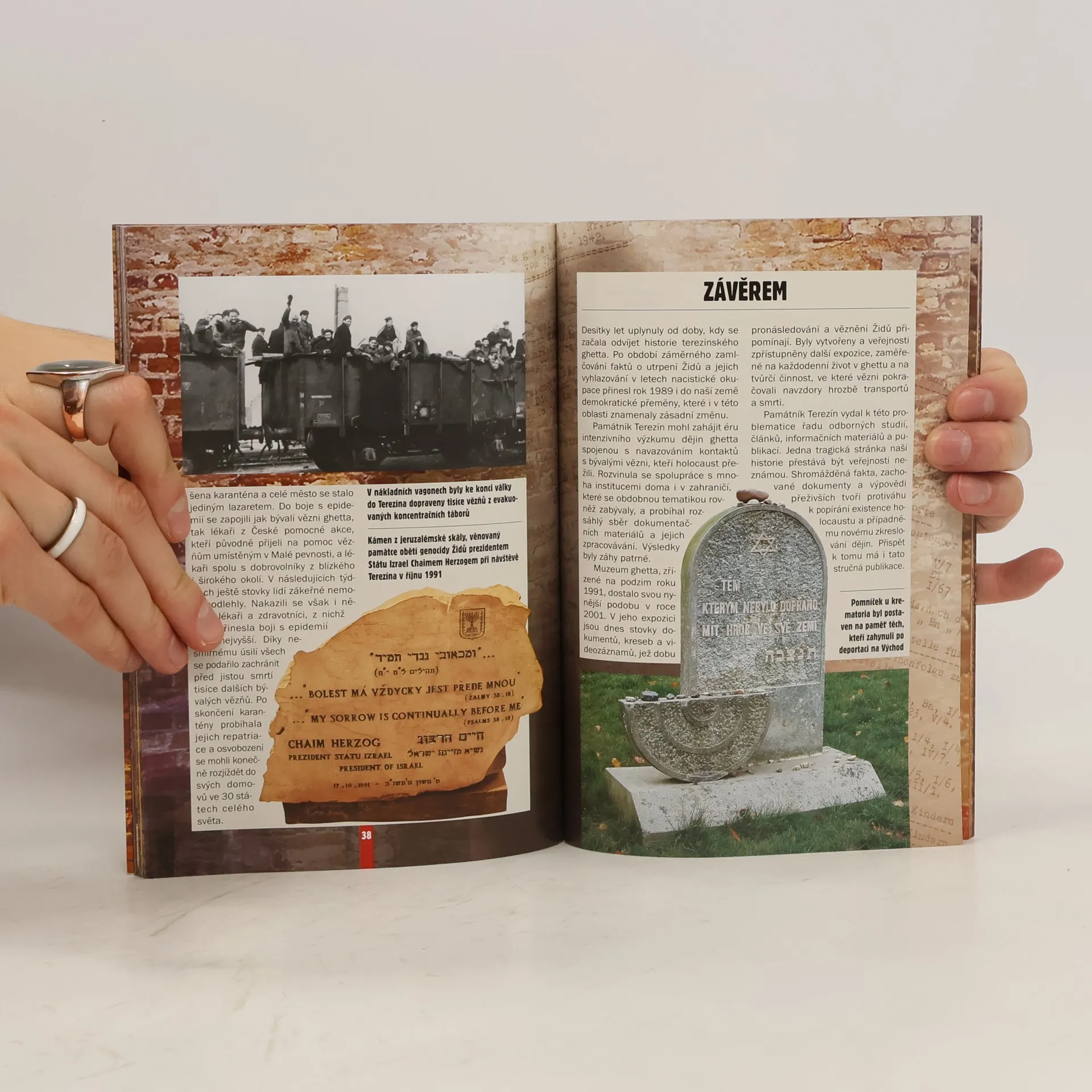 Přehledná publikace seznamující v několika tématických okruzích, doplněných dokumentačními fotografiemi, s významným fenoménem dějin 2. světové války na území Čech a Moravy, koncentračním táborem Terezín. Do Terezína bylo v průběhu války deportováno na 140 tisíc vězňů, obviněných především na základě rasových zákonů, na 84 tisíc z nich bylo transportováno dále na Východ (přežilo zhruba 3 500 osob), na 35 tisíc jich v Terezíně, oficiálně tzv. "sídlišti s židovskou samosprávou", zahynulo (vysílením, nemocemi, popravami aj.). V témže místě žilo před 2. světovou válkou a po ní přibližně 4 000 občanů. První vydání.
