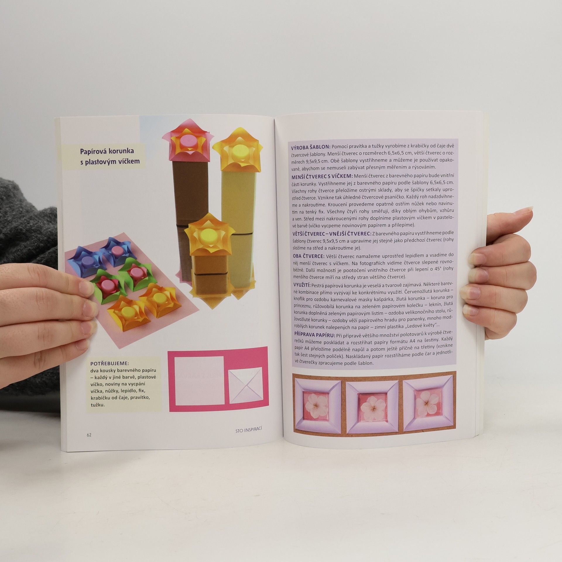 Zajímavé výtvory vznikají z časopisů, krabiček, kelímků, přírodnin… V knize se setkáte s tradičními technikami v novém, jednoduchém a hravém pojetí. Sto tvořivých radostí rozvíjí cit a fantazii, pomáhá přírodě a šetří finance. Pestrobarevné obrazce, přáníčka, zvířátka, kouzelné duhové lampičky, průsvitné okenní dekorace, mozaiky, skládanky, vázy…