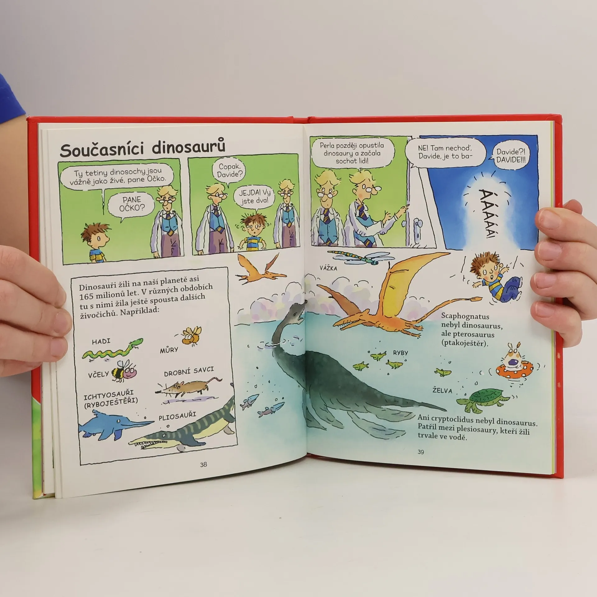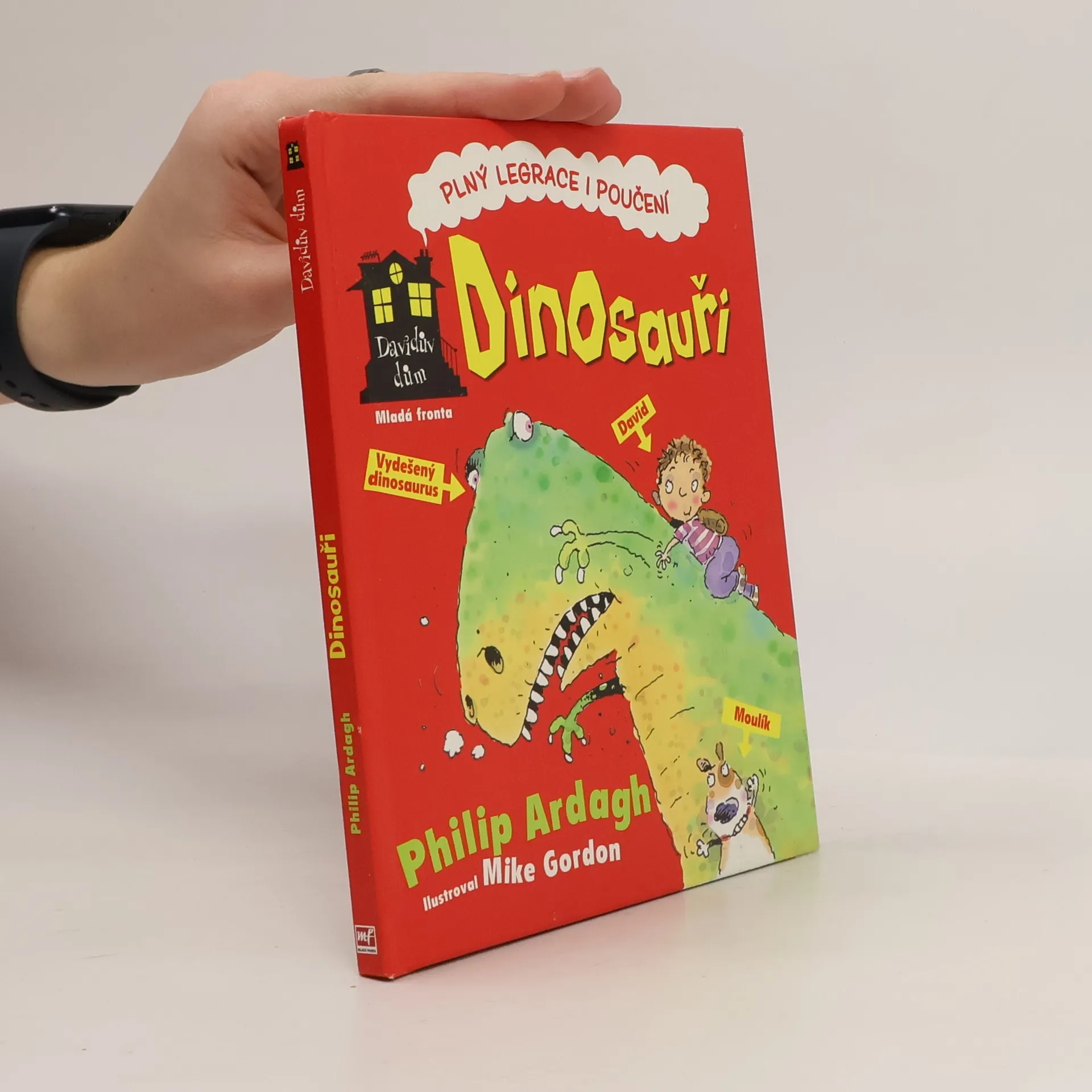 Vítejte v kouzelném Davidově domě, kde se může stát cokoli (a taky se to často stane). Kromě Davida a jeho žravého psa Moulíka se tu setkáte s panem Očkem (vševědoucím správcem domu), nápaditým vynálezcem Koumesem či Kubou Kutílkem, specialistou na převleky. V Dinosaurech se dozvíte, který dinosaurus byl na světě největší, který měl nejhrozivější zuby či který měl peří (a přesto neuměl létat).