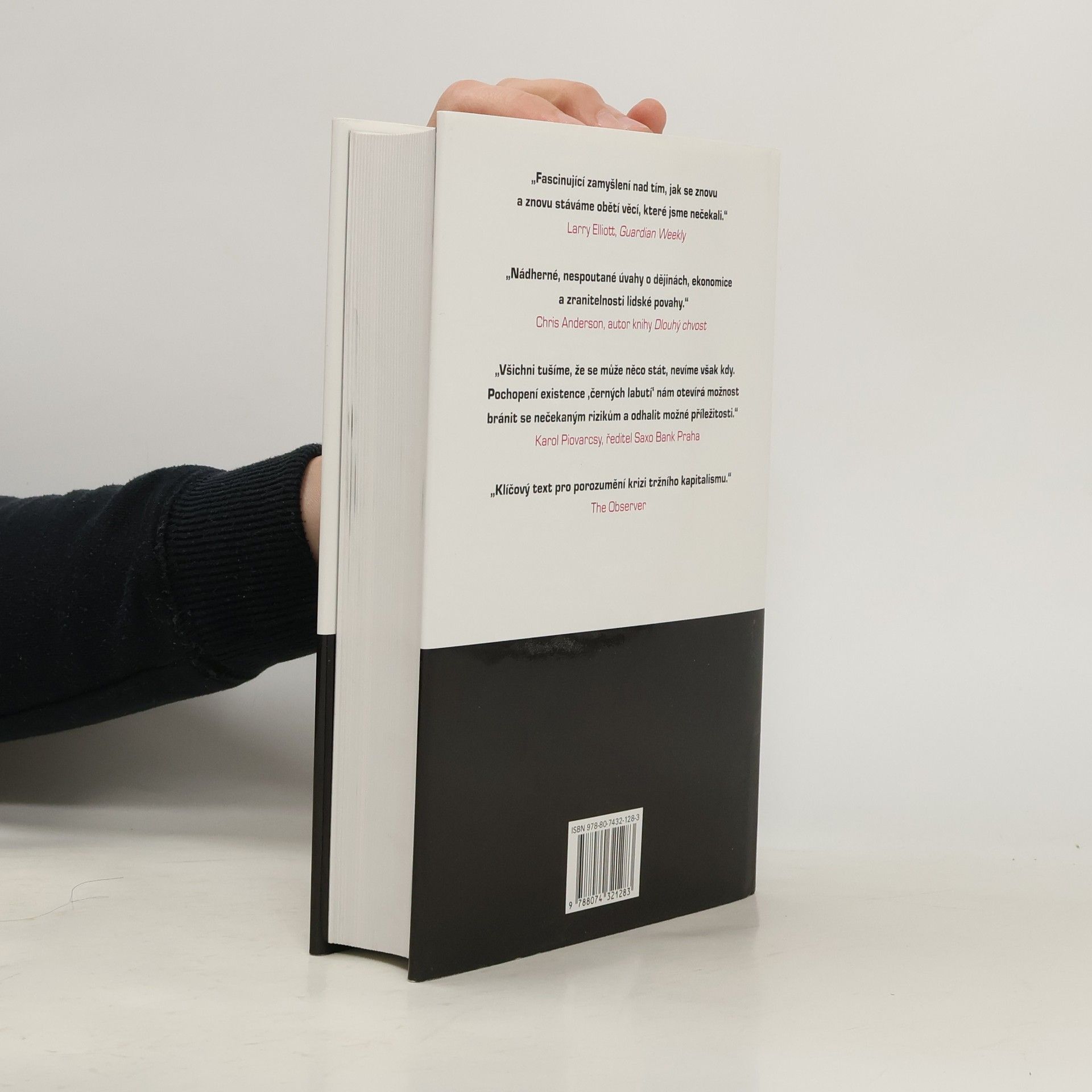 Následky vysoce nepravěpodobných událostí Bestseller amerického akademika a investičního poradce libanonského původu analyzuje fenomén „černých labutí“, tj. nepředvídaných jevů a událostí s významným dopadem na život jedince nebo celé společnosti, jakým byl např. teroristický útok z 11. září 2001, fenomenální úspěch společnosti Google či nedávná globální finanční a ekonomická krize. Autor – jeden z mála odborníků, kteří nástup krize předvídali – věří, že příčinou naší nepřipravenosti na podobné zlomové události je především setrvačnost našeho myšlení v podobě přílišné důvěry ve statistiky a prognostiky, přehnaného kategorizování, hledání „logiky“ vývoje či soustřeďování se na specifika tam, kde bychom měli přemýšlet spíše v obecných kontextech. Jeho kniha, vyzývající k tomu, abychom přehodnotili náš ustálený pohled na svět a přiznali si, jak málo o něm víme, patří dnes k nejdiskutovanějším pracím ve svém žánru, deníkem Times byla označena za jedno z nejvlivnějších děl posledních šedesáti let a díky autorovu širokému rozhledu, smyslu pro humor a zdravé provokativnosti je i velkým čtenářským zážitkem.