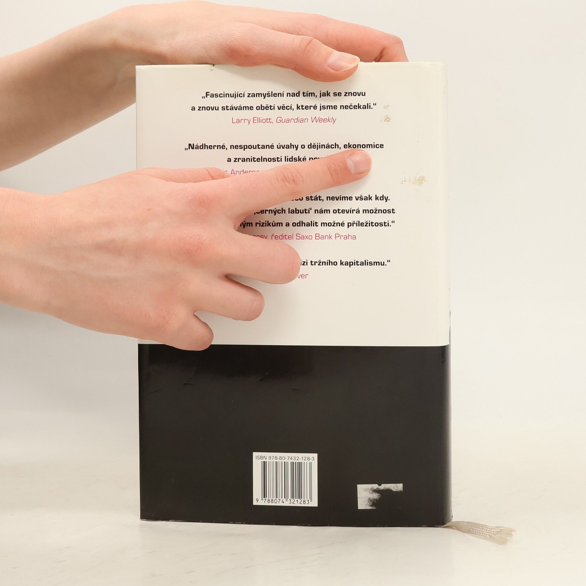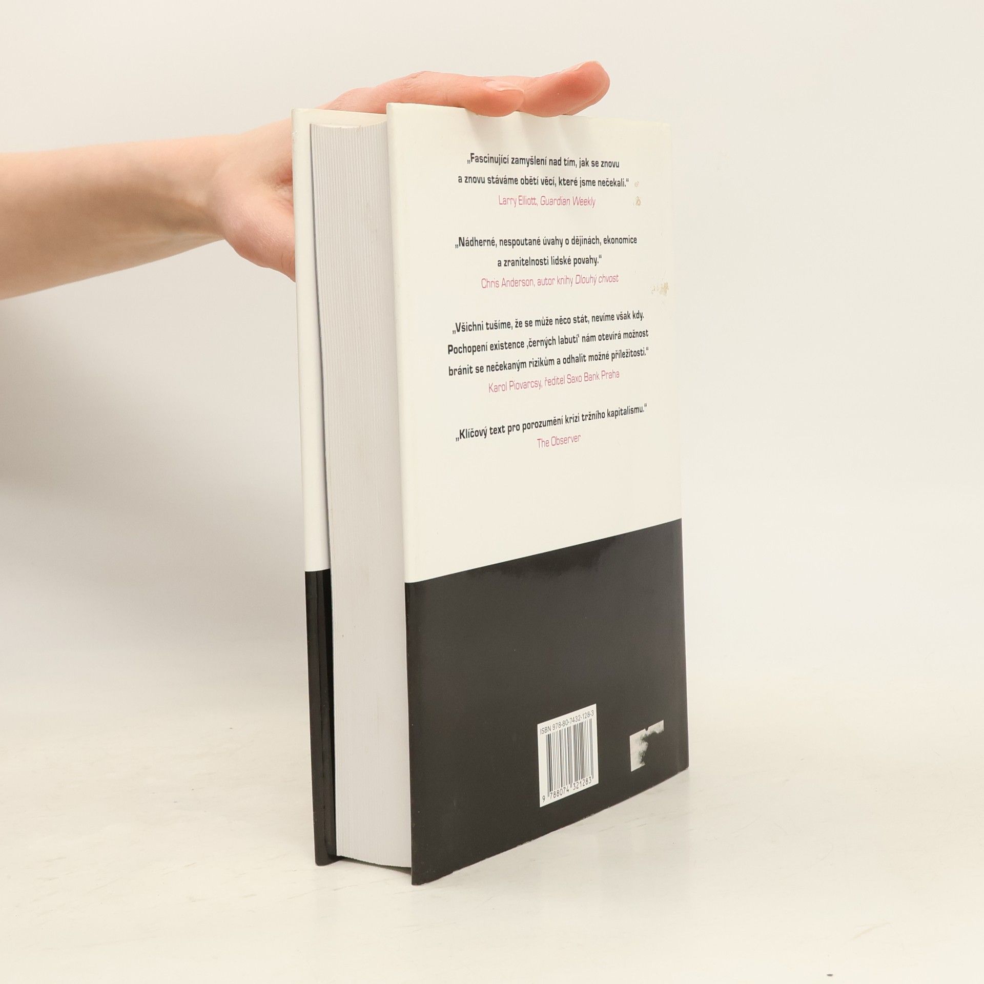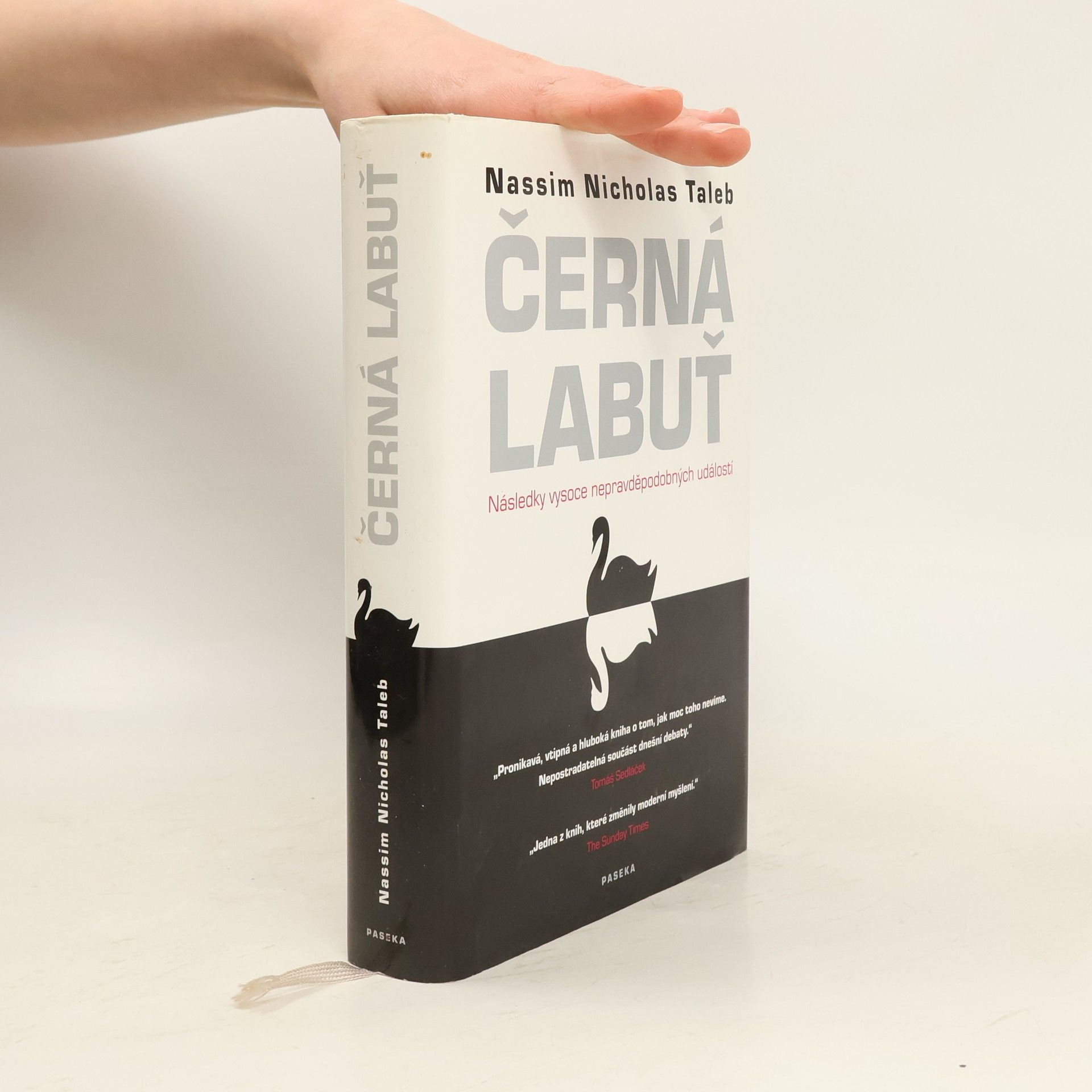 Následky vysoce nepravěpodobných událostí Bestseller amerického akademika a investičního poradce libanonského původu analyzuje fenomén „černých labutí“, tj. nepředvídaných jevů a událostí s významným dopadem na život jedince nebo celé společnosti, jakým byl např. teroristický útok z 11. září 2001, fenomenální úspěch společnosti Google či nedávná globální finanční a ekonomická krize. Autor – jeden z mála odborníků, kteří nástup krize předvídali – věří, že příčinou naší nepřipravenosti na podobné zlomové události je především setrvačnost našeho myšlení v podobě přílišné důvěry ve statistiky a prognostiky, přehnaného kategorizování, hledání „logiky“ vývoje či soustřeďování se na specifika tam, kde bychom měli přemýšlet spíše v obecných kontextech. Jeho kniha, vyzývající k tomu, abychom přehodnotili náš ustálený pohled na svět a přiznali si, jak málo o něm víme, patří dnes k nejdiskutovanějším pracím ve svém žánru, deníkem Times byla označena za jedno z nejvlivnějších děl posledních šedesáti let a díky autorovu širokému rozhledu, smyslu pro humor a zdravé provokativnosti je i velkým čtenářským zážitkem.