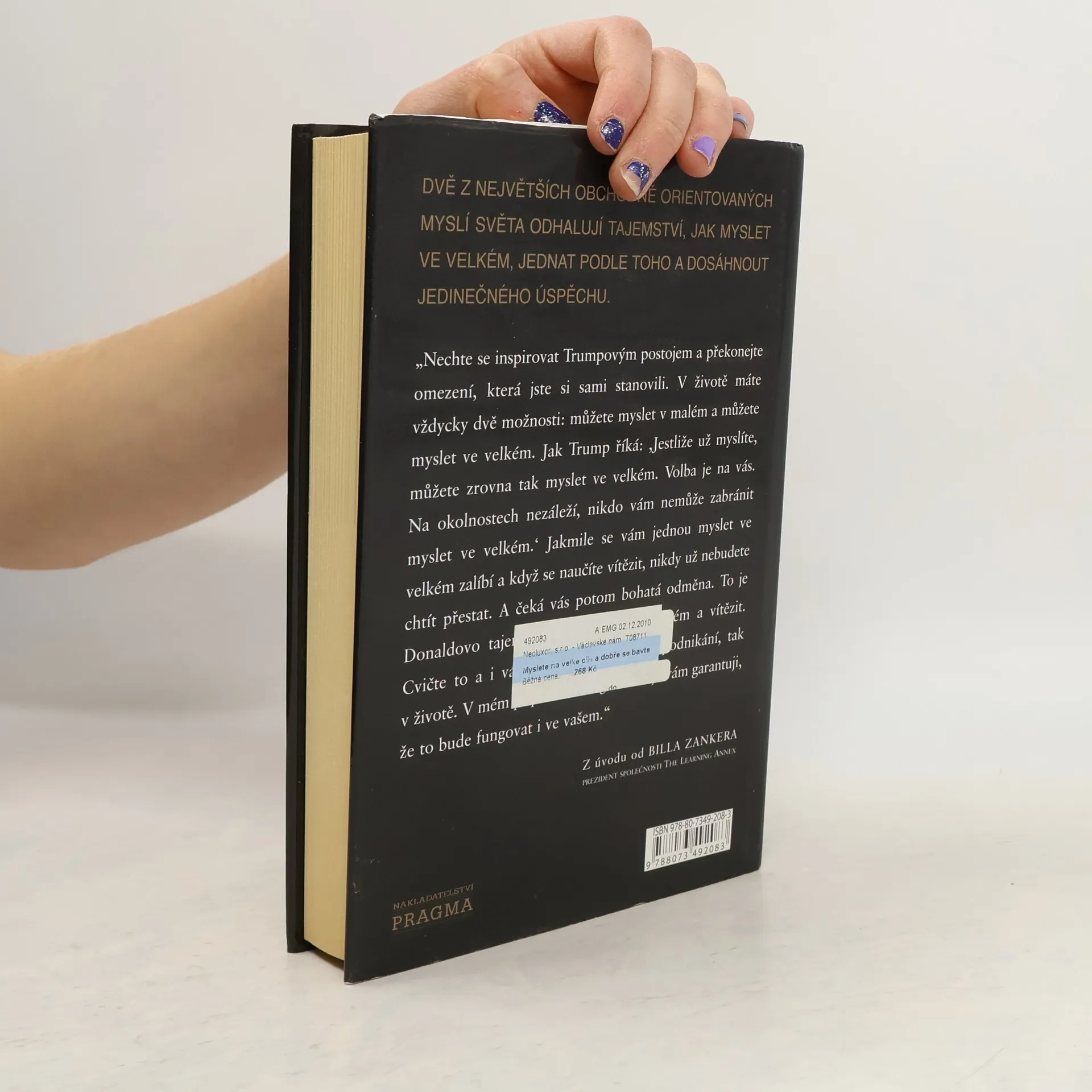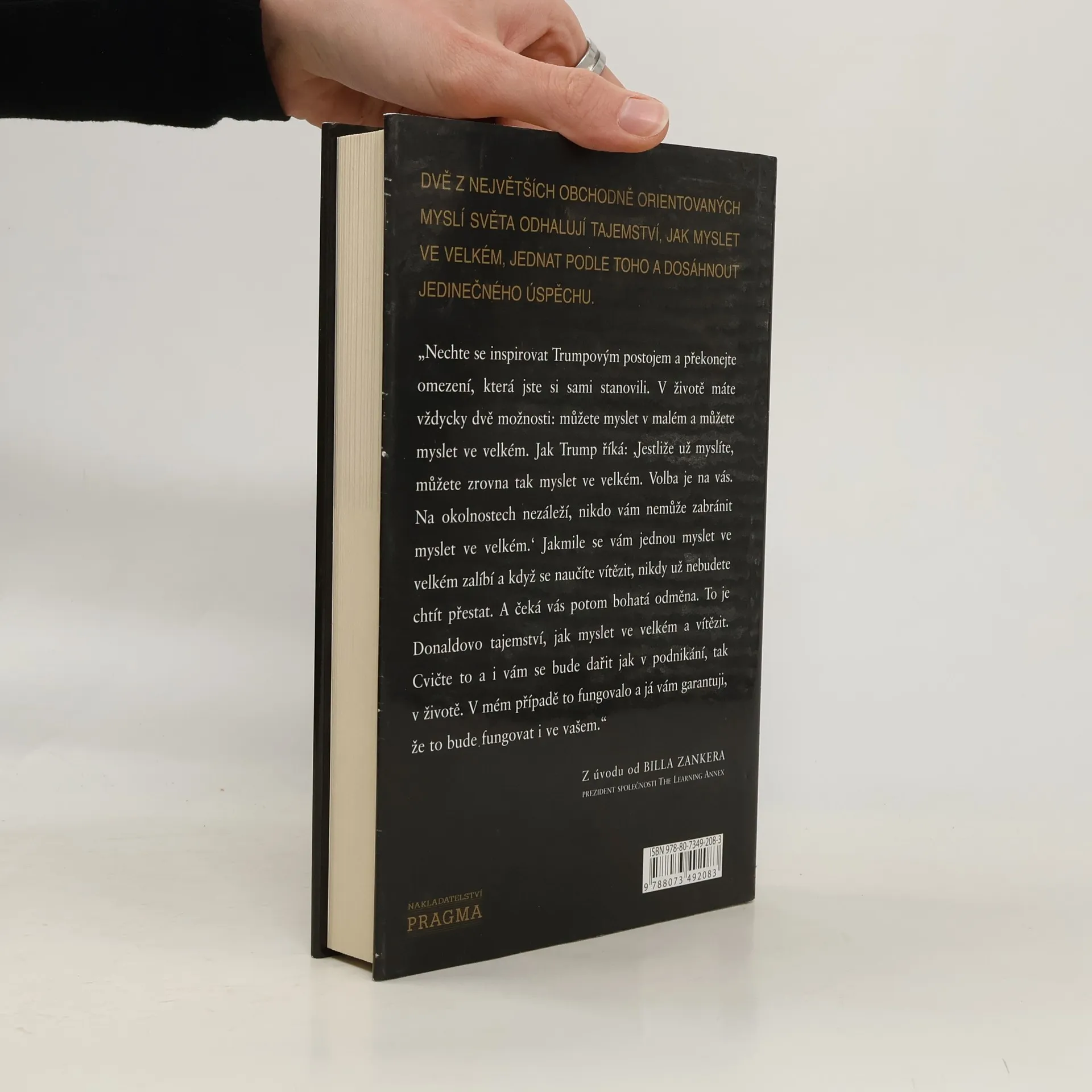 Donald J. Trump je ikona a dokonalý příklad amerického úspěchu. Hvězda pořadu The Apprentice a developer jedněch z nejprestižnějších staveb na světě. Bill Zanker založil firmu The Learning Annex s pěti tisíci dolary. Postupně z ní vytvořil firmu s příjmem pěti milionů dolarů ročně. To bylo předtím, než se potkal s Donaldem Trumpem. O třicet měsíců později, když se Zanker naučil myslet ve velkém, začala jeho firma The Learning Annex vydělávat prodejem sto milionů ročně. A rozrůstá se dál. Oba představují živé příklady toho, jak myslet ve velkém a jak poznat, kdy je třeba agresivně podpořit své názory, a to bez ohledu na to, co by mohli vaši kritikové nebo oponenti říci. To vám může napomoci dosáhnout co největších osobních a profesních úspěchů.