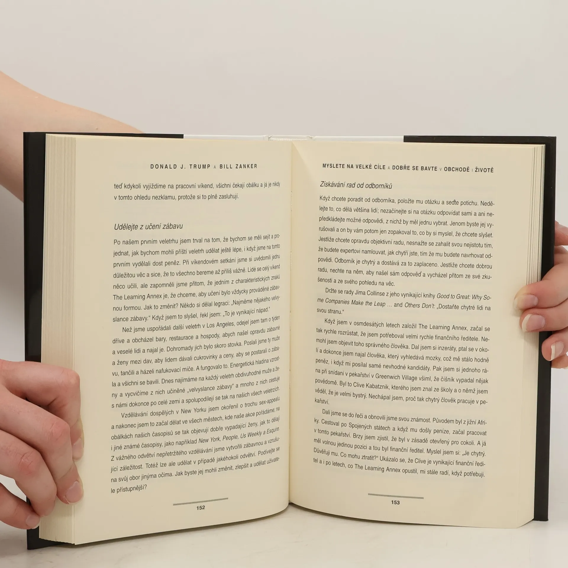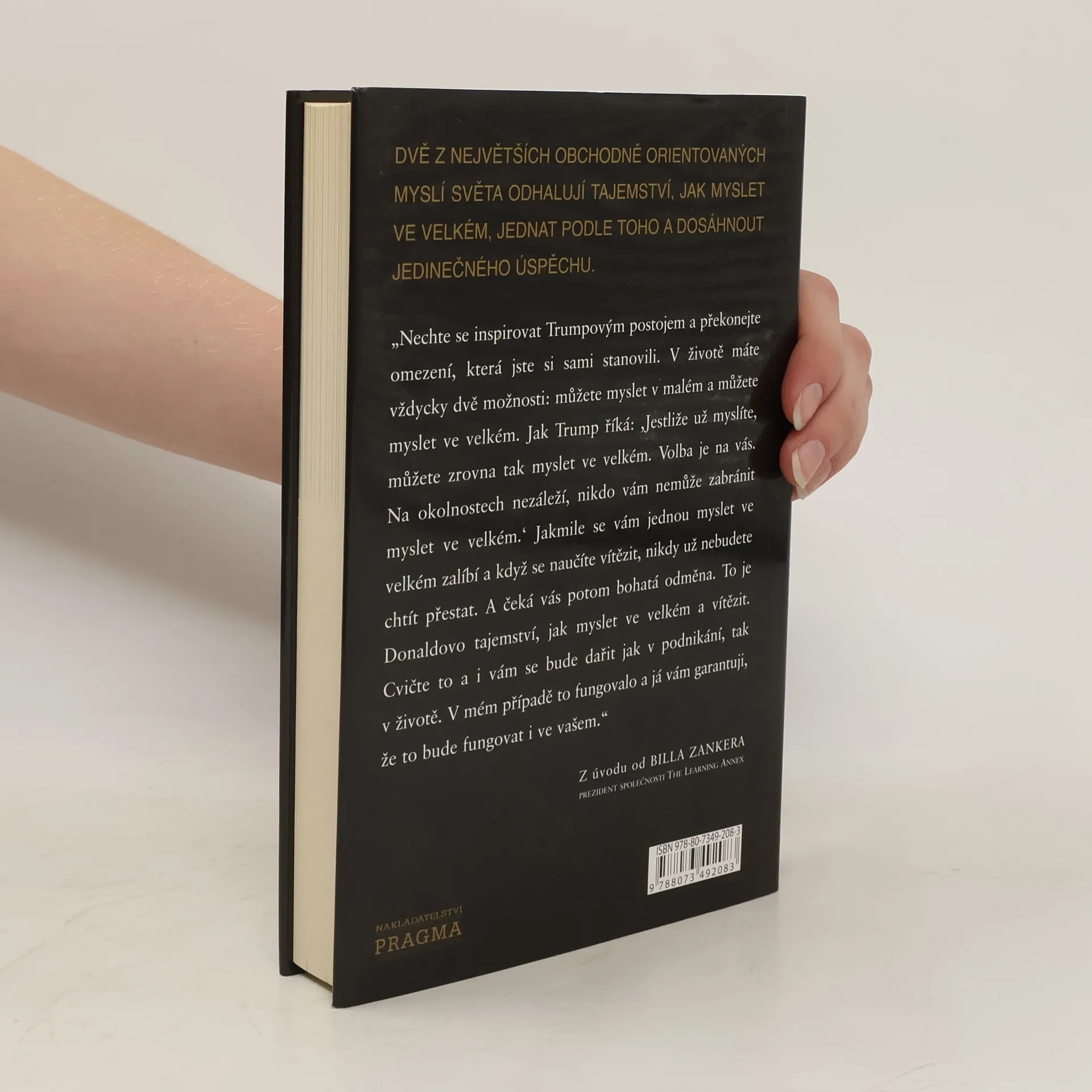Donald J. Trump je ikona a dokonalý příklad amerického úspěchu. Hvězda pořadu The Apprentice a developer jedněch z nejprestižnějších staveb na světě. Bill Zanker založil firmu The Learning Annex s pěti tisíci dolary. Postupně z ní vytvořil firmu s příjmem pěti milionů dolarů ročně. To bylo předtím, než se potkal s Donaldem Trumpem. O třicet měsíců později, když se Zanker naučil myslet ve velkém, začala jeho firma The Learning Annex vydělávat prodejem sto milionů ročně. A rozrůstá se dál. Oba představují živé příklady toho, jak myslet ve velkém a jak poznat, kdy je třeba agresivně podpořit své názory, a to bez ohledu na to, co by mohli vaši kritikové nebo oponenti říci. To vám může napomoci dosáhnout co největších osobních a profesních úspěchů.