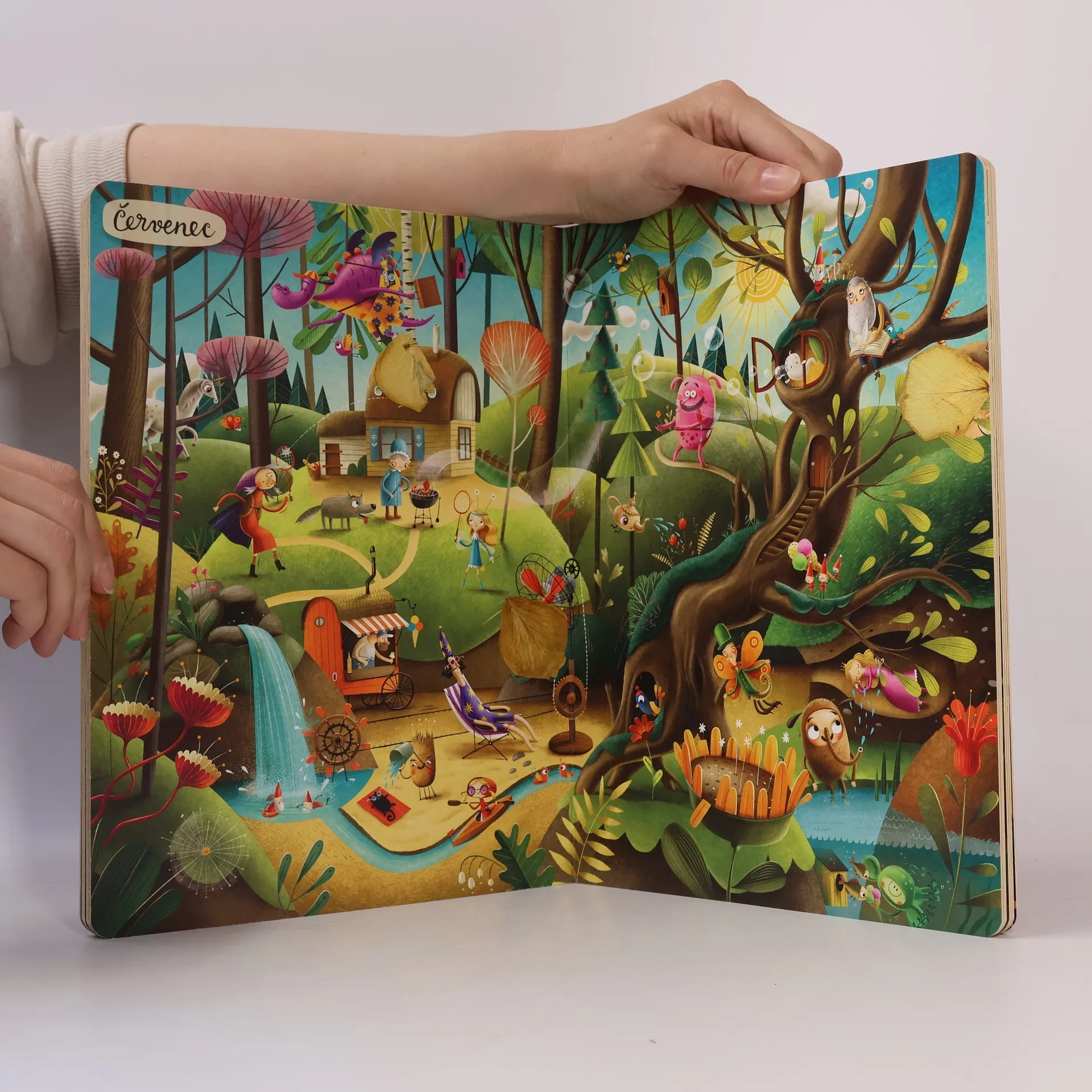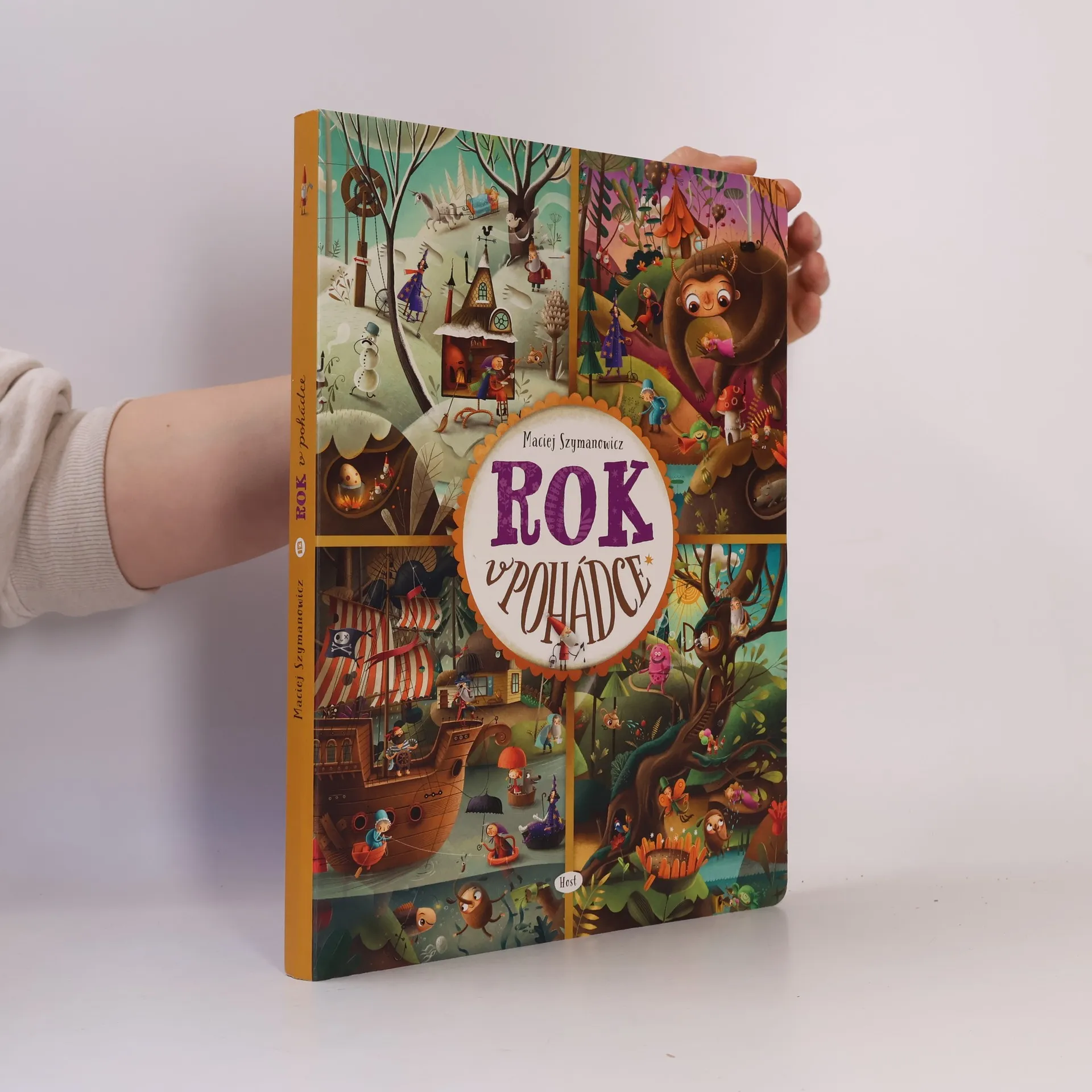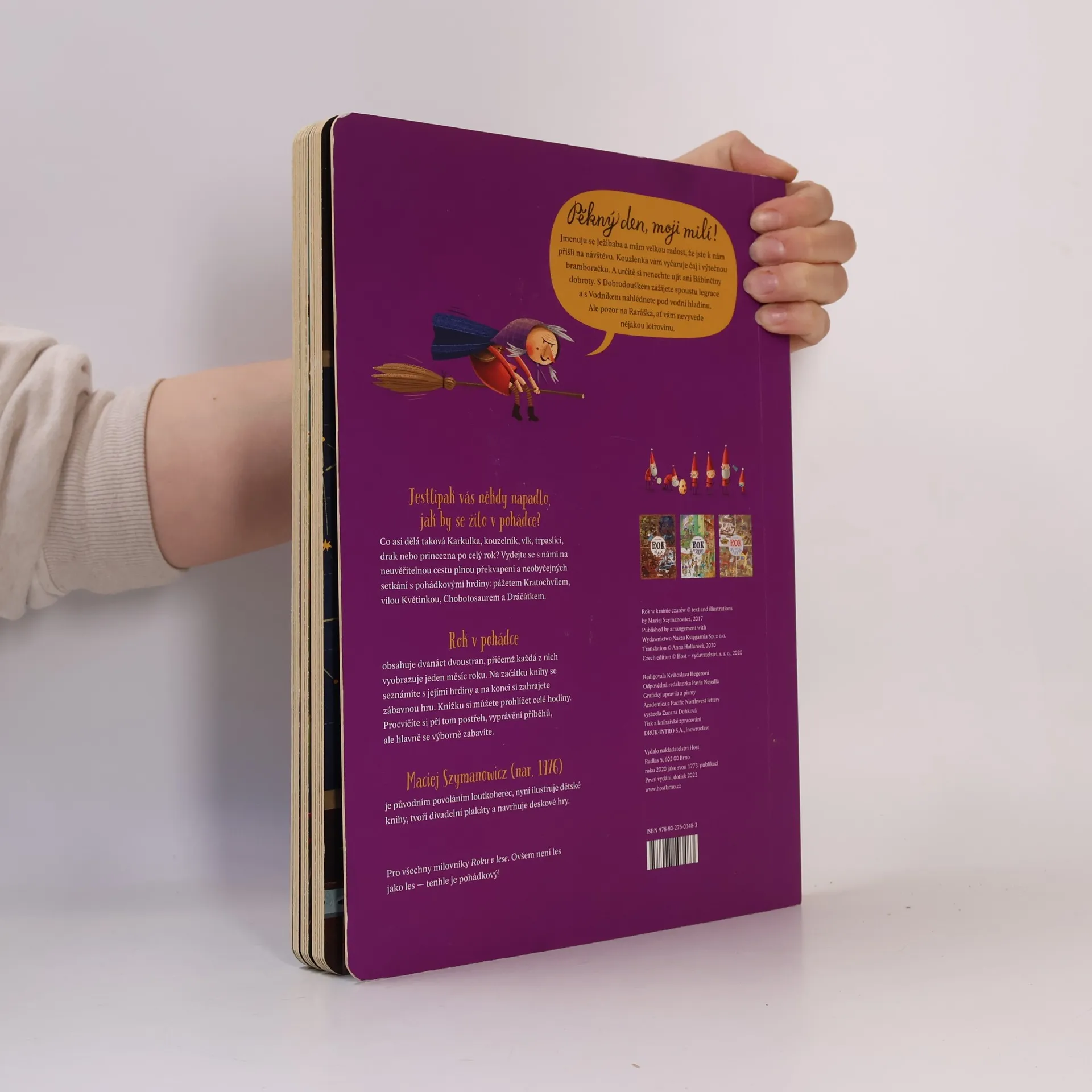 "Pěkný den, moji milí! Jmenuju se Ježibaba a mám velkou radost, že jste k nám přišli na návštěvu. Kouzlenka vám vyčaruje čaj i výtečnou bramboračku. A určitě si nenechte ujít ani Bábinčiny dobroty. S Dobrodouškem zažijete spoustu legrace a s Vodníkem nahlédnete pod vodní hladinu. Ale pozor na Raráška, ať vám nevyvede nějakou lotrovinu. Jestlipak vás někdy napadlo, jak by se žilo v pohádce? Co asi dělá taková Karkulka, kouzelník, vlk, trpaslíci, drak nebo princezna po celý rok? Vydejte se s námi na neuvěřitelnou cestu plnou překvapení a neobyčejných setkání s pohádkovými hrdiny: pážetem Kratochvílem, vílou Květinkou, Chobotosaurem a Dráčátkem. Rok v pohádce obsahuje dvanáct dvoustran, přičemž každá z nich vyobrazuje jeden měsíc roku. Na začátku knihy se seznámíte s jejími hrdiny a na konci si zahrajete zábavnou hru. Knížku si můžete prohlížet celé hodiny. Procvičíte si při tom postřeh, vyprávění příběhů, ale hlavně se výborně zabavíte. Pro všechny milovníky Roku v lese. Protože není les jako les — tenhle je pohádkový! "
