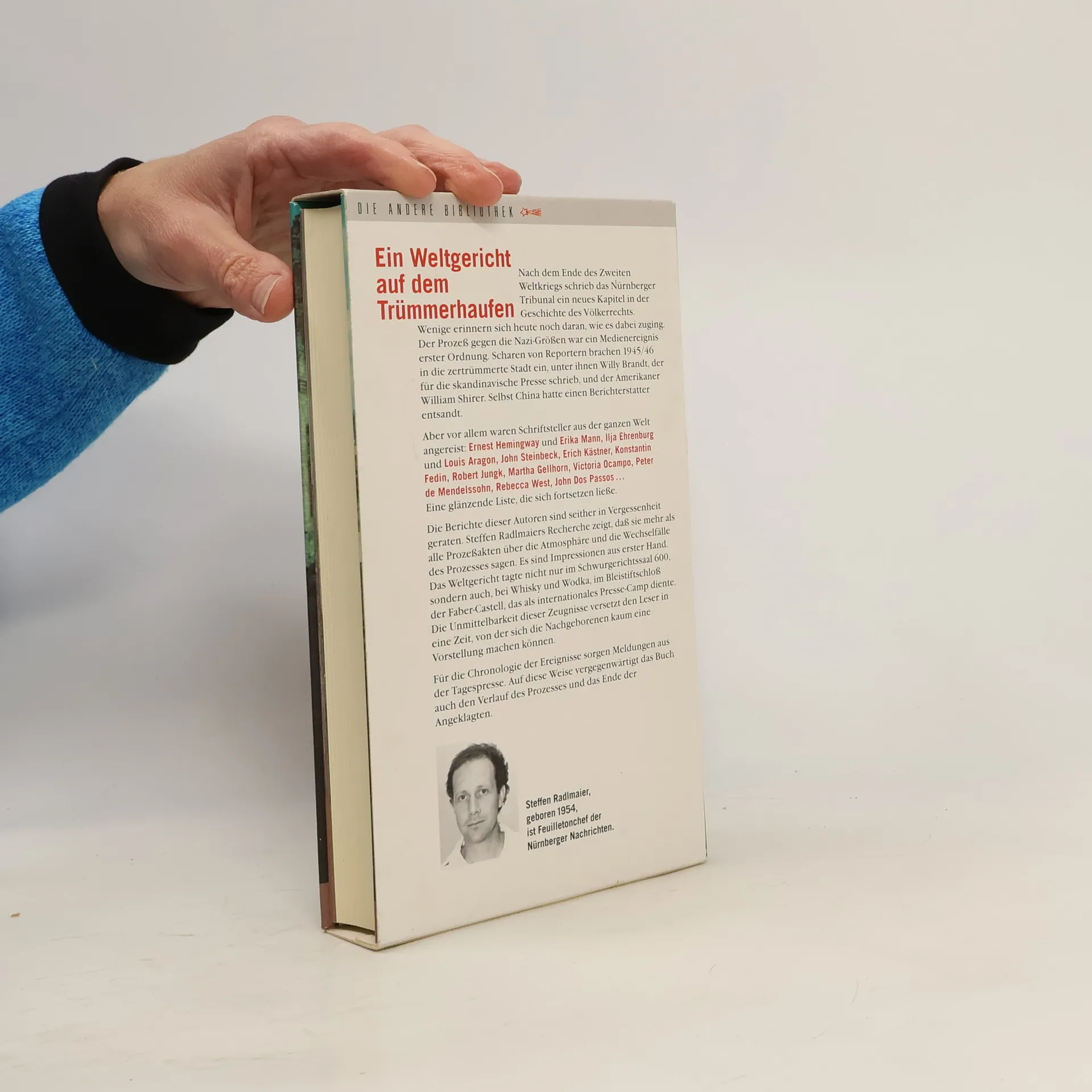 Nach dem Ende des Zweiten Weltkriegs schrieb das Nürnberger Tribunal ein neues Kapitel in der Geschichte des Völkerrechts. Wenige erinnern sich heute noch daran, wie es dabei zuging. Der Prozess gegen die Nazi-Größen war ein Medienereignis erster Ordnung. Scharen von Reportern brachen 1945/46 in die zertrümmerte Stadt ein, unter ihnen Willy Brandt, der für die skandinavische Presse schrieb, und der Amerikaner William Shirer. Selbst China hatte einen Berichterstatter entsandt. Aber vor allem waren Schriftsteller aus der ganzen Welt Ernest Hemingway und Erika Mann, Ilja Ehrenburg und Louis Aragon, John Steinbeck, Erich Kästner, Konstantin Fedin, Robert Jungk, Martha Gellhorn, Victoria Ocampo, Peter de Mendelssohn, Rebecca West, John dos Passos ... Eine glänzende Liste, die sich fortsetzen ließe. Die Berichte dieser Autoren sind seither in Vergessenheit geraten. Steffen Radlmaiers Recherche zeigt, dass sie mehr als alle Prozessakten über die Atmosphäre und die Wechselfälle des Prozesses sagen.