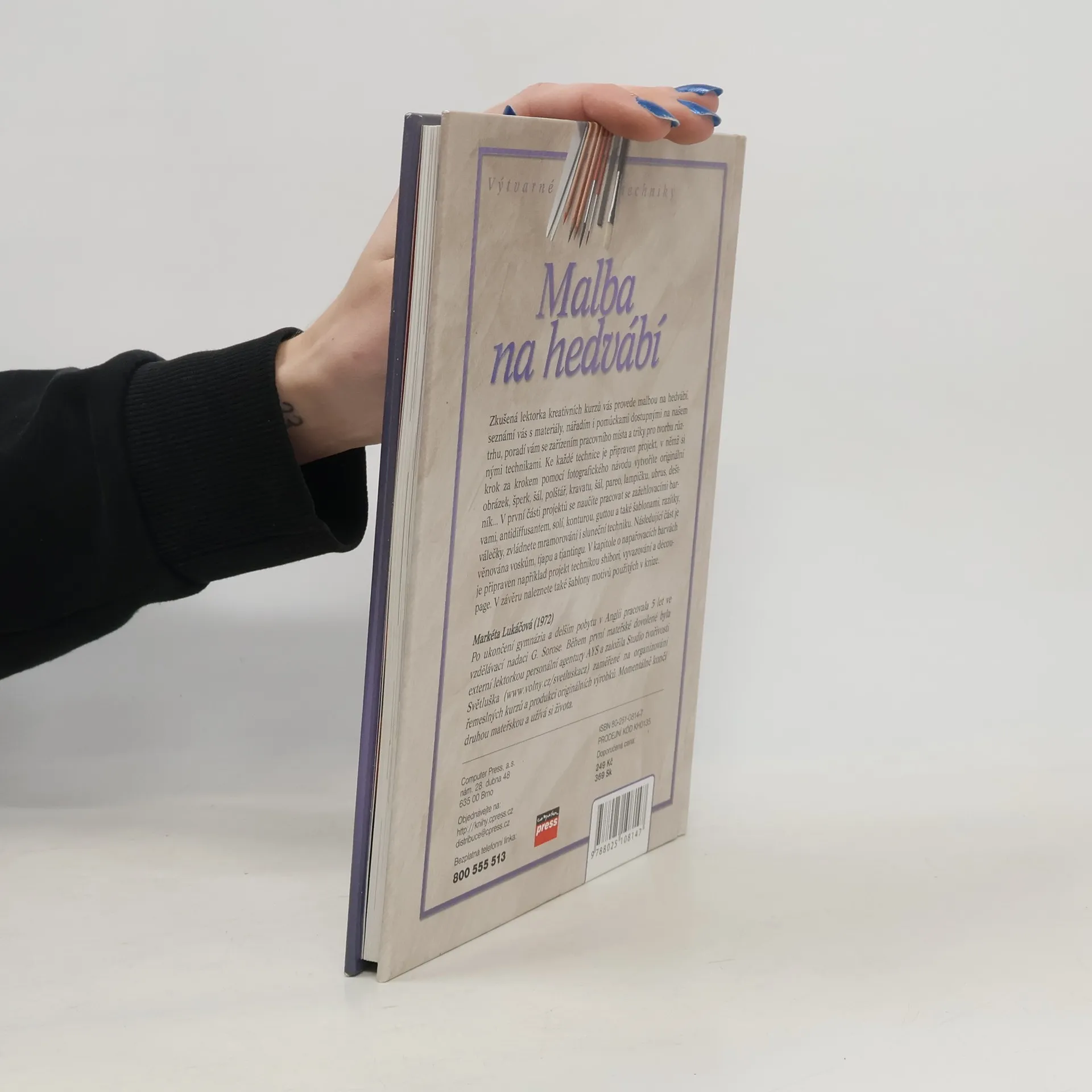 Pronikněte do tajů malby na hedvábí! Zkušená lektorka kreativních kurzů vás provede malbou na hedvábí od objevení tohoto materiálu až po nejnovější způsoby jeho zdobení. Seznámí vás s materiály, nářadím i pomůckami dostupnými na našem trhu, poradí vám se zařízením pracovního místa a triky pro tvorbu různými technikami. Ke každé technice je připraven projekt, v němž si krok za krokem pomocí fotografického návodu vytvoříte originální obrázek, šperk, šál, polštář, kravatu, šál, pareo, lampičku, ubrus, deštník V první části projektů se naučíte pracovat se zažehlovacími barvami, anitdiffusantem, solí, konturou, guttou a také šablonami, razítky, válečky, zvládnete mramorování i sluneční techniku. Následující část je věnována vosku studenému i teplému, tjapu a tjantingu. V kapitole o napařovacích barvách je připraven například projekt technikou shibori, vyvazování a découpage. Pro ty, kteří se budou chtít pustit do náročnějšího projektu autorka přichystala návod na ozdobení sametového ponča technikou dévoré. V závěru naleznete také šablony motivů použitých v knize. Markéta Lukáčová (1972) Po ukončení gymnázia a delším pobytu v Anglii pracovala 5 let ve vzdělávací nadaci G. Sorose. Během první mateřské dovolené byla externí lektorkou personální agentury AYS a založila Studio tvořivosti Světluška zaměřené na organizování řemeslných kurzů a produkci originálních výrobků. Momentálně končí druhou mateřskou a užívá si života.... celý text