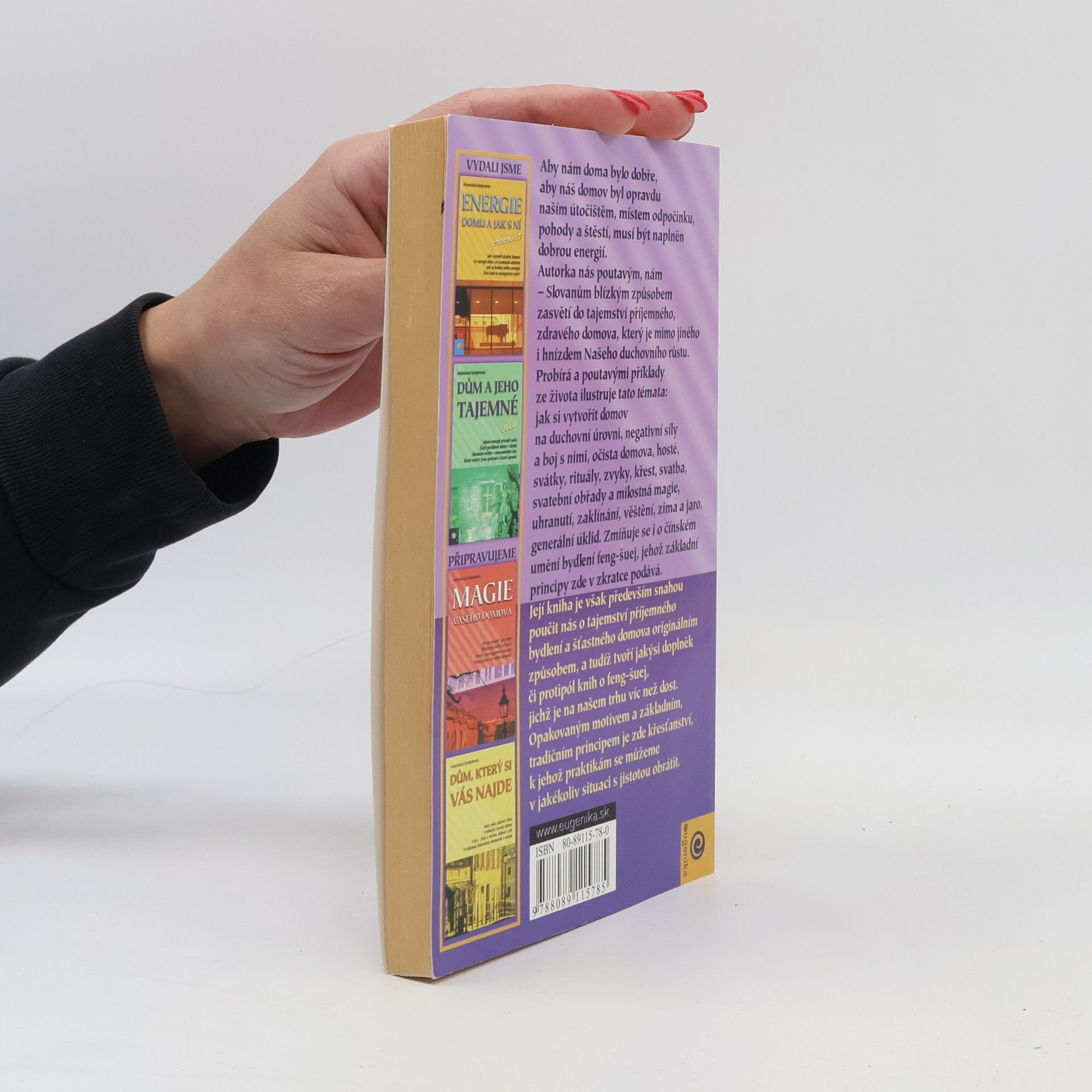 Třetí knížka veleúspěšné ruské autorky, jejíž knihy se v Rusku prodávají v milionech výtisků, je na rozdíl od předcházející knížky Dům a jeho skryté síly zaměřena spíše na duchovní stránku učení o energetice domova, na jeho karmu. Vždyť náš domov, ve kterém bydlíme, to nejsou jen stěny, to je celý mikrosvět, jenž existuje podle vlastních zákonů. Dům může být laskavé prostředí, které nás „miluje“, nebo špatné, démonické prostředí, jež nás může dusit, a dokonce ničit náš život. To, zda náš domov bude dobrý či špatný, závisí jen na nás – na naší energetické výměně, naší karmě či stavu mysli. My se dočteme, jak si zařídit domov z duchovního hlediska, jak jej i rodinu ochránit před temnými silami a jak domov očistit od špatných vlivů.