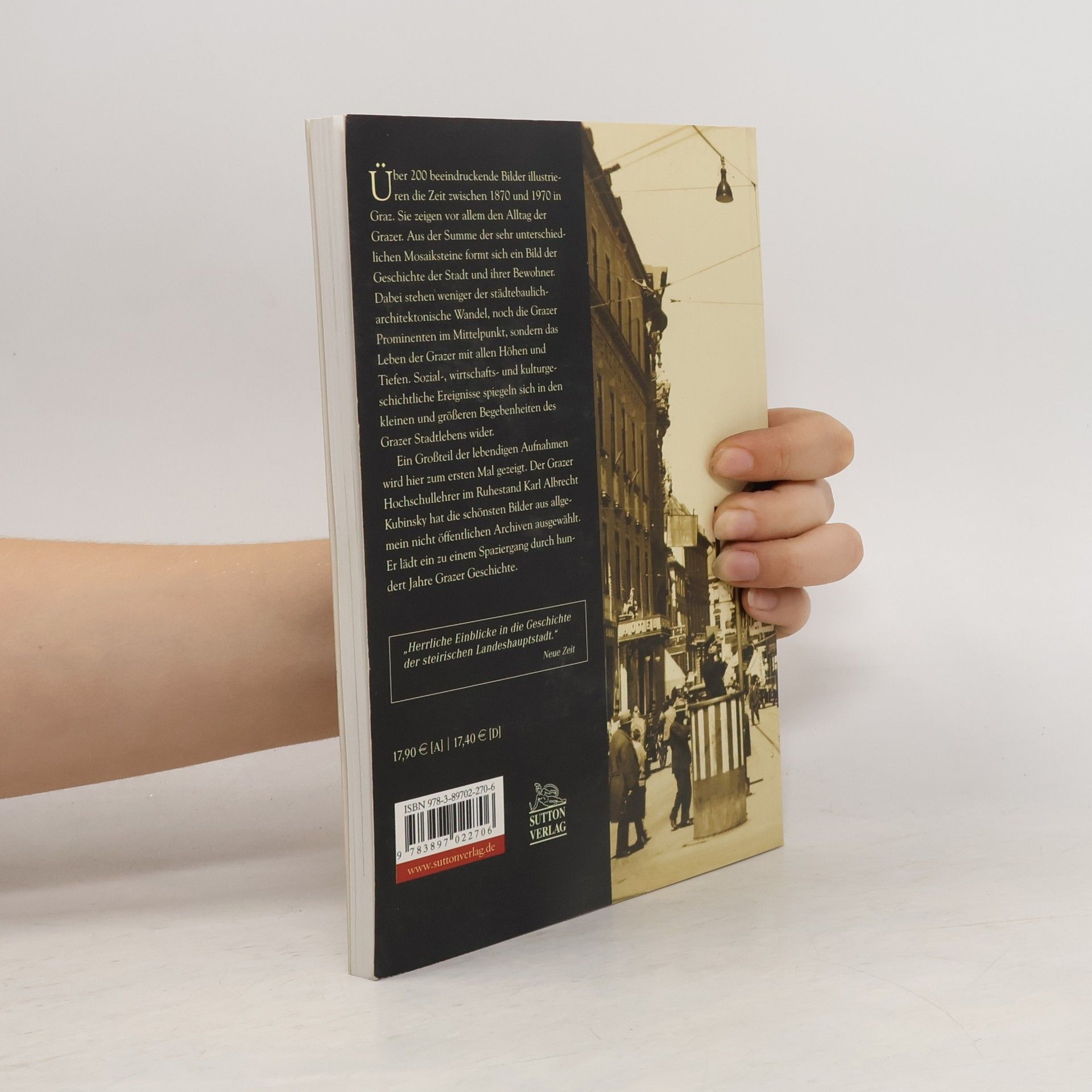 Mit Hilfe von über 200 typischen Bildern für Zeit und Geist der Jahre zwischen 1870 und 1970 werden hier der Alltag und das Besondere von Graz dargestellt. Aus der Summe der sehr unterschiedlichen Mosaiksteine formt sich ein Abbild der Geschichte der Stadt und ihrer Bewohner. Weniger der städtebaulich architektonische Wandel, noch die Prominenten von Graz, sondern das Leben und Schicksal seiner Bewohner soll hier dokumentiert und illustriert werden. Sozial-, wirtschafts- und kulturgeschichtliche Ereignisse spiegeln sich in den kleinen und größeren Ereignissen im Grazer Stadtleben wider und zeigen deutlich, daß Veränderungen nicht nur auf der großen, sondern auch auf kleinen Bühnen passieren können. Viele der Bilder waren bis jetzt unveröffentlicht. Nicht allgemein zugängliche Archive wurden für diese Dokumentation nach geeigneten Fotomaterial durchsucht. Mit Büchern wie "Graz im Wandel", "Graz aus der Vogelperspektive" und über die Grazer Straßennamen (gemeinsam mit A. Wentner) hat der Autor seine enge Verbindung zu Graz und seiner Geschichte bereits mehrmals bewiesen.