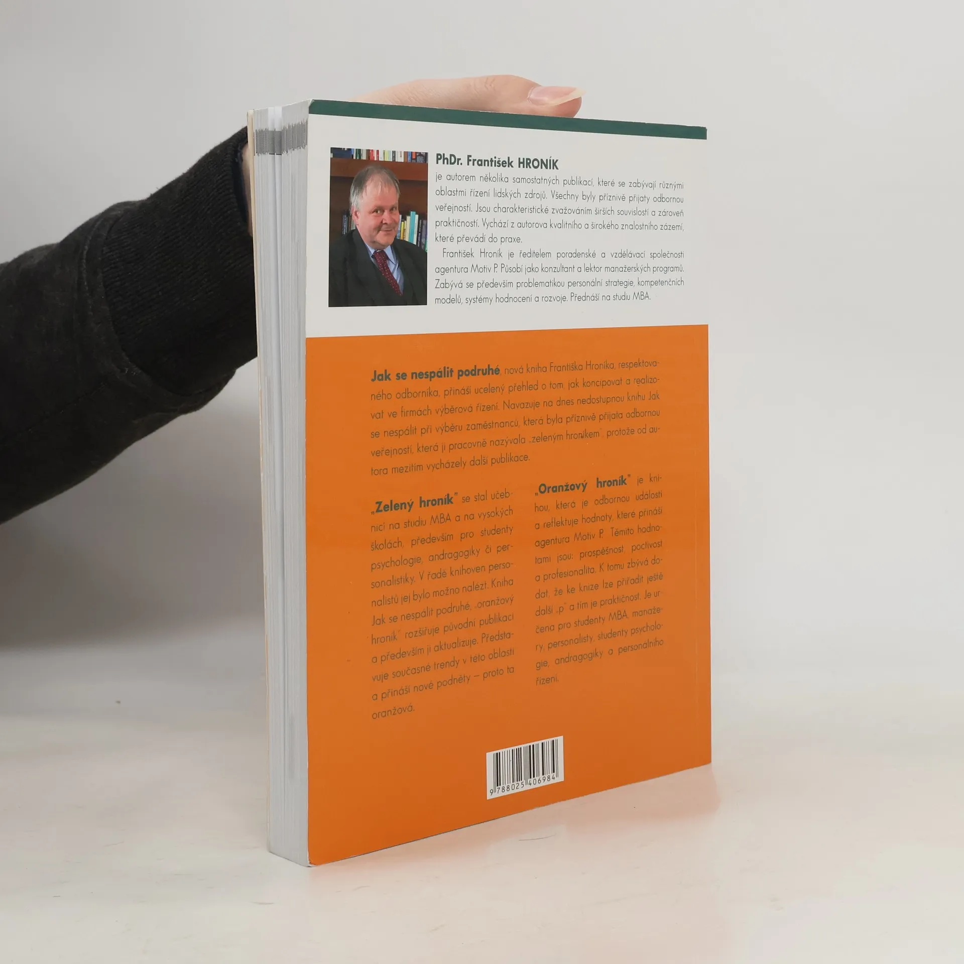 Jak se nespálit podruhé, nová kniha Františka Hroníka, respektovaného odborníka, přináší ucelený přehled o tom, jak koncipovat a realizovat ve firmách výběrové řízení. Navazuje na dnes nedostupnou knihu Jak se nespálit při výběru zaměstnanců, která byla příznivě přijata odbornou veřejností, která ji pracovně nazývala zeleným hroníkem, protože od autora vycházely další publikace. Oranžový hroník je knihou, která je odbornou událostí a reflektuje hodnoty, které přináší agentura Motiv P. Těmito hodnotami jsou: prospěšnost, poctivost a profesionalita. K tomu zbývá dodat, že ke knize lze přidat ještě další p a tím je praktičnost. Je určena pro studenty MBA, manažery, personalisty, studenty psychologie, andragogiky a personálního řízení.