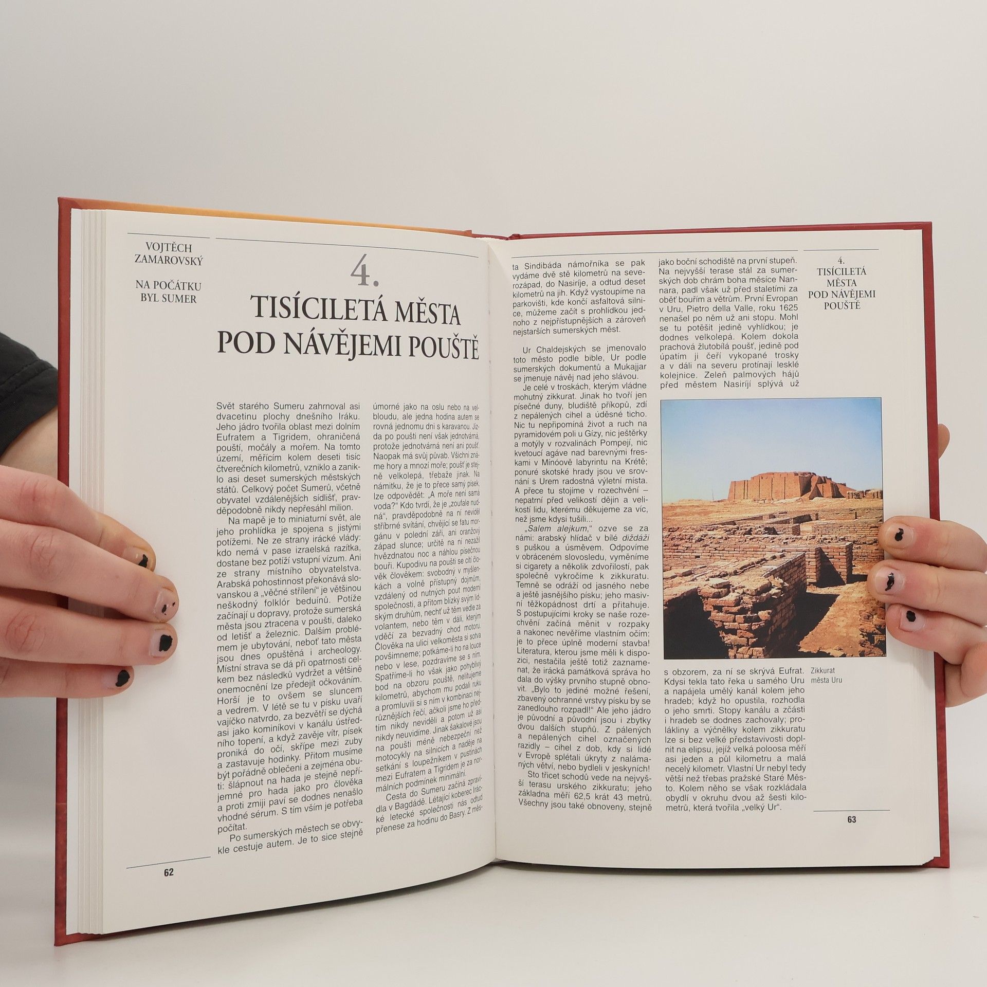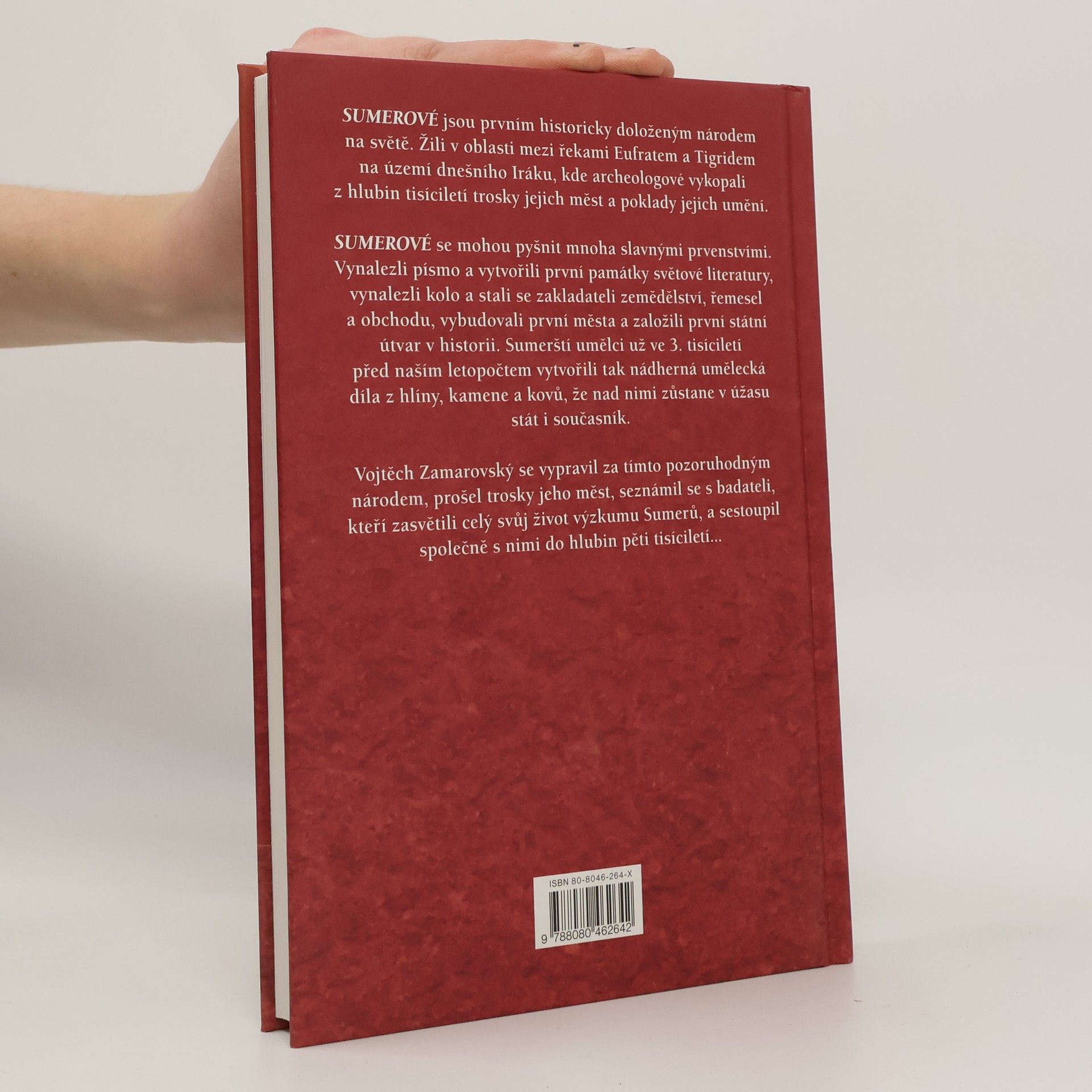 Sumerové, první doložený národ na světě, žili mezi řekami Eufrat a Tigris na území dnešního Iráku; archeologové tu vykopali trosky jejich měst a poklady jejich umění. Sumerové vynalezli písmo i kolo, vytvořili první památky světové literatury, stali se zakladateli zemědělství, řemesel i obchodu, vybudovali první města a založili první státní útvar v historii. Sumerští umělci už ve 3. tisíciletí př. n. l. vytvořili krásná umělecká díla z hlíny, kamene či kovu. Autor se vypravil za tímto pozoruhodným národem, přešel troskami jeho měst, seznámil se se znalci života Sumerů a sestoupil s nimi do hlubin pěti tisíciletí.... celý text