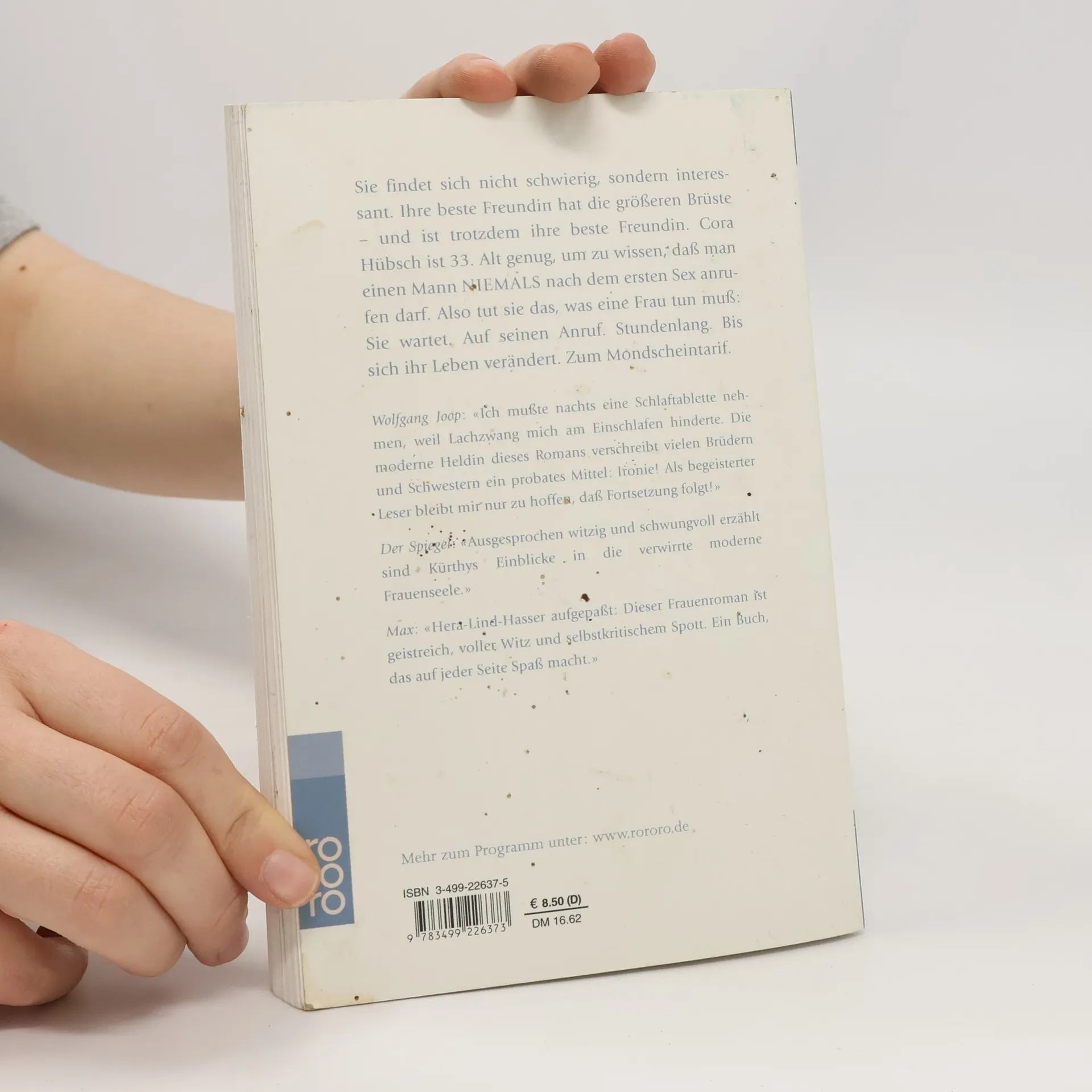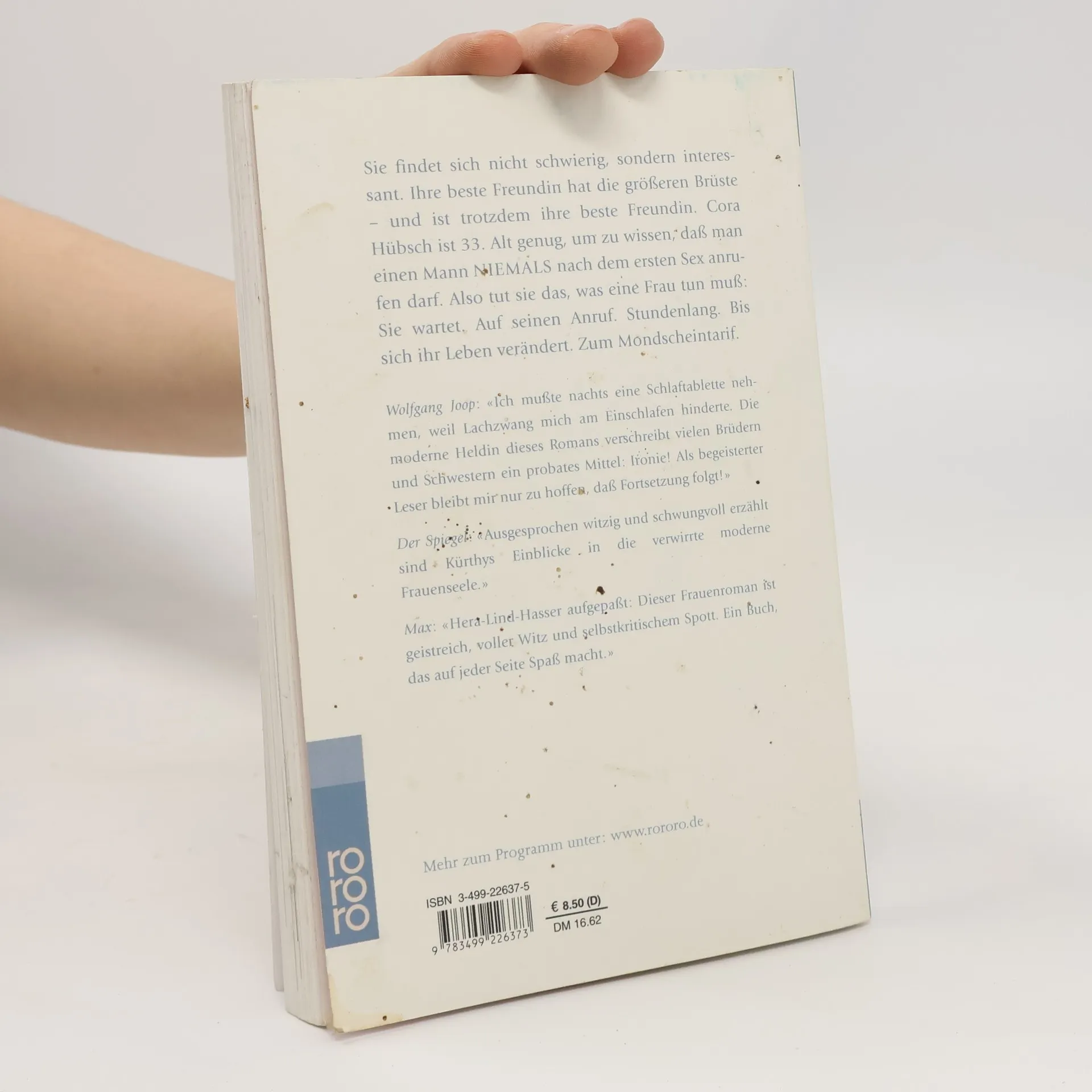 Sie findet sich nicht schwierig, sondern interessant. Ihre beste Freundin hat die größeren Brüste – und ist trotzdem ihre beste Freundin. Cora Hübsch ist 33. Alt genug, um zu wissen, dass man einen Mann niemals nach dem ersten Sex anrufen darf. Also tut sie das, was eine Frau tun muß: Sie wartet. Auf seinen Anruf. Stundenlang. Bis sich ihr Leben verändert. Zum Mondscheintarif.Wolfgang Joop: «Ich musste nachts eine Schlaftablette nehmen, weil Lachzwang mich am Einschlafen hinderte. Die moderne Heldin dieses Romans verschreibt vielen Brüdern und Schwestern ein probates Mittel: Ironie! Als begeisterter Leser bleibt mir nur zu hoffen, dass Fortsetzung folgt!»Der Spiegel: «Ausgesprochen witzig und schwungvoll erzählt sind Kürthys Einblicke in die verwirrte moderne Frauenseele.»Max: «Hera-Lind-Hasser aufgepaßt: Dieser Frauenroman ist geistreich, voller Witz und selbstkritischem Spott. Ein Buch, das auf jeder Seite Spaß macht.»