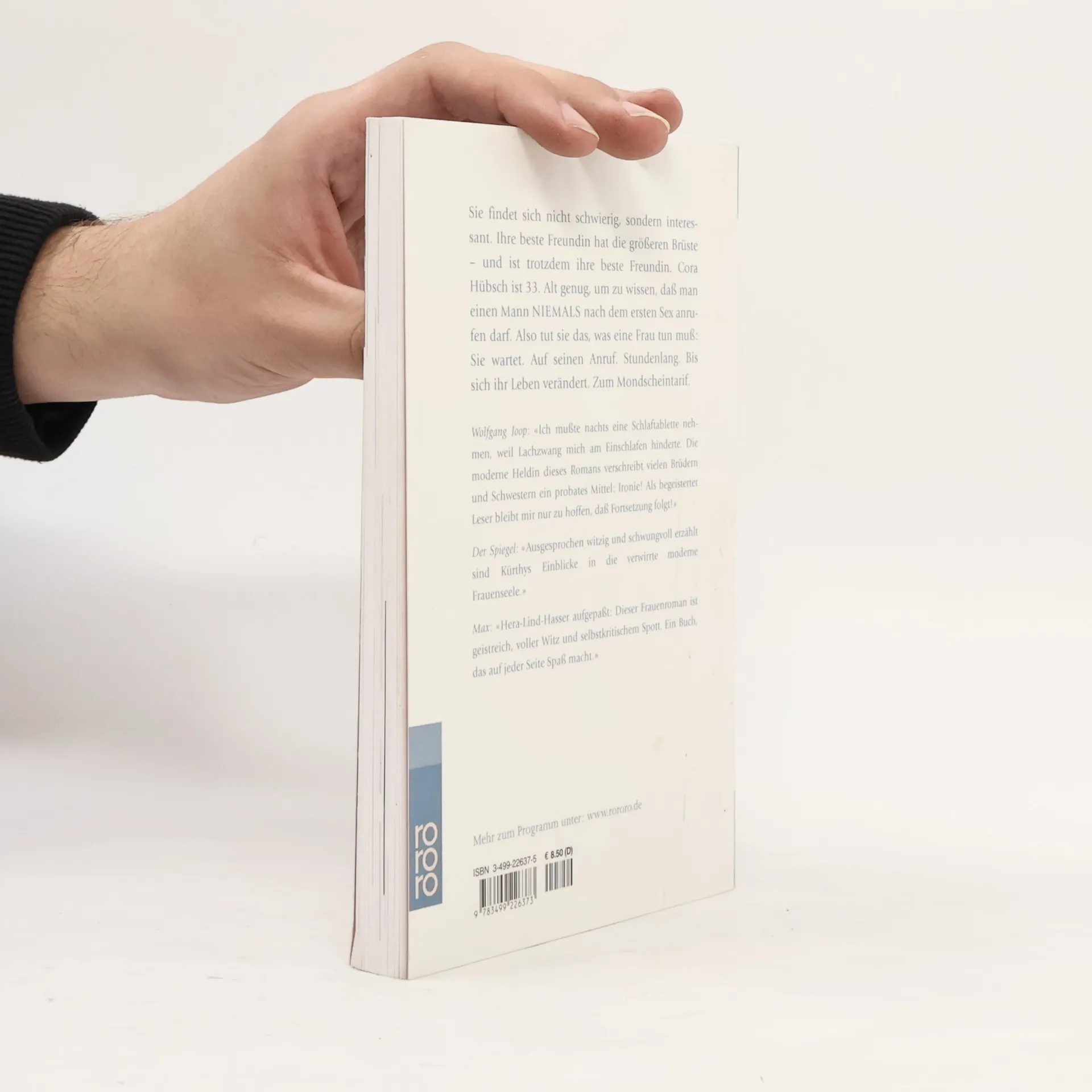 Sie findet sich nicht schwierig, sondern interessant. Ihre beste Freundin hat die größeren Brüste – und ist trotzdem ihre beste Freundin. Cora Hübsch ist 33. Alt genug, um zu wissen, dass man einen Mann niemals nach dem ersten Sex anrufen darf. Also tut sie das, was eine Frau tun muß: Sie wartet. Auf seinen Anruf. Stundenlang. Bis sich ihr Leben verändert. Zum Mondscheintarif.Wolfgang Joop: «Ich musste nachts eine Schlaftablette nehmen, weil Lachzwang mich am Einschlafen hinderte. Die moderne Heldin dieses Romans verschreibt vielen Brüdern und Schwestern ein probates Mittel: Ironie! Als begeisterter Leser bleibt mir nur zu hoffen, dass Fortsetzung folgt!»Der Spiegel: «Ausgesprochen witzig und schwungvoll erzählt sind Kürthys Einblicke in die verwirrte moderne Frauenseele.»Max: «Hera-Lind-Hasser aufgepaßt: Dieser Frauenroman ist geistreich, voller Witz und selbstkritischem Spott. Ein Buch, das auf jeder Seite Spaß macht.»