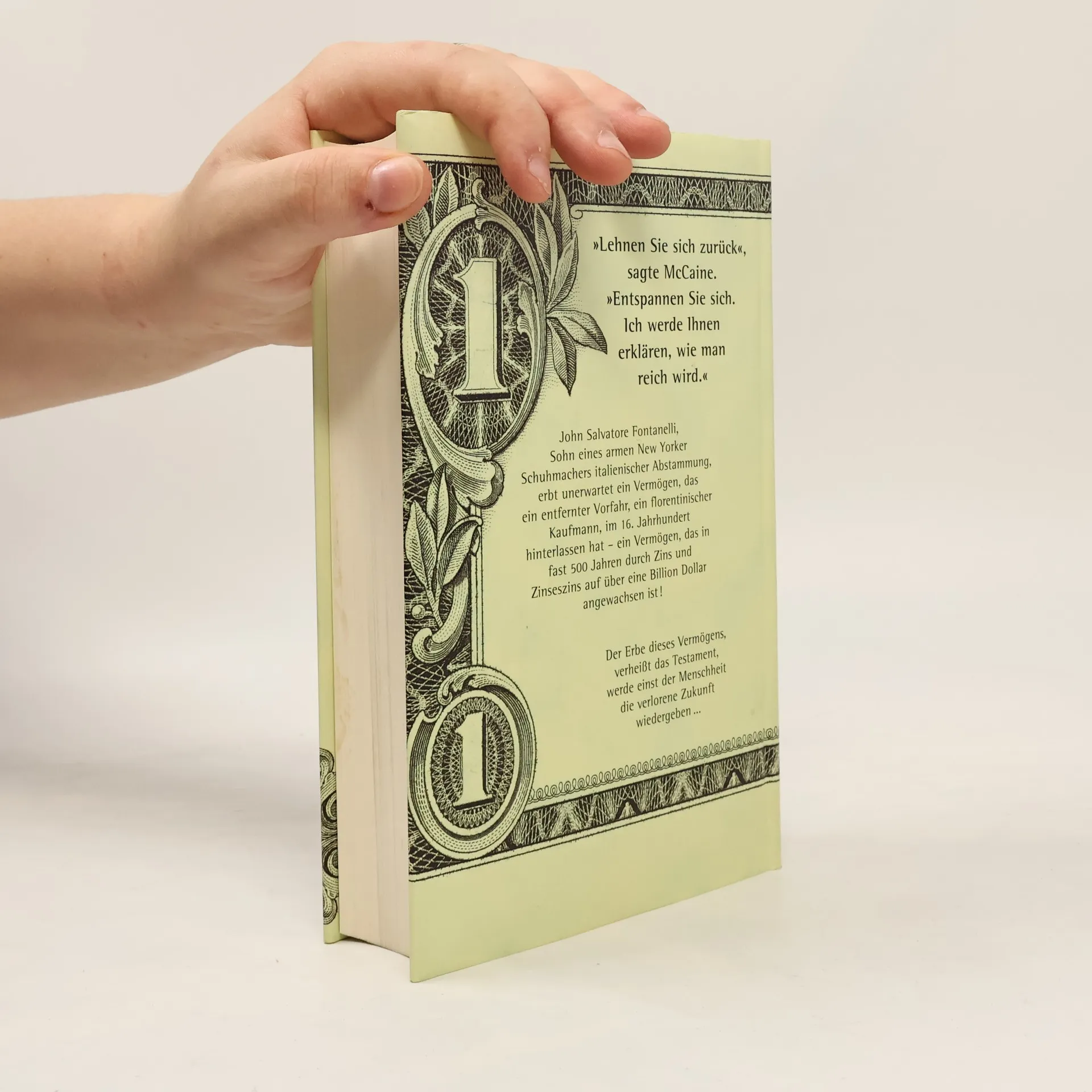 Gestern fuhr John Fontanelli noch Pizzas in New York aus. Heute ist er der reichste Mann der Welt. Reicher als Bill Gates. Reicher als der Sultan von Brunei. Reicher als die britische Königin. Reicher als die zweihundert reichsten Menschen der Erde - zusammen. Eine Billion Dollar. Eine Million Millionen. Mehr Geld, als man sich überhaupt vorstellen kann. Dieses Vermögen hat die italienische Anwaltsfamilie Vacchi fünfhundert Jahre lang angehäuft und bis zu jenem Tag verwaltet, den der Stifter in seinem Testament festgelegt hatte. Und mit diesem Geld kann John machen, was er will. Als Erstes kauft er sich einen Ferrari. „Was wäre, wenn ich mir jetzt nur noch Ferraris kaufen würde?”, fragt er den alten Anwalt. “So viele Ferraris gibt es nicht”, lautet die Antwort. Er legt sich Leibwächter zu und einen Stab von Mitarbeitern, um die anschwellende Korrespondenz zu bewältigen. Er verhandelt mit dem italienischen Finanzminister. Ein leibhaftiger Kardinal kommt als Bittsteller an seine Tür. Die schönsten Frauen liegen ihm zu Füßen. Aber kann er noch irgendjemandem trauen? Und dann erhält er einen Anruf von einem geheimnisvollen Fremden. Sein Name ist Malcolm McCaine, und er behauptet zu wissen, was es mit dem Geld auf sich hat - und wie es verwendet werden soll. Doch welcher Plan steckt hinter der Stiftung des Giacomo Fontanelli, und ist John wirklich dazu ausersehen, ihn zu erfüllen?