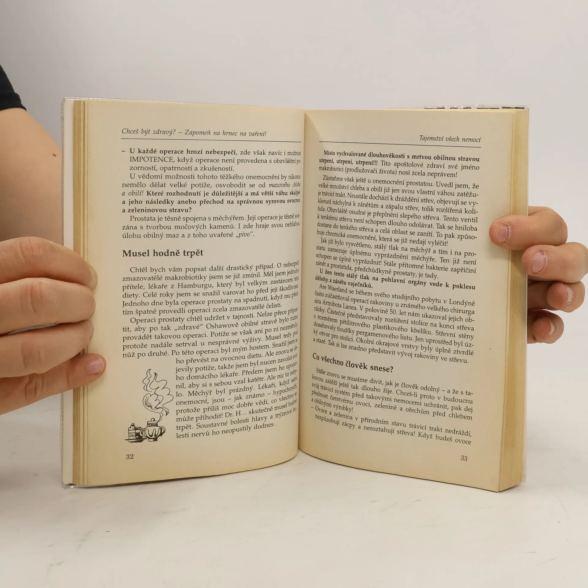Vrať se ke zdravým původním pokrmům, pak se okamžitě zbavíš nadváhy! Staneš se štíhlým a také jím zůstaneš i bez hladovek. Krevní tlak se ti sníží na ideální hodnoty. Hladiny tuků a cholesterolu v krvi zaniknou. Můžeš zapomenout na počítání kalorií. Prostřednictvím průdušek, hltanu a nosu tvé tělo houfně opustí veškeré výměšky (hlen a další odpadní produkty). Zbavíš se nachlazení a bolestí hlavy.