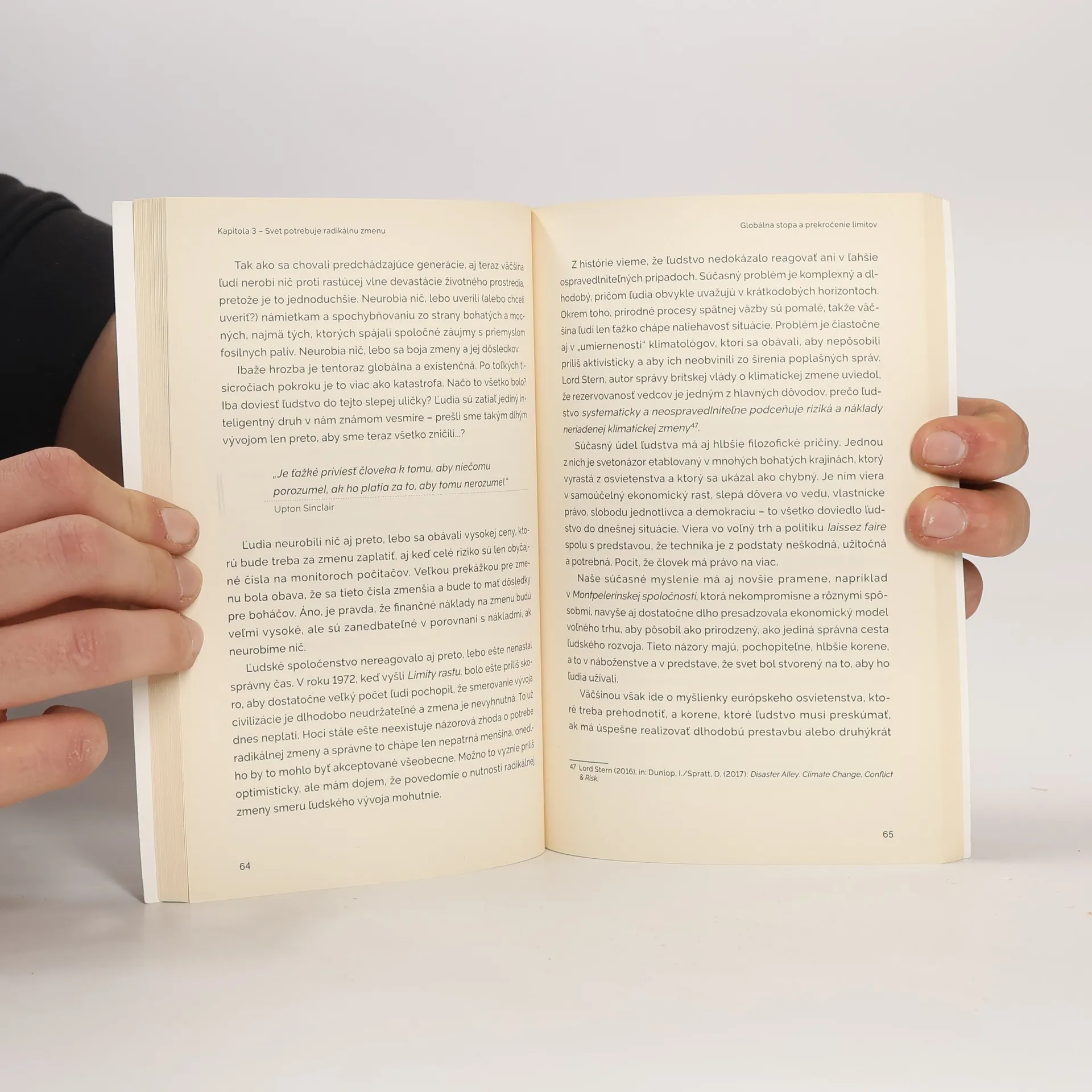 Od prvej správy Rímskeho klubu (Limity rastu) sa hospodárska politika štátov, pred ktorou vedci varovali, v ničom zásadnom nezmenila – ostala závislá od rastu spotreby neobnoviteľných prírodných zdrojov a spôsobila obrovské znečistenie životného prostredia. Konzumná civilizácia sa tak dostala do situácie, keď vzájomná synergia globálnych problémov znemožňuje ďalšie pokračovanie vývoja ľudstva. Ľudí čaká radikálne odlišná budúcnosť, než na akú ich tradične pripravuje rodina, školský systém, médiá a reklama. Kniha ponúka orientáciu v kríze dnešného sveta a naznačuje systémové riešenia. Hlavné témy: klimatická zmena, transformácia ekonomiky a systému kultúry.