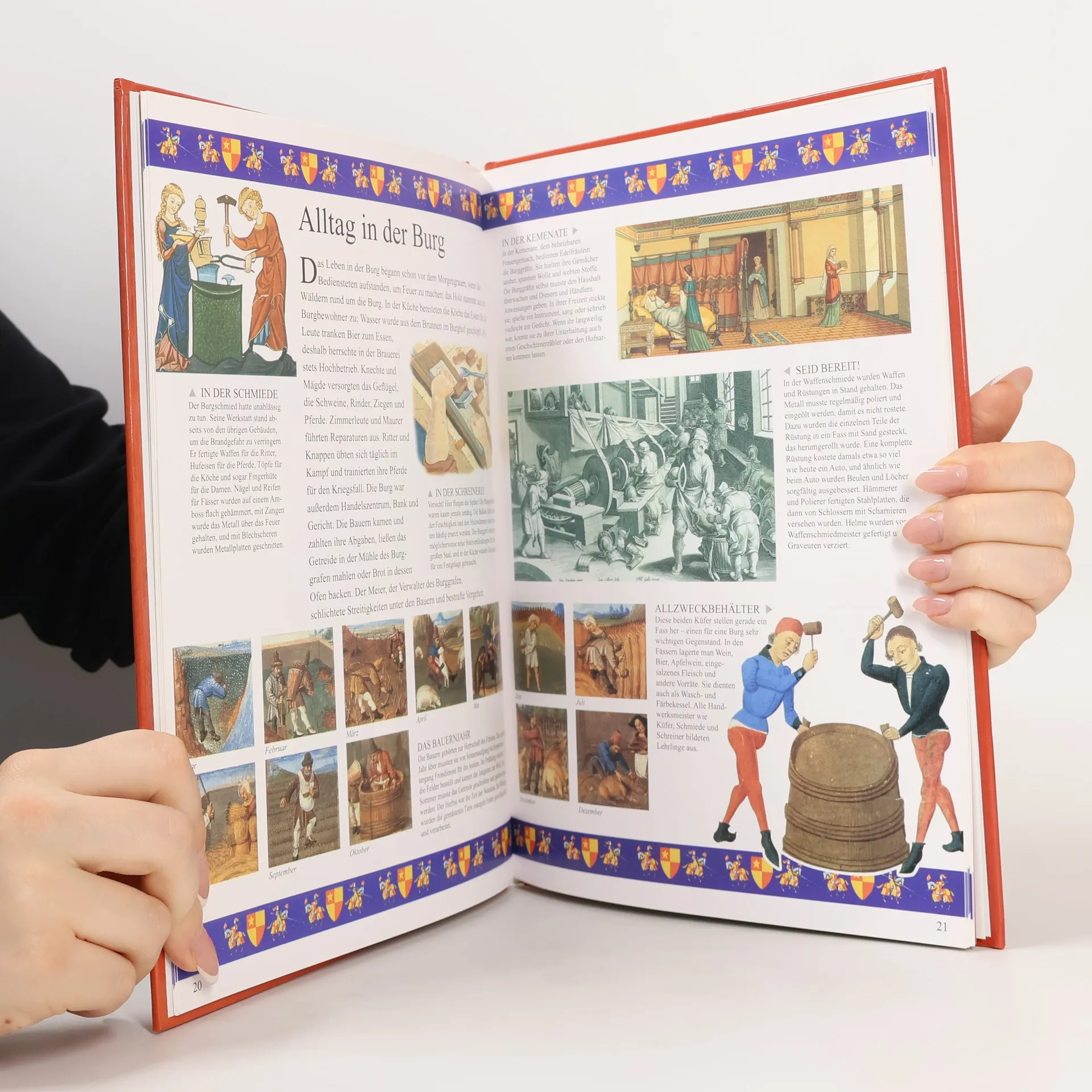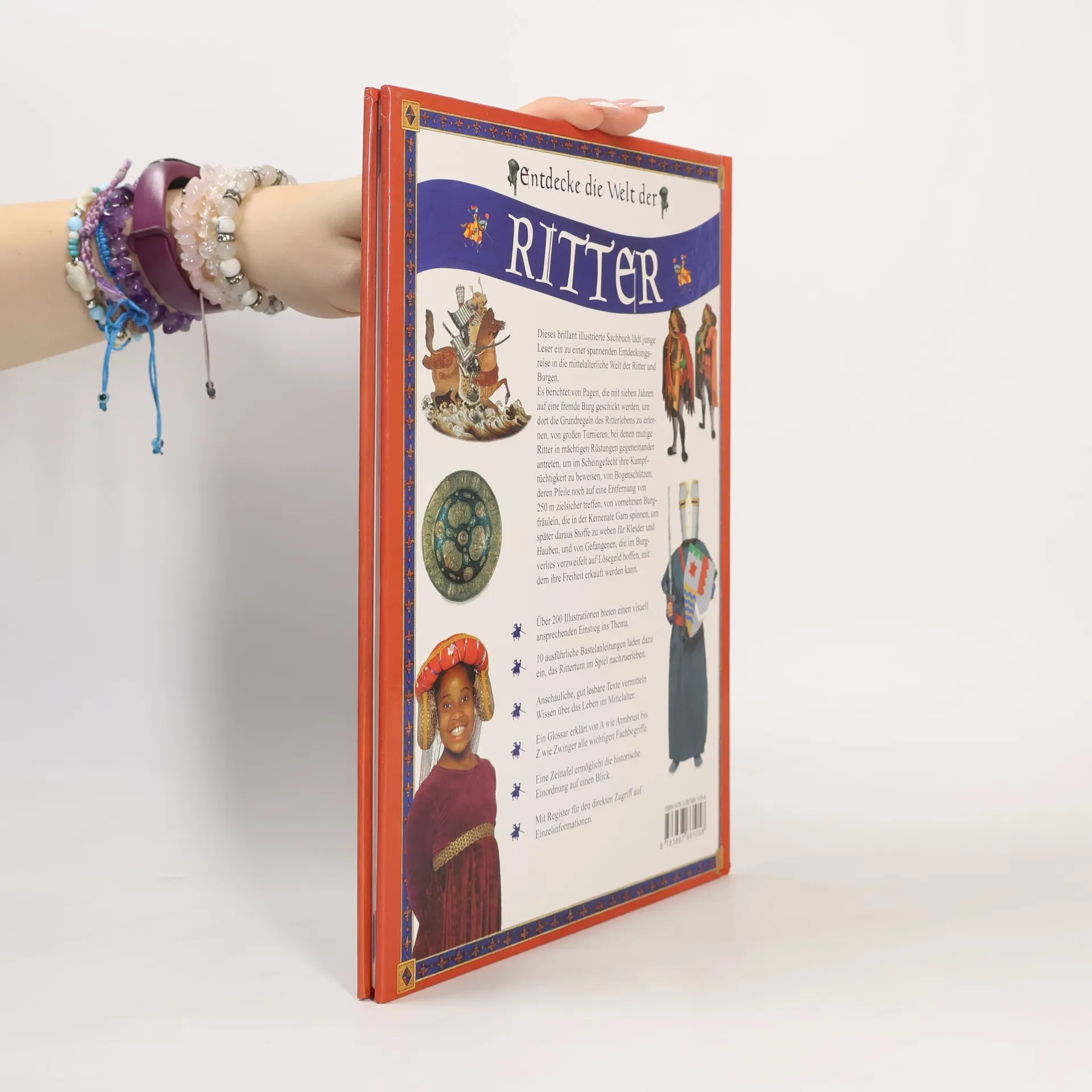 Dieses brilliant illustrierte Sachbuch lädt junge Leser ein zu einer spannenden Entdeckungsreise in die mittelalterliche Welt der Ritter und Burgen. Es berichtet von Pagen, die mit 7 Jahren auf eine fremde Burg geschickt werden, um dort die Grundregeln des Ritterlebens zu erlernen, von großen Turnieren, bei denen mutige Ritter in mächtigen Rüstungen gegeneinander antreten, um im Scheingefecht ihre Kampftüchtigkeit zu beweisen, von Bogenschützen, deren Pfeile noch auf eine Entfernung von 250m zielsicher treffen, von vornehmen Burgfreulein, die in der Kemenate Garn spinnen, um später daraus Stoffe zu weben für Kleider und Hauben, und von Gefangenen, die im Burgverlies verzweifelt auf Lösegeld hoffen, mit dem ihre Freiheit erkauft werden kann.