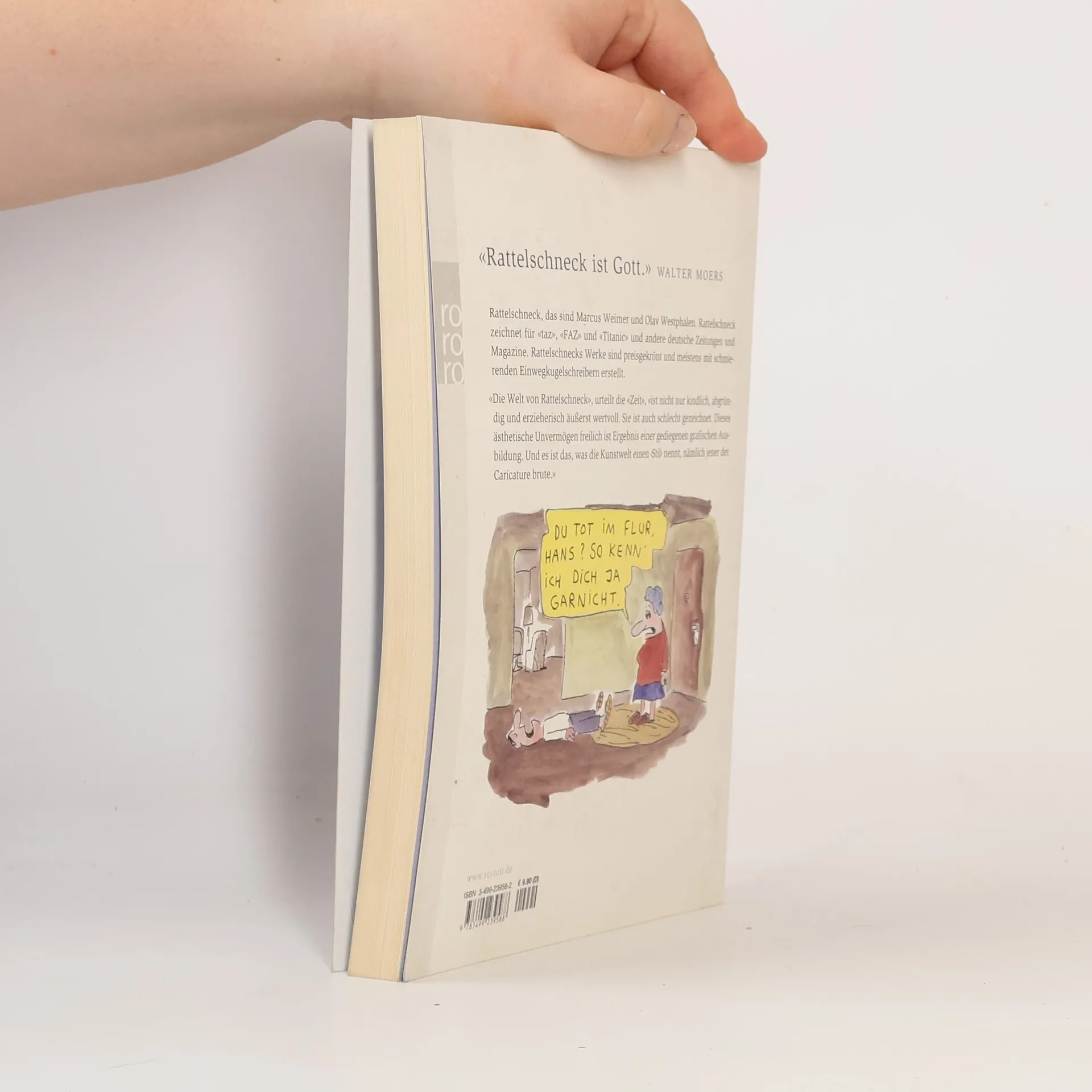 „Rattelschneck ist Gott“ (Walter Moers) Rattelschneck, das sind Marcus Weimer und Olav Westphalen. Rattelschneck zeichnet für taz, FAZ und Titanic und andere deutsche Zeitungen und Magazine. Rattelschnecks Werke sind preisgekrönt und meistens mit schmierenden Einwegkugelschreibern erstellt. „Die Welt von Rattelschneck“, urteilt die Zeit, „ist nicht nur kindlich, abgründig und erzieherisch äusserst wertvoll. Sie ist auch schlecht gezeichnet. Dieses ästhetische Unvermögen freilich ist Ergebnis einer gediegenen grafischen Ausbildung. Und es ist das, was die Kunstwelt einen ‚Stil’ nennt, nämlich jener der Caricature brute.“