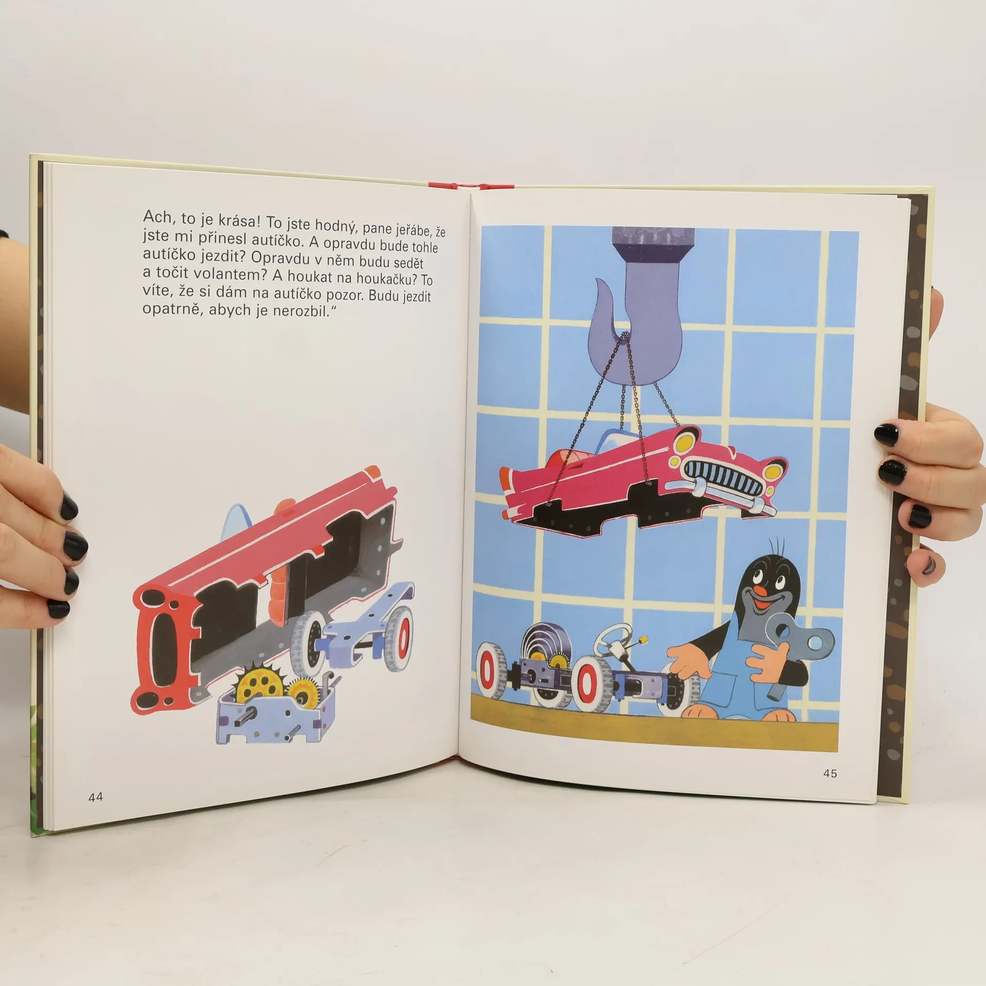 Krteček by si přál autíčko, snaží se ho sestavit, ale přes veškerou snahu auto pořád nejede. Pak objeví odhozené, polámané autíčko. Kamarádka myška pomůže jako vždy. Poradí mu, kde si má dát autíčko na klíček opravit – a pak už se krásně povozí.