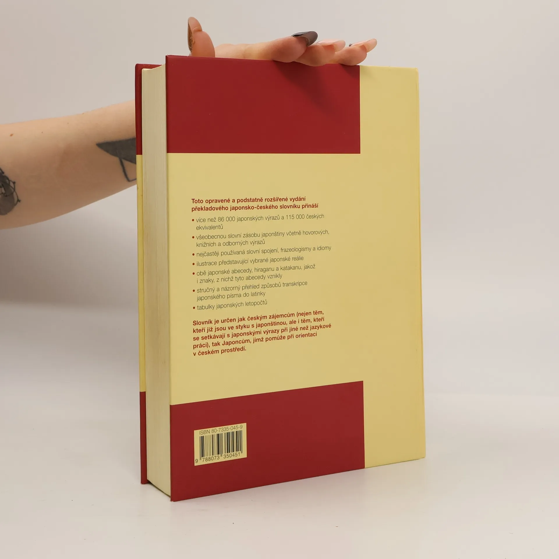 Toto opravené a podstatně rozšířené vydání překladového japonsko-českého slovníku přináší• více než 86 000 japonských výrazů a 115 000 českých ekvivalentů• všeobecnou slovní zásobu japonštiny včetně hovorových, knižních a odborných výrazů• nejčastěji používaná slovní spojení, frazeologismy a idiomy• ilustrace představující vybrané japonské reálie• obě japonské abecedy, hiraganu a katakanu, jakož i znaky, z nichž tyto abecedy vznikly• stručný a názorný přehled způsobů transkripce japonského písma do latinky• tabulky japonských letopočtůSlovník je určen jak českým zájemcům (nejen těm, kteří již jsou ve styku s japonštinou, ale i těm, kteří se setkávají s japonskými výrazy při jiné než jazykové práci), tak Japoncům, jimž pomůže při orientaci v českém prostředí.Grafická úprava a zhotovení litografií DTP Futura, s.r.o.Druhé, opravené a rozšířené vydání.V nakladatelství LEDA první vydání.