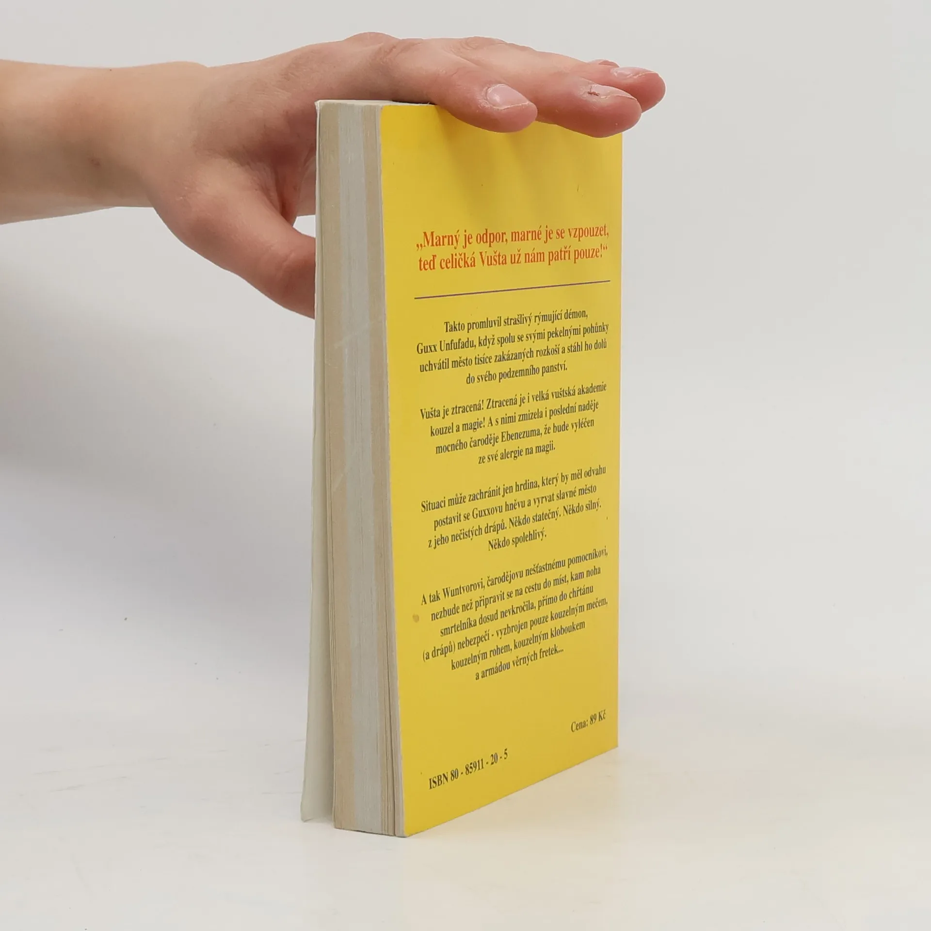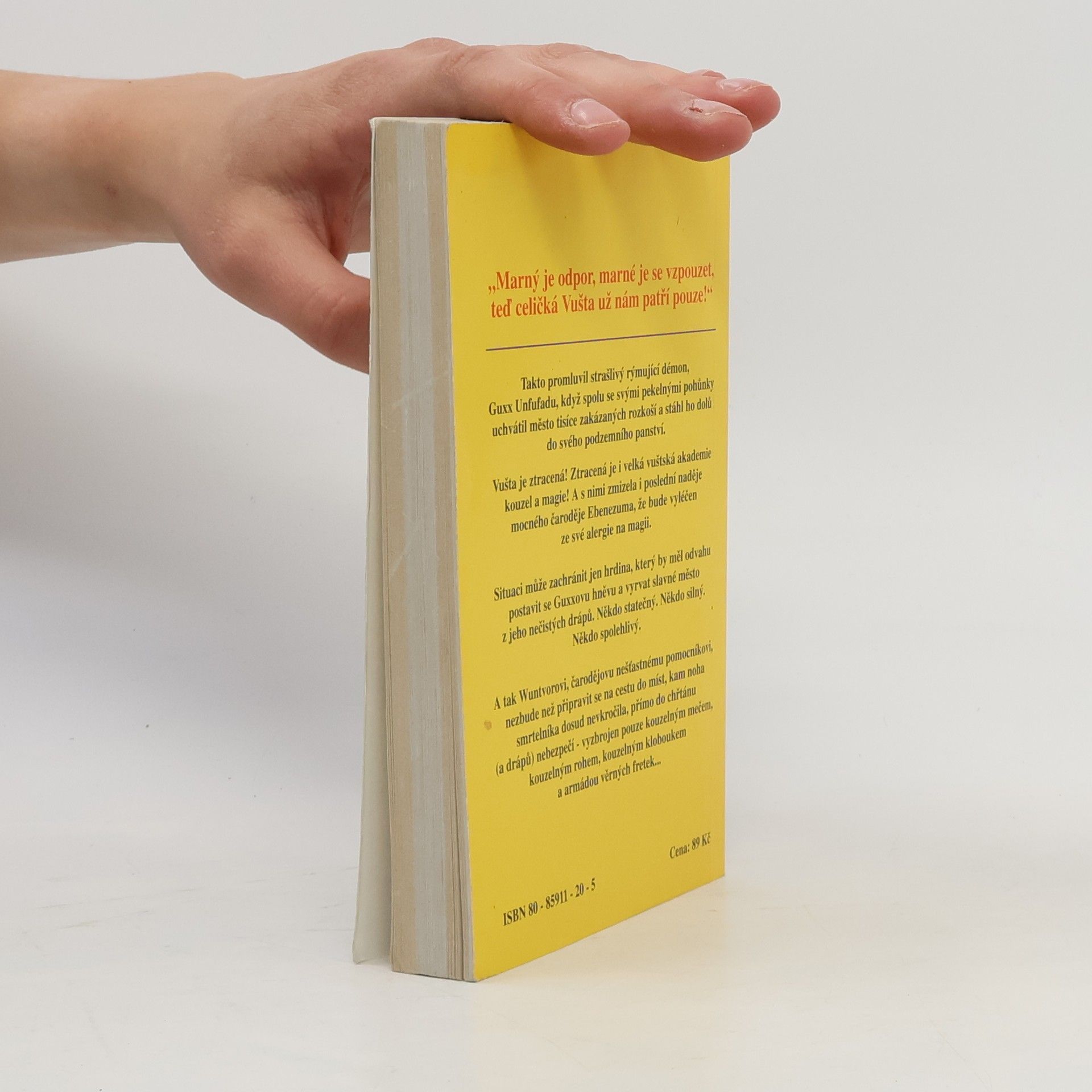 Třetí kniha trilogie Ebenezum. "Marný je odpor, marné je se vzpouzet, teď celičká Vušta už nám patří pouze!" Takto promluvil strašlivý rýmující démon, Guxx Unfufadu, když spolu se svými pekelnými pohůnky uchvátil město tisíce zakázaných rozkoší a stáhl ho dolů do svého podzemního panství. Vušta je ztracená! Ztracená je i velká vuštská akademie kouzel a magie! A s nimi zmizela i poslední naděje mocného čaroděje Ebenezuma, že bude vyléčen za své alergie na magii. Situaci může zachránit jen hrdina, který by měl odvahu postavit se Guxxovu hněvu a vyrvat slavné město z jeho nečistých drápů. Někdo statečný. Někdo silný. Někdo spolehlivý. A tak Wuntvorovi, čarodějovu nešťastnému pomocníkovi, nezbude než připravit se na cestu do míst, kam noha smrtelníka dosud nevkročila, přímo do chřtánu (a drápů) nebezpečí - vyzbrojen pouze kouzelným mečem, kouzelným rohem, kouzelným kloboukem a armádou věrných fretek...