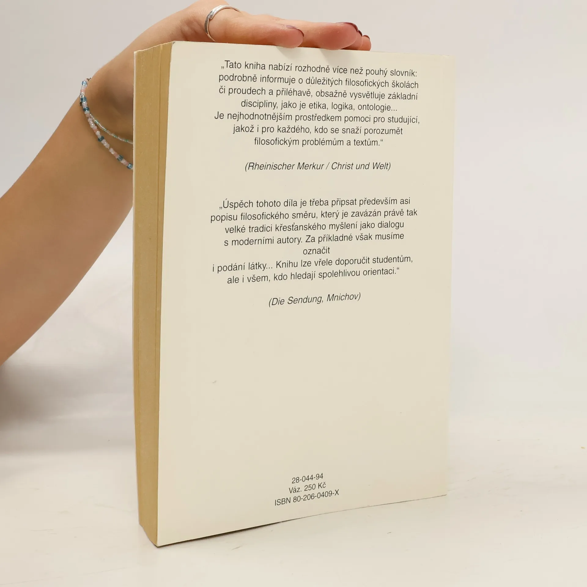 „Tato kniha nabízí rozhodně více než pouhý slovník: podrobně informuje o důležitých filosofických školách či proudech a přiléhavě, obsažně vysvětluje základní discipliny, jako je etika, logika, ontologie... Je nejhodnotnějším prostředkem pomoci pro studující, jakož i pro každého, kdo se snaží porozumět filosofickým problémům a textům." (Rheinischer Merkur / Christ und Welt) „Úspěch tohoto díla je třeba připsat především asi popisu filosofického směru, který je zavázán právě tak velké tradici křesťanského myšlení jako dialogu s moderními autory. Za příkladné však musíme označit i podání látky... Knihu lze vřele doporučit studentům, ale i všem, kdo hledají spolehlivou orientaci." (Die Sendung, Mnichov)... celý text