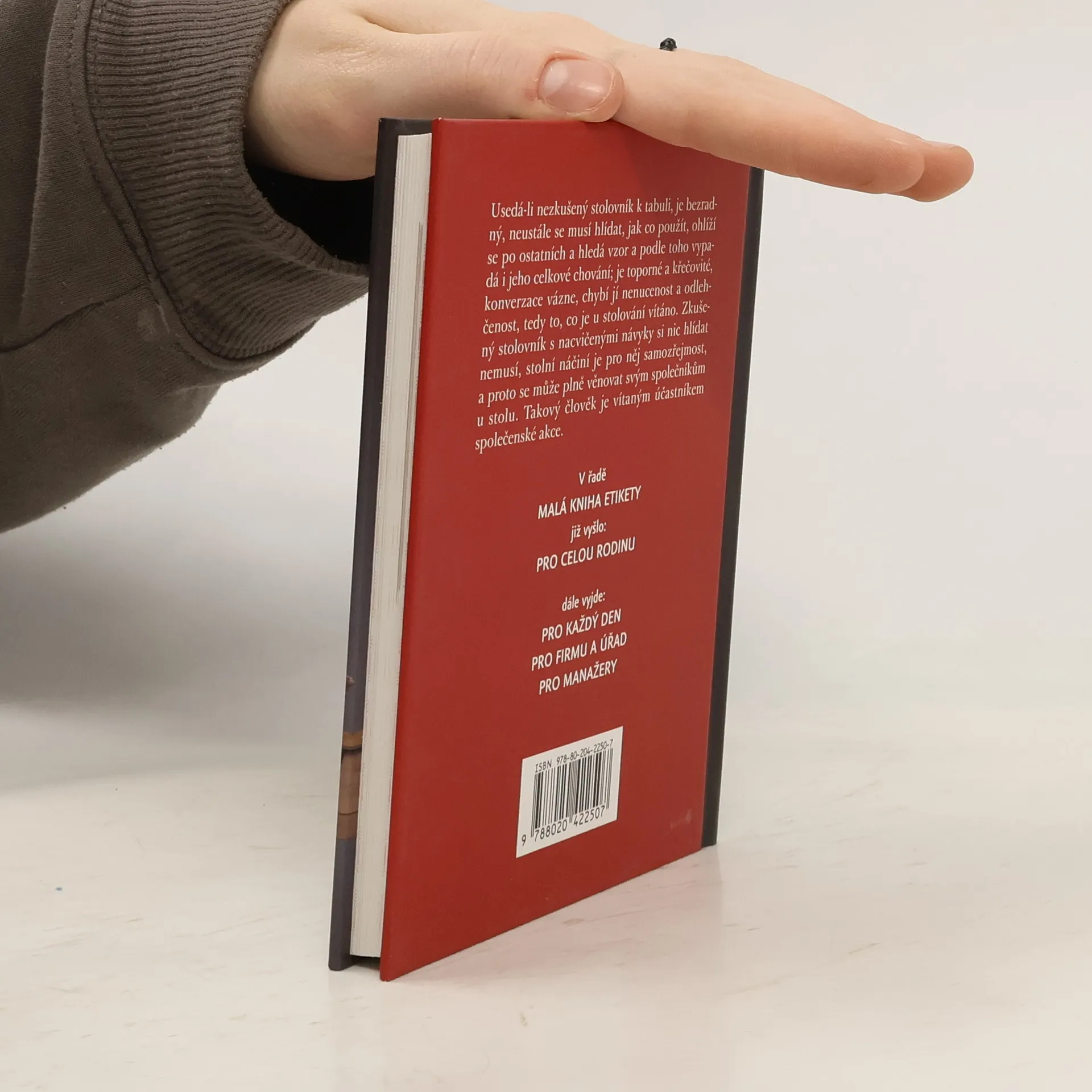 Malá kniha etikety u stolu je druhým dílem série malých a praktických rádců z pera Ladislava Špačka. Tu by si měli přečíst všichni bez ohledu na věk a společenské postavení, protože právě při stolování se projeví, jak je kdo zběhlý ve společenském životě. Seznámíme se s pravidly zasedacího pořádku, se správným chováním u stolu, dozvíme se, jak správně prostřít, jak nakládat s ubrouskem, jak držet příbor, jak jíst polévku, krevety, mušle, těstoviny, co s párátkem. V závěru se dozvíme více o různých typech stolování - banketu, rautu, nebo u nás méně známý revéllion.