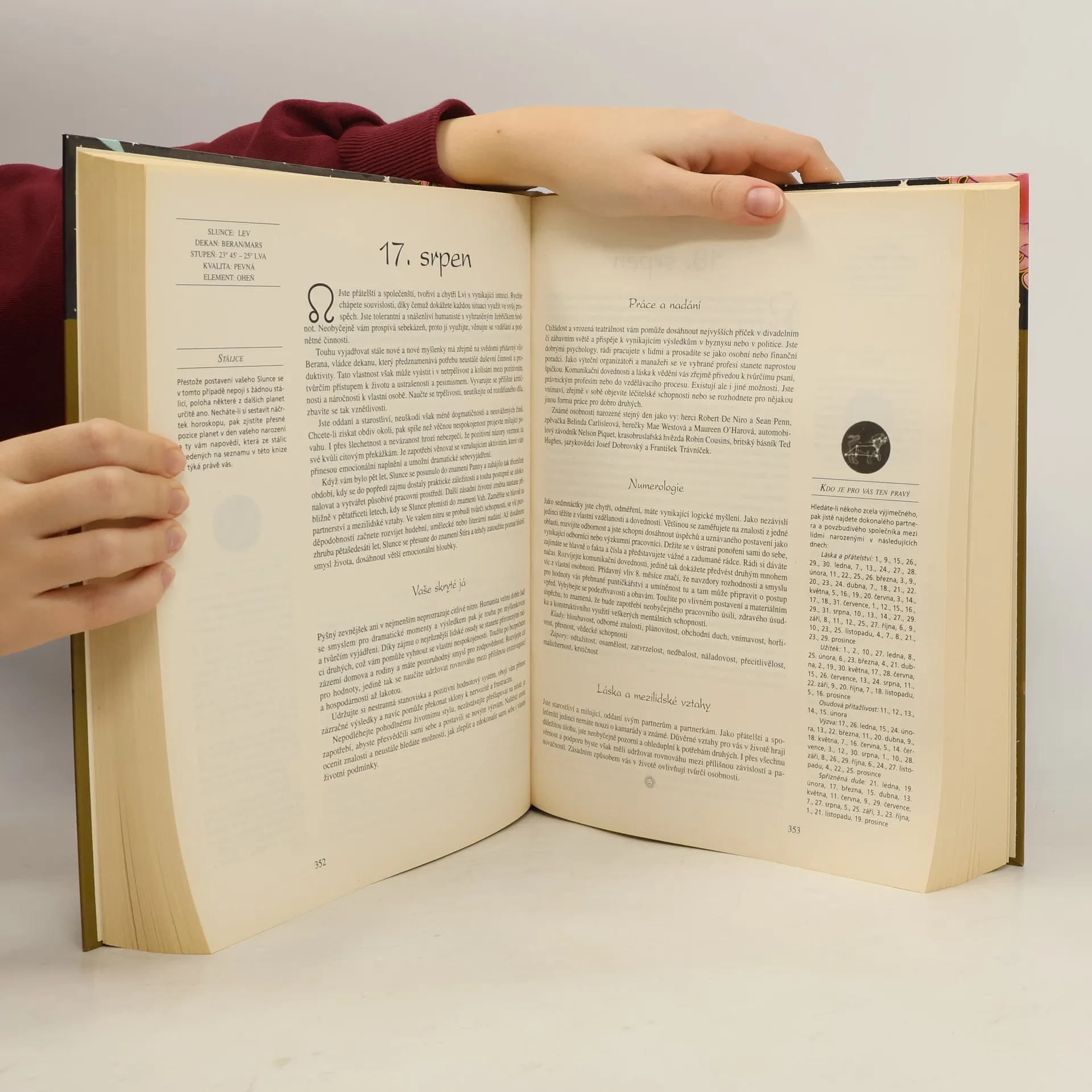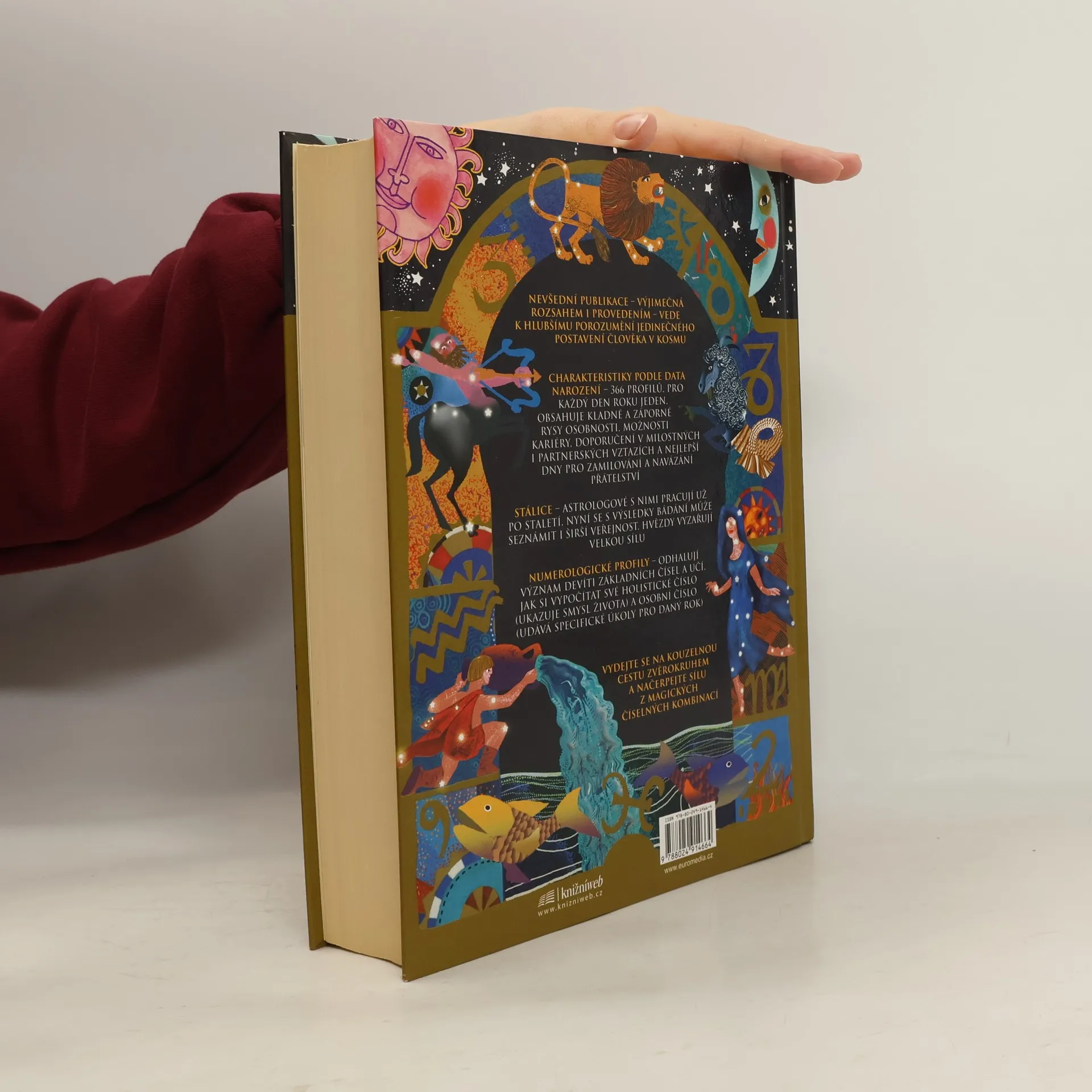 Nevšední publikace - výjimečná rozsahem i provedením - vede k hlubšímu porozumění jedinečného postavení člověka v kosmu. Charakteristiky podle data narození - 366 profilů, pro každý den roku jeden, obsahuje kladné a záporné rysy osobnosti, možnosti kariéry, doporučení v milostných i partnerských vztazích a nejlepší dny pro zamilování a navázání přátelství. Numerologické profily - odhalují význam devíti základních čísel a učí, jak si vypočítat své holistické číslo (ukazuje smysl života) a osobní číslo (udává specifické úkoly pro daný rok). Vydejte se na kouzelnou cestu zvěrokruhem a načerpejte sílu z magických číselných kombinací.
