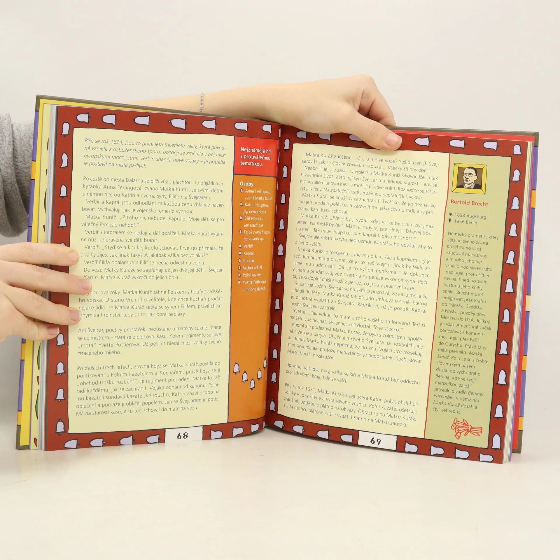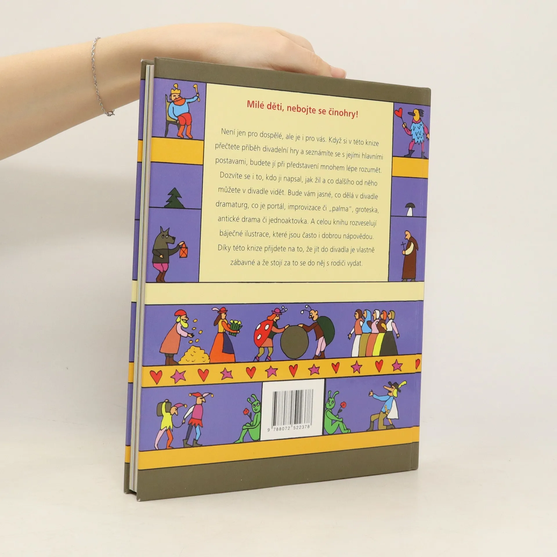 Cyrano de Bergerac, Hamlet, Romeo a Julie, Lakomec nebo Revizor. Životní profily nejvýznamnějších autorů, jako jsou William Shakespeare, Johann Wolfgang von Goethe, Molière nebo Karel Čapek. Slovníček pojmů: Vysvětlení divadelních termínů, např. kdo je scénograf, dramaturg, nebo co znamená komedie, ferman či foyer. Výtvarné provedení: Kniha je ilustrována typickou kresbou a pop-artovou barevností od Jiřího Votruby. Informace o divadle: Seznámení s fungováním divadelního světa, včetně známých divadelních domů a festivalů. Cílová skupina: Děti od zhruba deseti let. Rodiče a učitelé na základních, středních a konzervatořích.