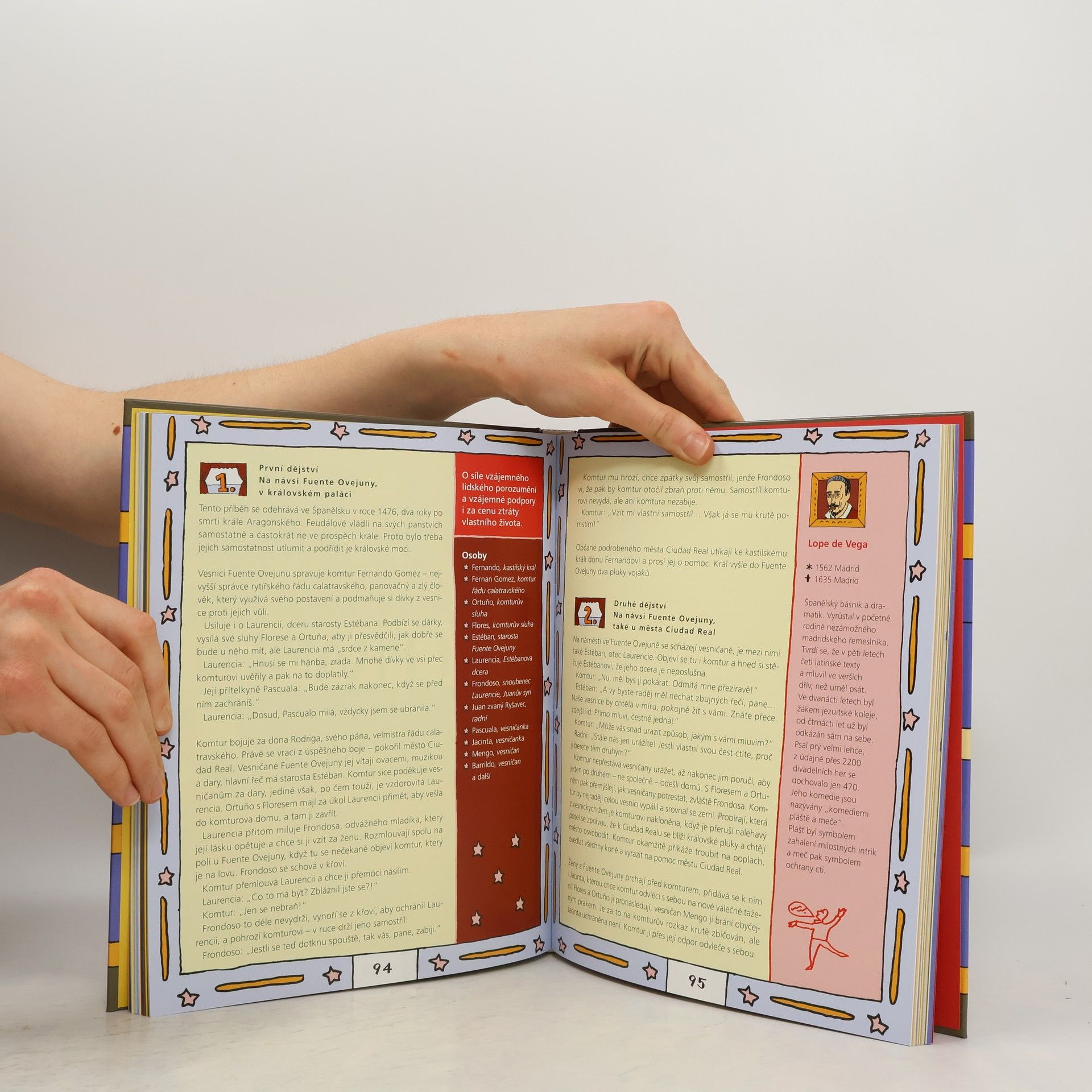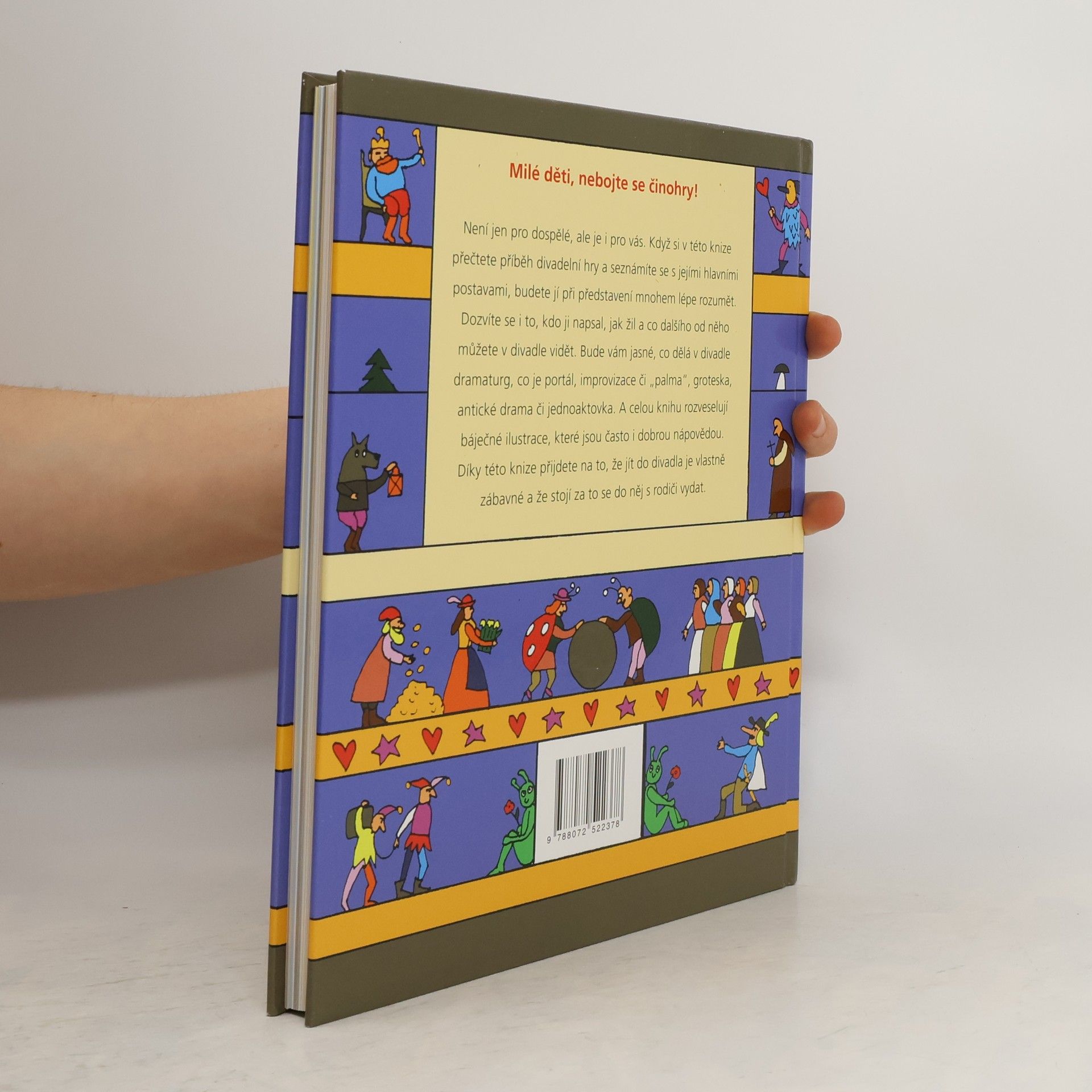 Cyrano de Bergerac, Hamlet, Romeo a Julie, Lakomec nebo Revizor. Životní profily nejvýznamnějších autorů, jako jsou William Shakespeare, Johann Wolfgang von Goethe, Molière nebo Karel Čapek. Slovníček pojmů: Vysvětlení divadelních termínů, např. kdo je scénograf, dramaturg, nebo co znamená komedie, ferman či foyer. Výtvarné provedení: Kniha je ilustrována typickou kresbou a pop-artovou barevností od Jiřího Votruby. Informace o divadle: Seznámení s fungováním divadelního světa, včetně známých divadelních domů a festivalů. Cílová skupina: Děti od zhruba deseti let. Rodiče a učitelé na základních, středních a konzervatořích.