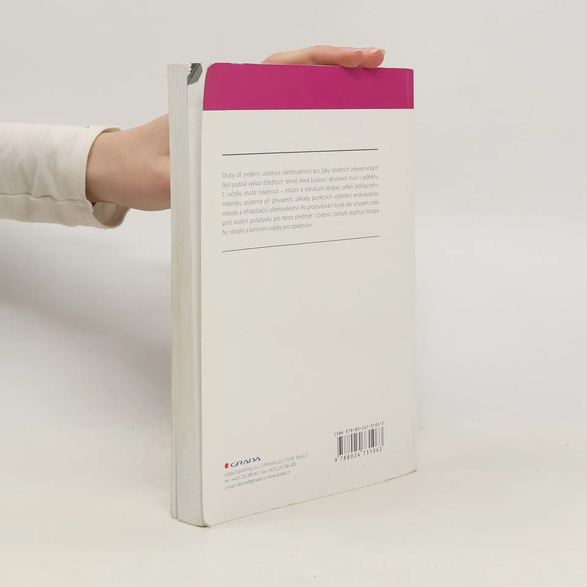 Druhý díl učebnice ošetřovatelství pro 2. ročníky splňuje požadavky žáků i vyučujících na středních zdravotnických školách. Jako jediná učebnice na trhu je připravena přímo pro žáky oborů na SZŠ. Učebnice je určena 2. ročníkům studia, navazuje na 1. díl pro 2. ročník a na úspěšnou učebnici ošetřovatelství pro 1. ročník. Zahrnuje náročnou látku se všemi tématy, která musí žák v průběhu 2. ročníku studia zvládnout. Po prostudování bude žák schopen zcela plnit studijní požadavky pro tento předmět. Učebnici bohatě doplňují fotografie a obrázky, kontrolní otázky pro opakování a výčet kompetencí pro absolventy středních zdravotnických škol. Tak jako učebnici pro 1. ročník je i tato publikace doplněna další učební pomůckou - pracovními sešity, které slouží k procvičení a upevnění znalostí získaných v obou dílech učebnic pro 2. ročník.