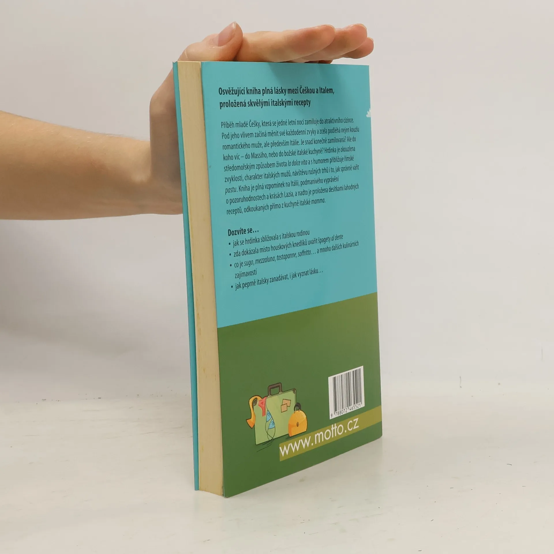 Příběh mladé Češky, která se jedné letní noci zamiluje do atraktivního cizince. Pod jeho vlivem začíná měnit své každodenní zvyky a zcela podléhá nejen kouzlu romantického muže, ale především Itálie. Je snad konečně zamilovaná? Ale do koho víc – do Massiho nebo do božské italské kuchyně? Hrdinka je okouzlena středomořským způsobem života la dolce vita a s humorem přibližuje římské zvyklosti, charakter italských mužů, návštěvu rušných trhů, i to, jak správně vařit pastu. Kniha je plná vzpomínek na Itálii, podmanivého vyprávění o pozoruhodnostech a krásách Lazia, a nadto je proložena desítkami lahodných receptů odkoukaných přímo z kuchyně italské mamma.