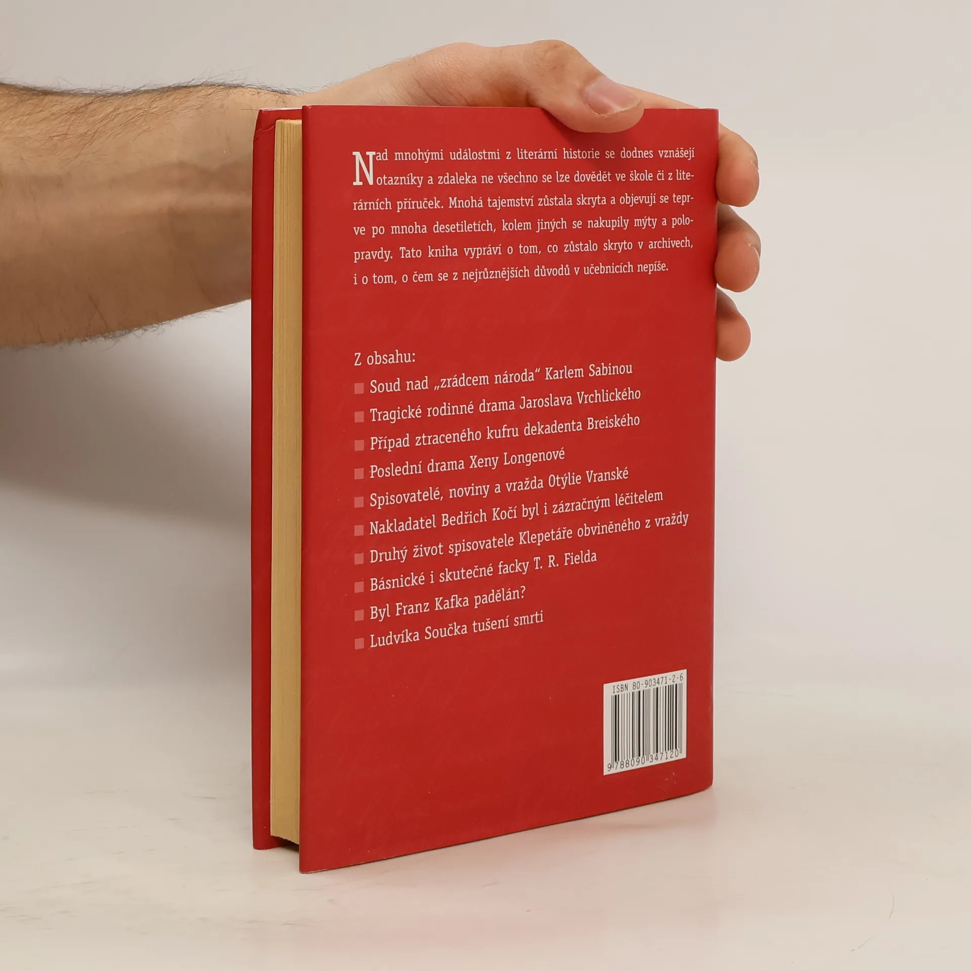 Autor se věnuje událostem z literární historie, nad kterými se dodnes vznášejí otazníky. Vypráví o tom, co zůstalo skryto v archivech, i o tom, o čem se z nejrůznějších důvodů v učebnicích nepíše. Z OBSAHU: Soud nad "zrádcem národa" Karlem Sabinou/ Tragické rodinné drama Jaroslava Vrchlického/ Případ ztraceného kufru dekadenta Breiského/ Poslední drama Xeny Longenové/ Spisovatelé, noviny a vražda Otýlie Vranské/ Básnické i skutečné facky T. R. Fielda/ Byl Franz Kafka padělán?/ Ludvíka Součka tušení smrti/ ...
