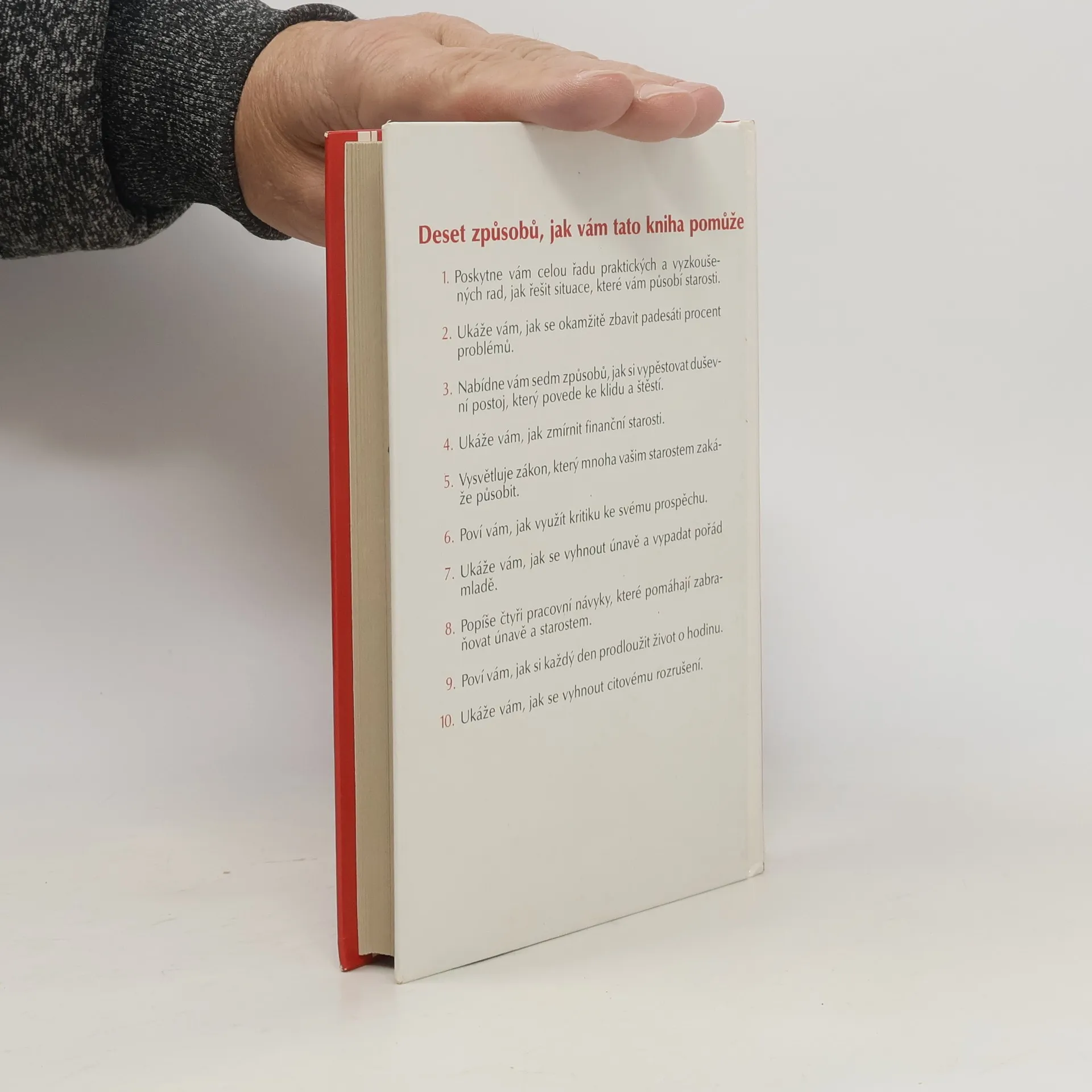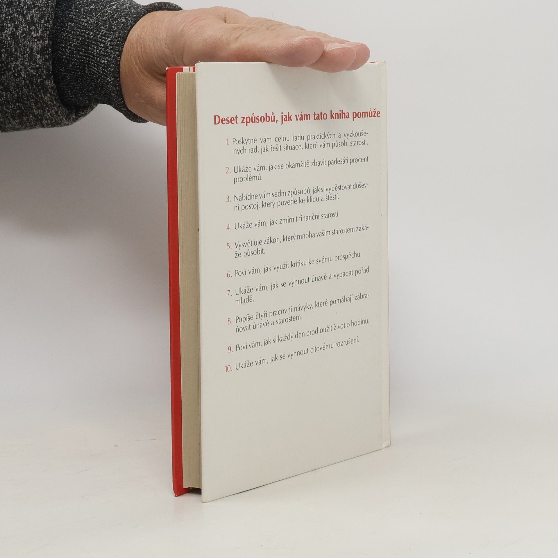 Deset způsobů, jak vám tato kniha pomůže: 1. Poskytne vám celou řadu praktických a vyzkoušených rad, jak řešit situace, které vám působí starosti. 2. Ukáže vám, jak se okamžitě zbavit padesáti procent problémů. 3. Nabídne vám sedm způsobů, jak si vypěstovat duševní postoj, který povede ke klidu a štěstí. 4. Ukáže Vám, jak zmírnit finanční starosti. 5. Vysvětluje zákon, který mnoha vašim starostem zakáže působit. 6. Poví vám, jak využít kritiku ke svému prospěchu. 7. Ukáže vám, jak se vyhnout únavě a vypadat pořád mladě. 8. Popíše čtyři pracovní návyky, které pomáhají zabraňovat únavě a starostem. 9. Poví vám, jak si každý den prodloužit život o hodinu. 10. Ukáže vám, jak se vyhnout citovému rozrušení. (méně textu)