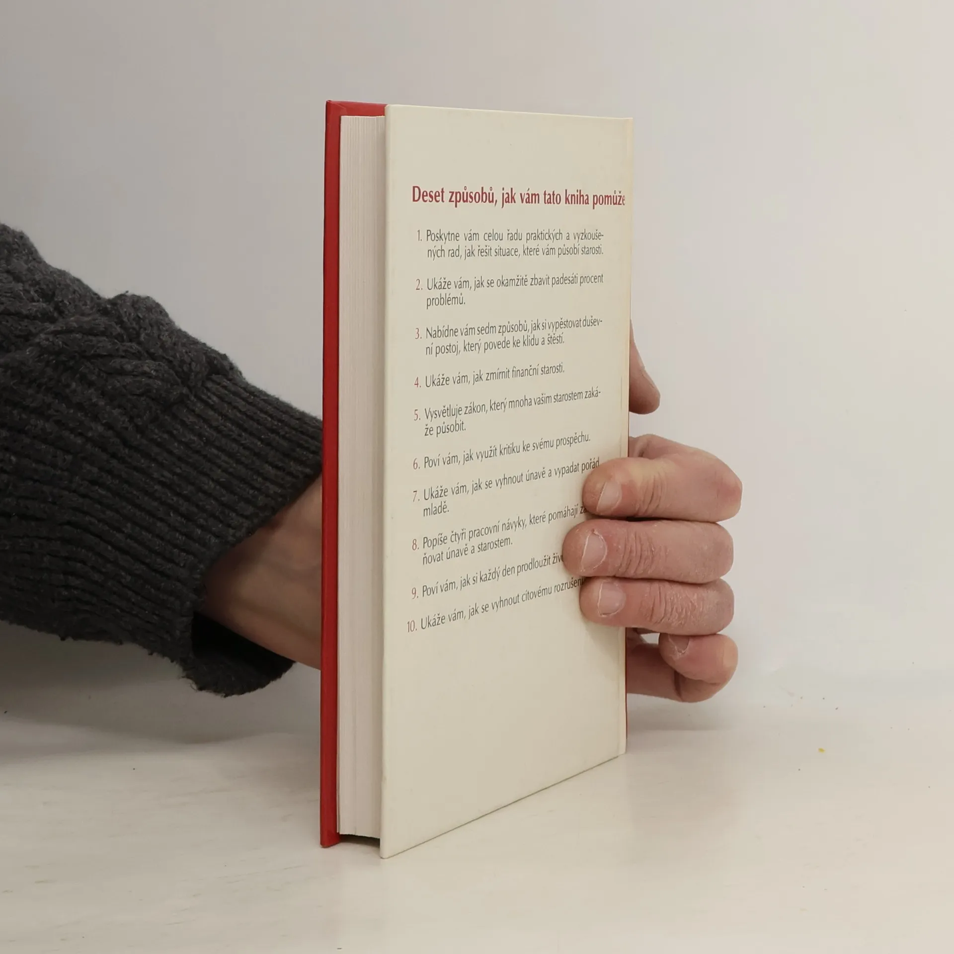 Deset způsobů, jak vám tato kniha pomůže: 1. Poskytne vám celou řadu praktických a vyzkoušených rad, jak řešit situace, které vám působí starosti. 2. Ukáže vám, jak se okamžitě zbavit padesáti procent problémů. 3. Nabídne vám sedm způsobů, jak si vypěstovat duševní postoj, který povede ke klidu a štěstí. 4. Ukáže Vám, jak zmírnit finanční starosti. 5. Vysvětluje zákon, který mnoha vašim starostem zakáže působit. 6. Poví vám, jak využít kritiku ke svému prospěchu. 7. Ukáže vám, jak se vyhnout únavě a vypadat pořád mladě. 8. Popíše čtyři pracovní návyky, které pomáhají zabraňovat únavě a starostem. 9. Poví vám, jak si každý den prodloužit život o hodinu. 10. Ukáže vám, jak se vyhnout citovému rozrušení. (méně textu)