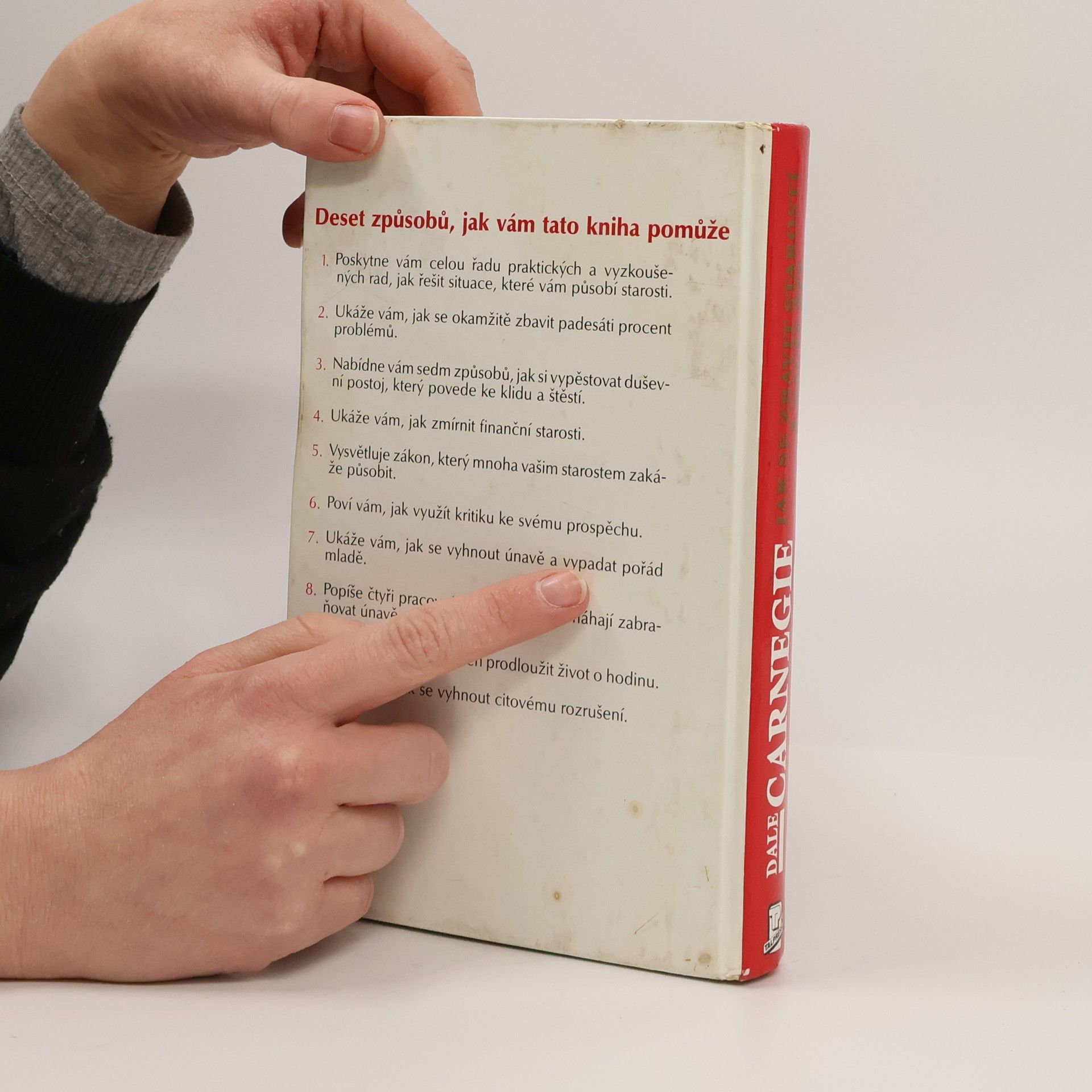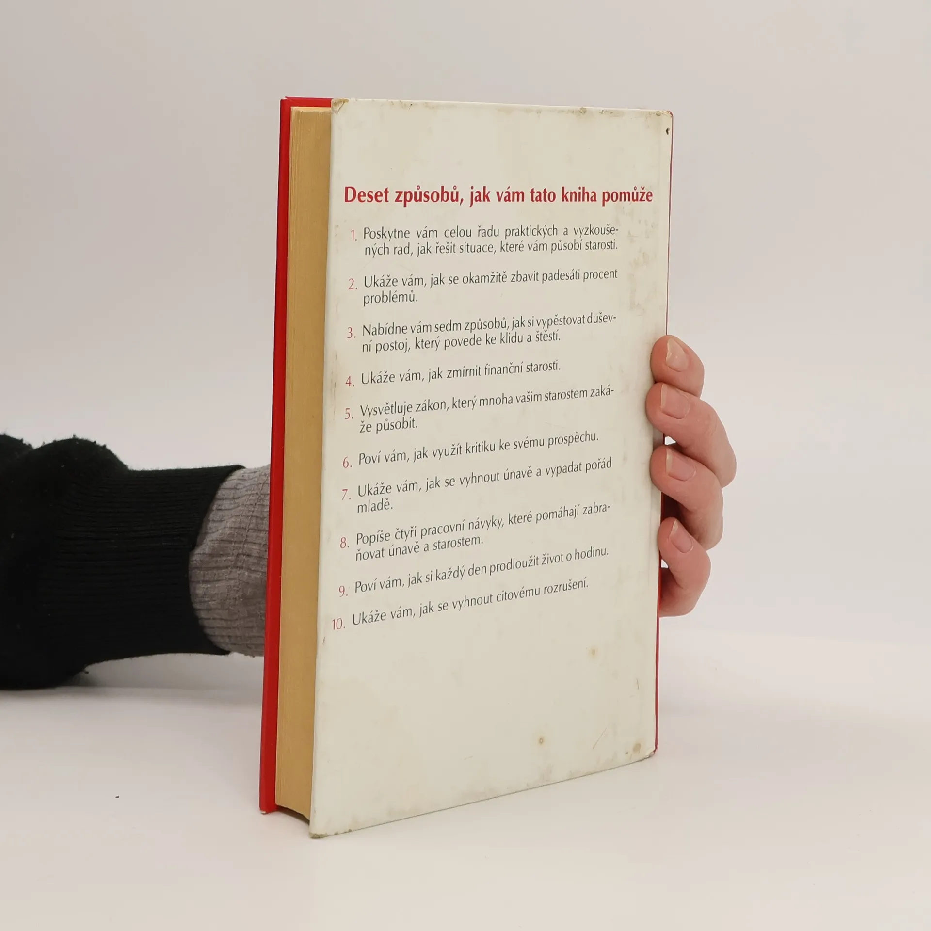 Deset způsobů, jak vám tato kniha pomůže: 1. Poskytne vám celou řadu praktických a vyzkoušených rad, jak řešit situace, které vám působí starosti. 2. Ukáže vám, jak se okamžitě zbavit padesáti procent problémů. 3. Nabídne vám sedm způsobů, jak si vypěstovat duševní postoj, který povede ke klidu a štěstí. 4. Ukáže Vám, jak zmírnit finanční starosti. 5. Vysvětluje zákon, který mnoha vašim starostem zakáže působit. 6. Poví vám, jak využít kritiku ke svému prospěchu. 7. Ukáže vám, jak se vyhnout únavě a vypadat pořád mladě. 8. Popíše čtyři pracovní návyky, které pomáhají zabraňovat únavě a starostem. 9. Poví vám, jak si každý den prodloužit život o hodinu. 10. Ukáže vám, jak se vyhnout citovému rozrušení. (méně textu)