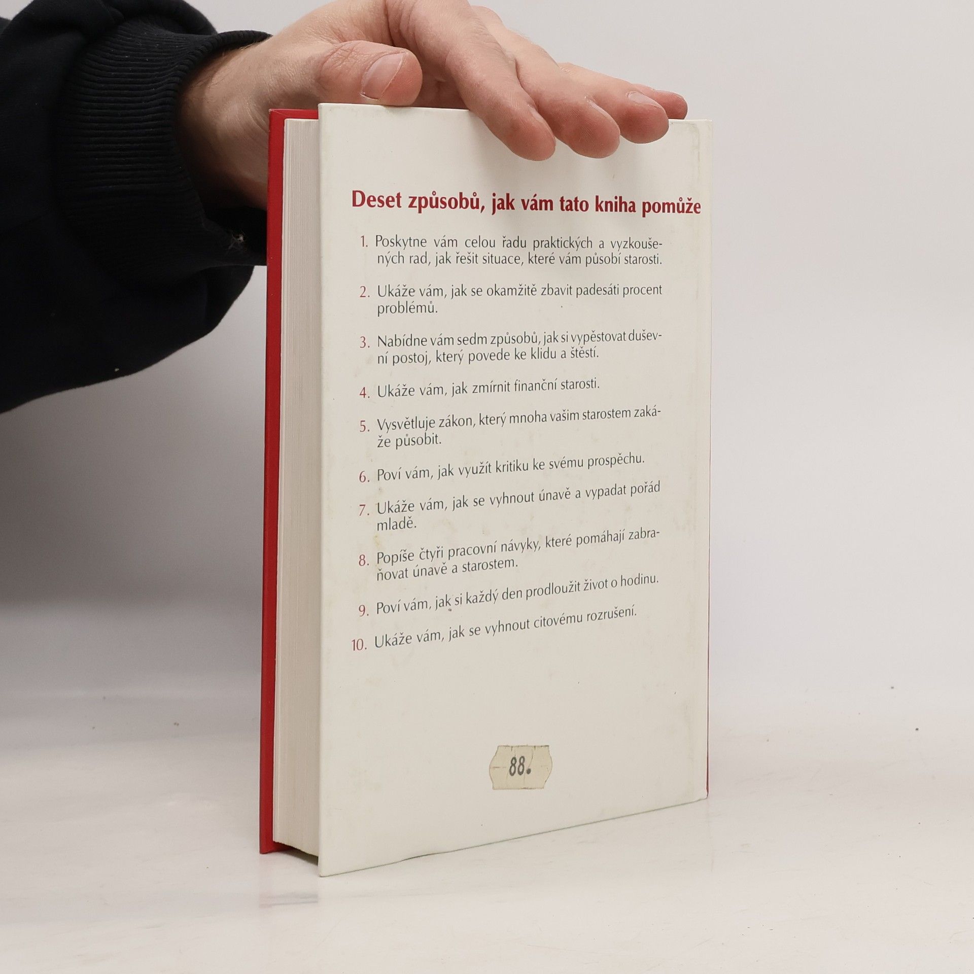 Deset způsobů, jak vám tato kniha pomůže: 1. Poskytne vám celou řadu praktických a vyzkoušených rad, jak řešit situace, které vám působí starosti. 2. Ukáže vám, jak se okamžitě zbavit padesáti procent problémů. 3. Nabídne vám sedm způsobů, jak si vypěstovat duševní postoj, který povede ke klidu a štěstí. 4. Ukáže Vám, jak zmírnit finanční starosti. 5. Vysvětluje zákon, který mnoha vašim starostem zakáže působit. 6. Poví vám, jak využít kritiku ke svému prospěchu. 7. Ukáže vám, jak se vyhnout únavě a vypadat pořád mladě. 8. Popíše čtyři pracovní návyky, které pomáhají zabraňovat únavě a starostem. 9. Poví vám, jak si každý den prodloužit život o hodinu. 10. Ukáže vám, jak se vyhnout citovému rozrušení. (méně textu)