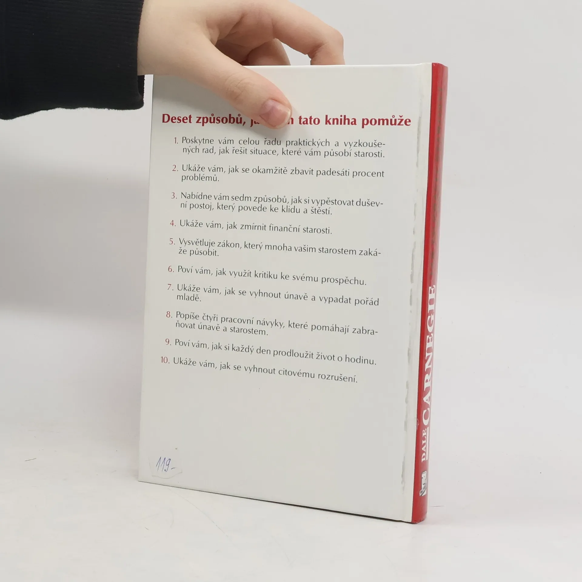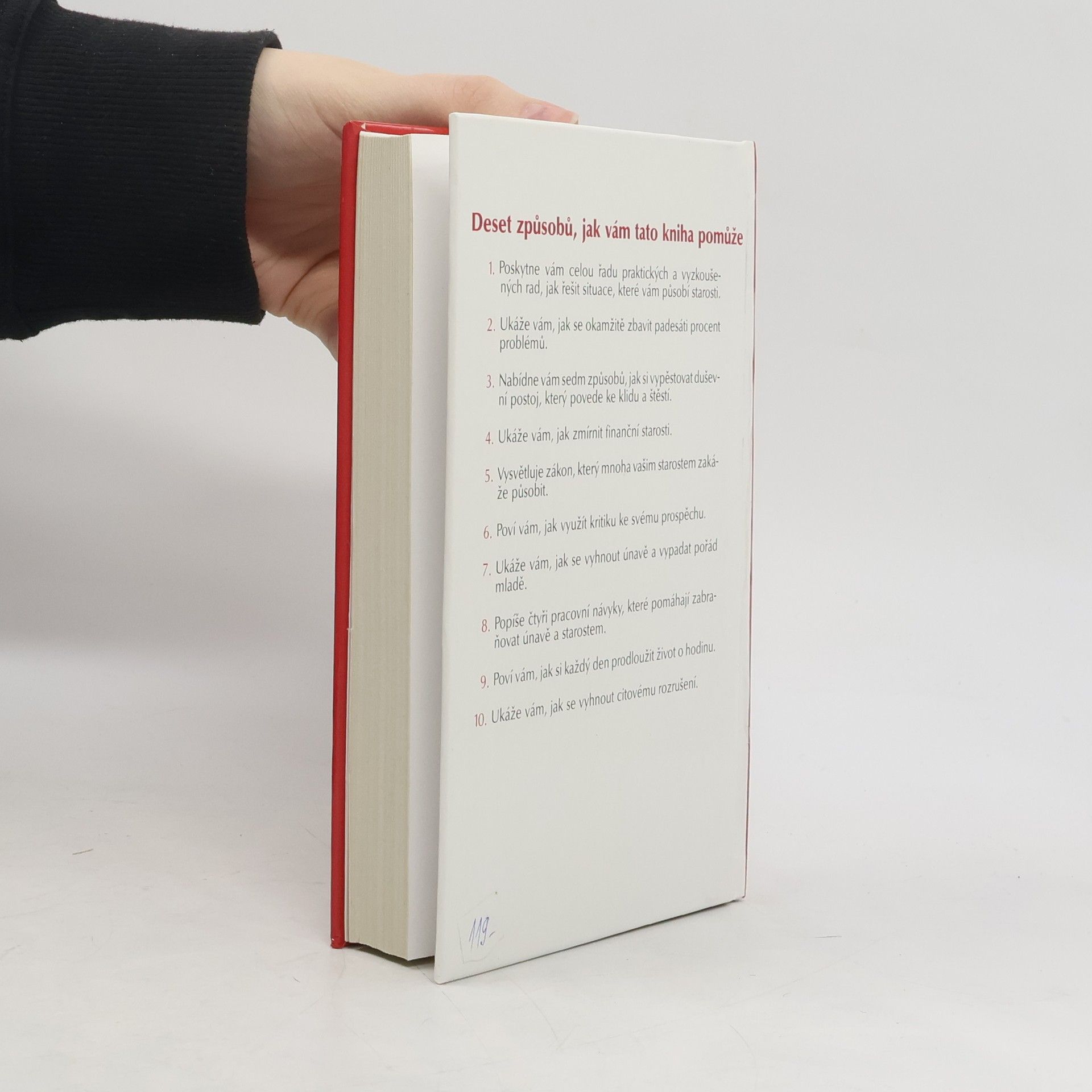 Deset způsobů, jak vám tato kniha pomůže: 1. Poskytne vám celou řadu praktických a vyzkoušených rad, jak řešit situace, které vám působí starosti. 2. Ukáže vám, jak se okamžitě zbavit padesáti procent problémů. 3. Nabídne vám sedm způsobů, jak si vypěstovat duševní postoj, který povede ke klidu a štěstí. 4. Ukáže Vám, jak zmírnit finanční starosti. 5. Vysvětluje zákon, který mnoha vašim starostem zakáže působit. 6. Poví vám, jak využít kritiku ke svému prospěchu. 7. Ukáže vám, jak se vyhnout únavě a vypadat pořád mladě. 8. Popíše čtyři pracovní návyky, které pomáhají zabraňovat únavě a starostem. 9. Poví vám, jak si každý den prodloužit život o hodinu. 10. Ukáže vám, jak se vyhnout citovému rozrušení. (méně textu)