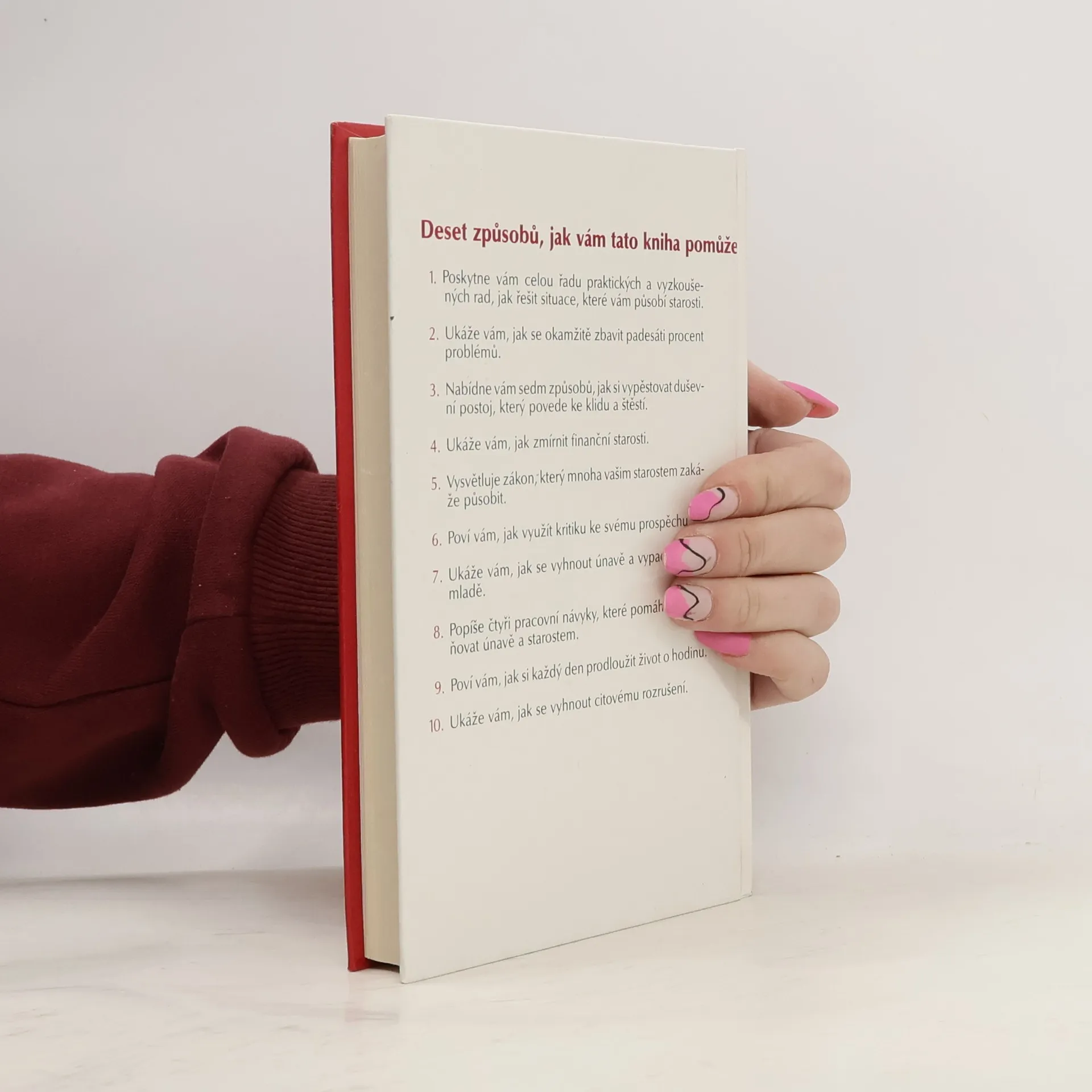 Deset způsobů, jak vám tato kniha pomůže: 1. Poskytne vám celou řadu praktických a vyzkoušených rad, jak řešit situace, které vám působí starosti. 2. Ukáže vám, jak se okamžitě zbavit padesáti procent problémů. 3. Nabídne vám sedm způsobů, jak si vypěstovat duševní postoj, který povede ke klidu a štěstí. 4. Ukáže Vám, jak zmírnit finanční starosti. 5. Vysvětluje zákon, který mnoha vašim starostem zakáže působit. 6. Poví vám, jak využít kritiku ke svému prospěchu. 7. Ukáže vám, jak se vyhnout únavě a vypadat pořád mladě. 8. Popíše čtyři pracovní návyky, které pomáhají zabraňovat únavě a starostem. 9. Poví vám, jak si každý den prodloužit život o hodinu. 10. Ukáže vám, jak se vyhnout citovému rozrušení. (méně textu)