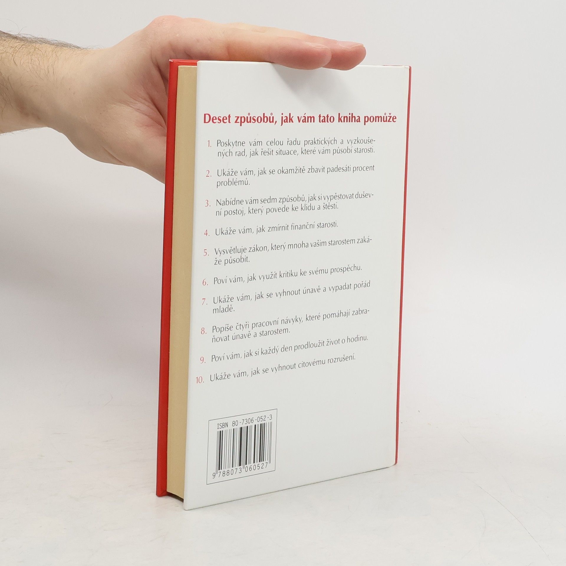 Deset způsobů, jak vám tato kniha pomůže: 1. Poskytne vám celou řadu praktických a vyzkoušených rad, jak řešit situace, které vám působí starosti. 2. Ukáže vám, jak se okamžitě zbavit padesáti procent problémů. 3. Nabídne vám sedm způsobů, jak si vypěstovat duševní postoj, který povede ke klidu a štěstí. 4. Ukáže Vám, jak zmírnit finanční starosti. 5. Vysvětluje zákon, který mnoha vašim starostem zakáže působit. 6. Poví vám, jak využít kritiku ke svému prospěchu. 7. Ukáže vám, jak se vyhnout únavě a vypadat pořád mladě. 8. Popíše čtyři pracovní návyky, které pomáhají zabraňovat únavě a starostem. 9. Poví vám, jak si každý den prodloužit život o hodinu. 10. Ukáže vám, jak se vyhnout citovému rozrušení.