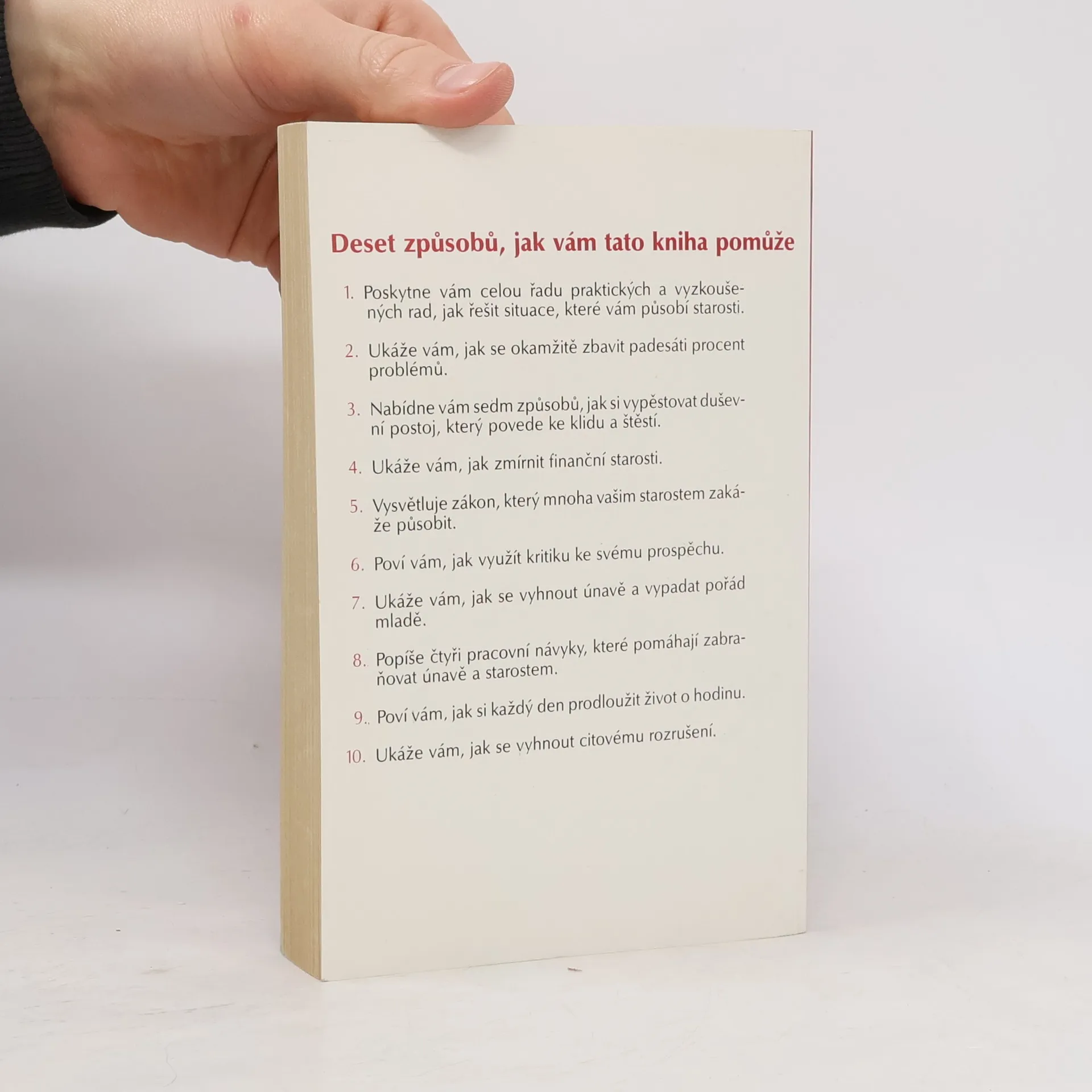 Deset způsobů, jak vám tato kniha pomůže: 1. Poskytne vám celou řadu praktických a vyzkoušených rad, jak řešit situace, které vám působí starosti. 2. Ukáže vám, jak se okamžitě zbavit padesáti procent problémů. 3. Nabídne vám sedm způsobů, jak si vypěstovat duševní postoj, který povede ke klidu a štěstí. 4. Ukáže Vám, jak zmírnit finanční starosti. 5. Vysvětluje zákon, který mnoha vašim starostem zakáže působit. 6. Poví vám, jak využít kritiku ke svému prospěchu. 7. Ukáže vám, jak se vyhnout únavě a vypadat pořád mladě. 8. Popíše čtyři pracovní návyky, které pomáhají zabraňovat únavě a starostem. 9. Poví vám, jak si každý den prodloužit život o hodinu. 10. Ukáže vám, jak se vyhnout citovému rozrušení. (méně textu)