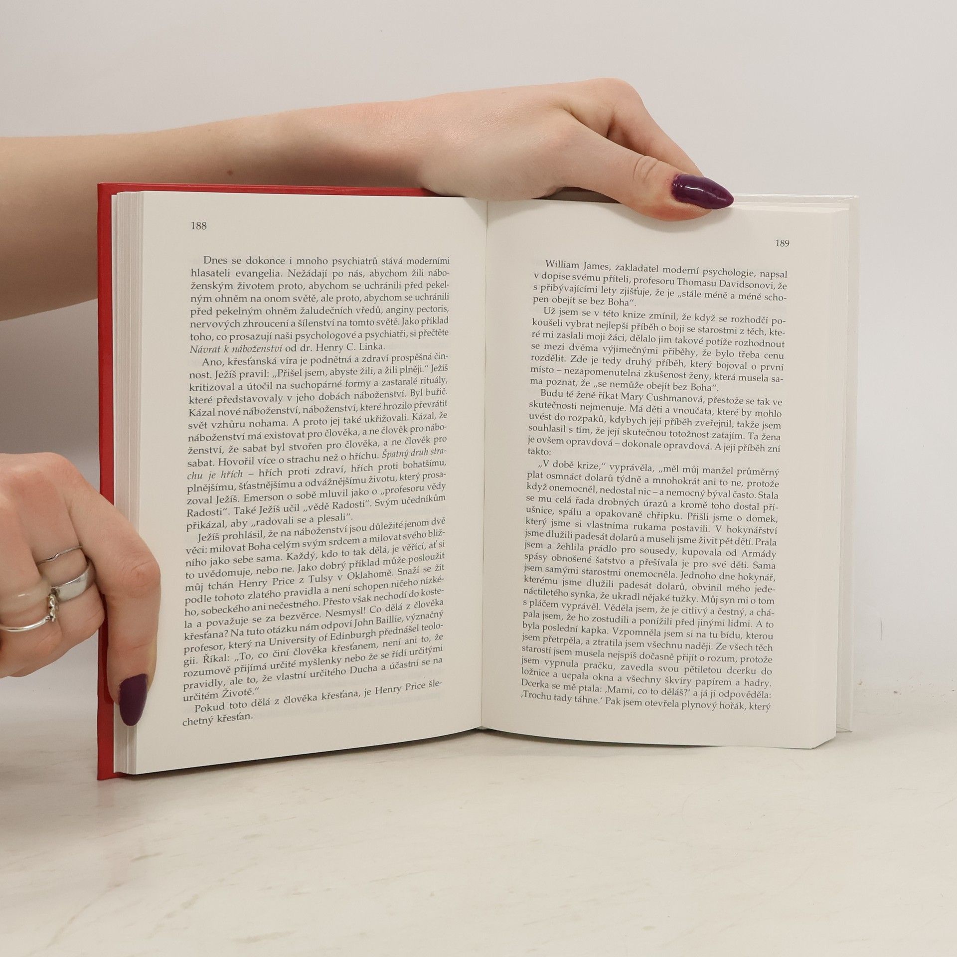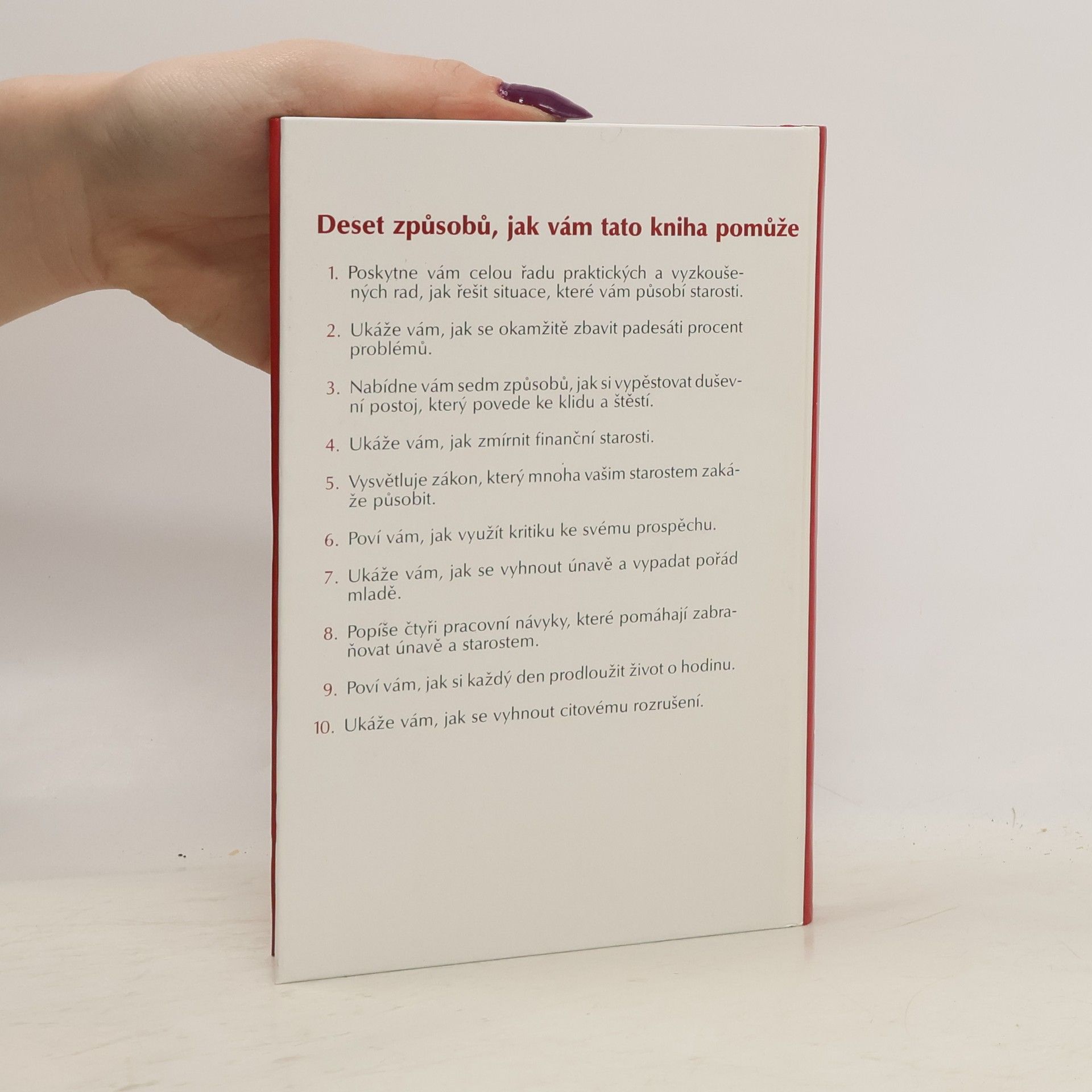 Deset způsobů, jak vám tato kniha pomůže: 1. Poskytne vám celou řadu praktických a vyzkoušených rad, jak řešit situace, které vám působí starosti. 2. Ukáže vám, jak se okamžitě zbavit padesáti procent problémů. 3. Nabídne vám sedm způsobů, jak si vypěstovat duševní postoj, který povede ke klidu a štěstí. 4. Ukáže Vám, jak zmírnit finanční starosti. 5. Vysvětluje zákon, který mnoha vašim starostem zakáže působit. 6. Poví vám, jak využít kritiku ke svému prospěchu. 7. Ukáže vám, jak se vyhnout únavě a vypadat pořád mladě. 8. Popíše čtyři pracovní návyky, které pomáhají zabraňovat únavě a starostem. 9. Poví vám, jak si každý den prodloužit život o hodinu. 10. Ukáže vám, jak se vyhnout citovému rozrušení. (méně textu)