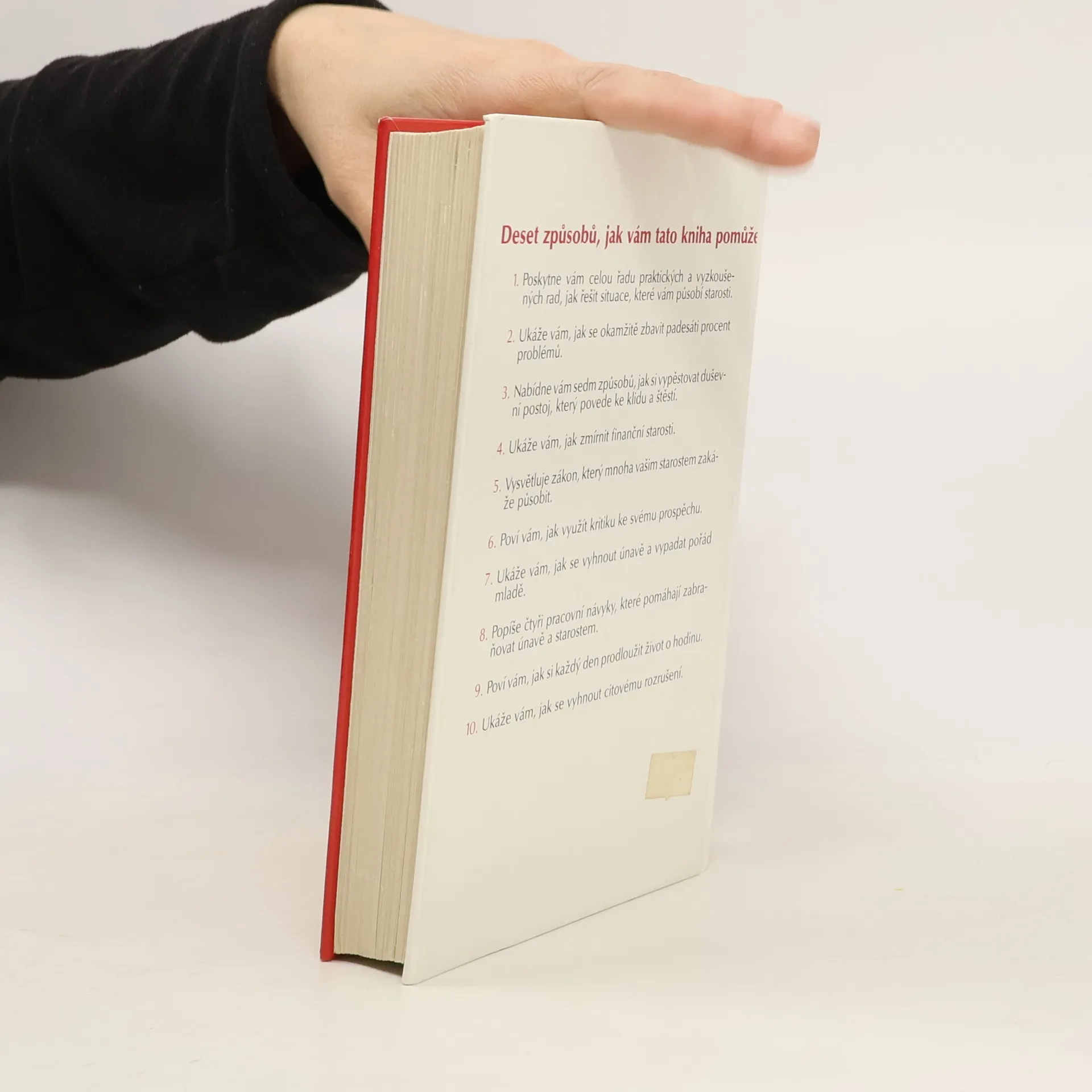 Deset způsobů, jak vám tato kniha pomůže: 1. Poskytne vám celou řadu praktických a vyzkoušených rad, jak řešit situace, které vám působí starosti. 2. Ukáže vám, jak se okamžitě zbavit padesáti procent problémů. 3. Nabídne vám sedm způsobů, jak si vypěstovat duševní postoj, který povede ke klidu a štěstí. 4. Ukáže Vám, jak zmírnit finanční starosti. 5. Vysvětluje zákon, který mnoha vašim starostem zakáže působit. 6. Poví vám, jak využít kritiku ke svému prospěchu. 7. Ukáže vám, jak se vyhnout únavě a vypadat pořád mladě. 8. Popíše čtyři pracovní návyky, které pomáhají zabraňovat únavě a starostem. 9. Poví vám, jak si každý den prodloužit život o hodinu. 10. Ukáže vám, jak se vyhnout citovému rozrušení. (méně textu)